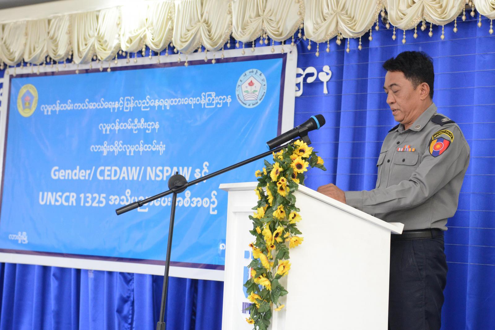 အခမ်းအနားသို့ ခရိုင်အမျိုးသမီးကော်မတီဥက္ကဋ္ဌ (ကိုယ်စား) လားရှိုးခရိုင်၊ ဒုတိယခရိုင် ရဲတပ်ဖွဲ့မှူး ရဲမှူးဝင်းသိန်းတက်ရောက်၍ အဖွင့်အမှာစကားပြောကြားရာ “ ကမ္ဘာလုံးဆိုင်ရာ စာရင်းများအရ လူ (၃) ဦးလျှင် (၁) ဦးနှုန်းမှာ ရုပ်ပိုင်းဆိုင်ရာလိင်ပိုင်းဆိုင်ရာနှင့် အိမ်တွင်းအကြမ်းဖက်ခံနေရကြောင်း၊ အမျိုးသမီးများ ဖွံ့ဖြိုးတိုးတက်ရေးဆိုင်ရာ လုပ်ငန်းယန္တရားဖြစ်သည့် မြန်မာနိုင်ငံလုံးဆိုင်ရာ အမျိုးသမီးကော်မတီကို နိုင်ငံတော်အစိုးရ၏ မူဝါဒများနှင့်အညီ ဆက်စပ်ဝန်ကြီးဌာနများအပြင် အမျိုးသမီးအရေးကို တက်ကြွစွာဆောင်ရွက်နေသော အရပ်ဘက်လူမှုရေးအဖွဲ့အစည်းများဖြင့် အသစ်ပြန်လည်ဖွဲ့စည်းခဲ့ပြီးဖြစ်ပါကြောင်း၊ အမျိုးသမီးများ ဖွံ့ဖြိုးတိုးတက်ရေးဆိုင်ရာ အမျိုးသားအဆင့် မဟာဗျူဟာစီမံကိန်း (၂၀၁၃-၂၀၂၂) ကိုအဓိက ဦးစားပေး လုပ်ငန်းနယ်ပယ် (၁၂) ရပ်နှင့် ရေးဆွဲထားရှိရာ အမျိုးသမီးများအပေါ် အကြမ်းဖက်မှုနှင့်စပ်လျဉ်းသည့် လုပ်ငန်းနယ်ပယ်ပါဝင်ပြီး အမျိုးသမီးများအပေါ် အကြမ်းဖက်မှုပပျောက်ရေးကို ရှေးရှုသော ဥပဒေများ၊ လုပ်ထုံးလုပ်နည်းများနှင့် စနစ်များကို တိုးမြှင့်အားပေးဆောင်ရွက်သွားရန်ဆိုသည့် ရည်ရွယ်ချက်များပါရှိကြောင်း” ပြောကြားသည်။