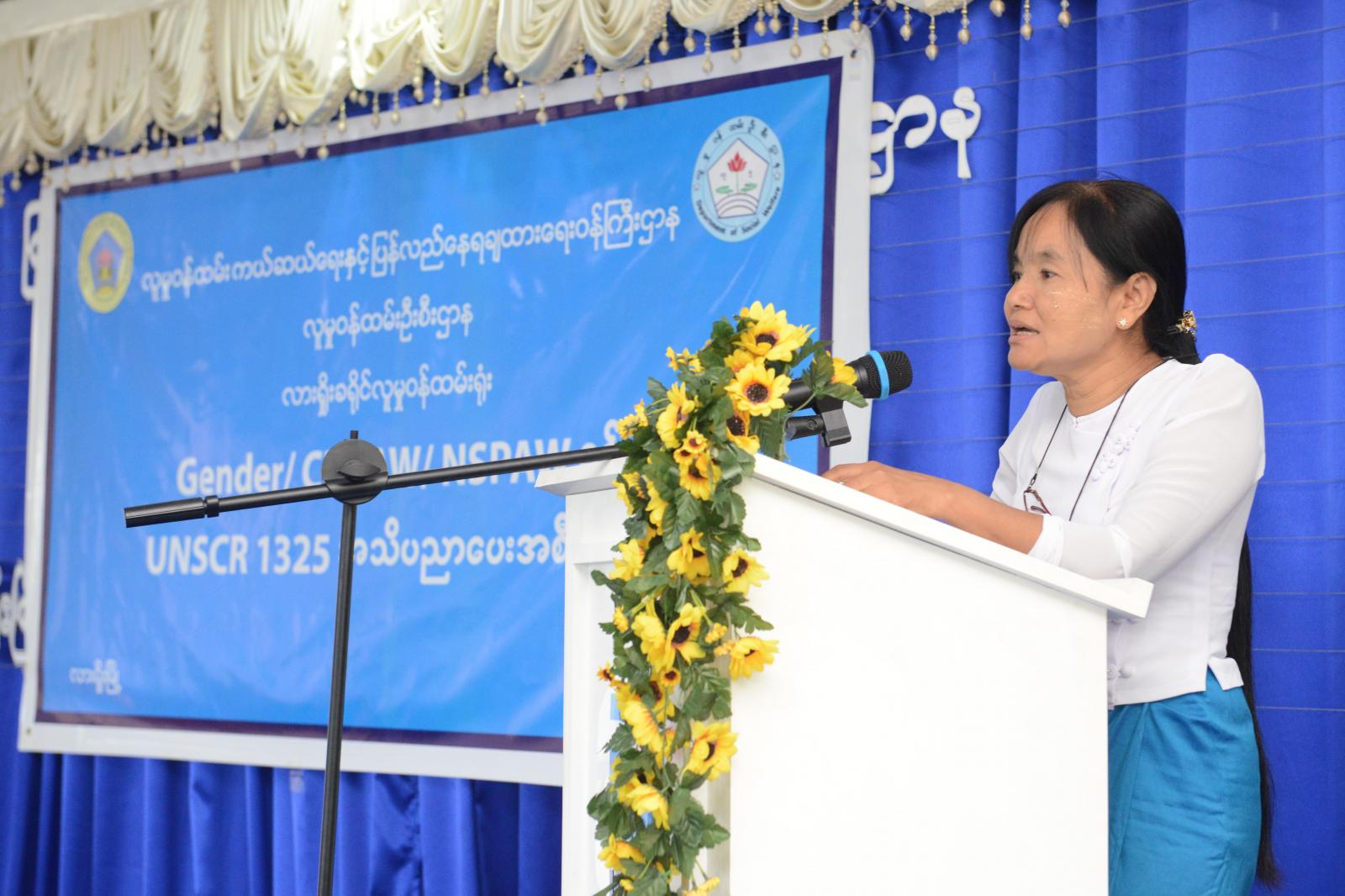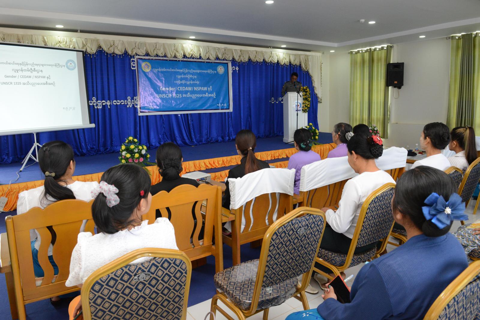 ယင်းနောက် ခရိုင်အမျိုးသမီးကော်မတီအတွင်းရေးမှူး၊ လားရှိုးခရိုင်၊ လူမှုဝန်ထမ်းရုံးမှ ဒုတိယညွှန်ကြားရေးမှူး ဒေါ်အေးအေးဝင်းက Gender, CEDAW, NSPAW နှင့် UNSCR (1325) အသိပညာပေးလုပ်ငန်း ဆောင်ရွက်ချက်များနှင့်ပတ်သက်၍ ရှင်းလင်းပြောကြားသည်။