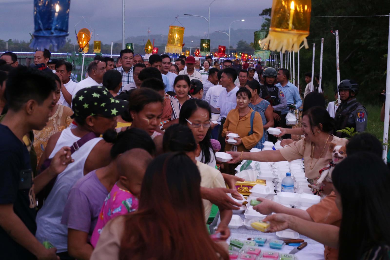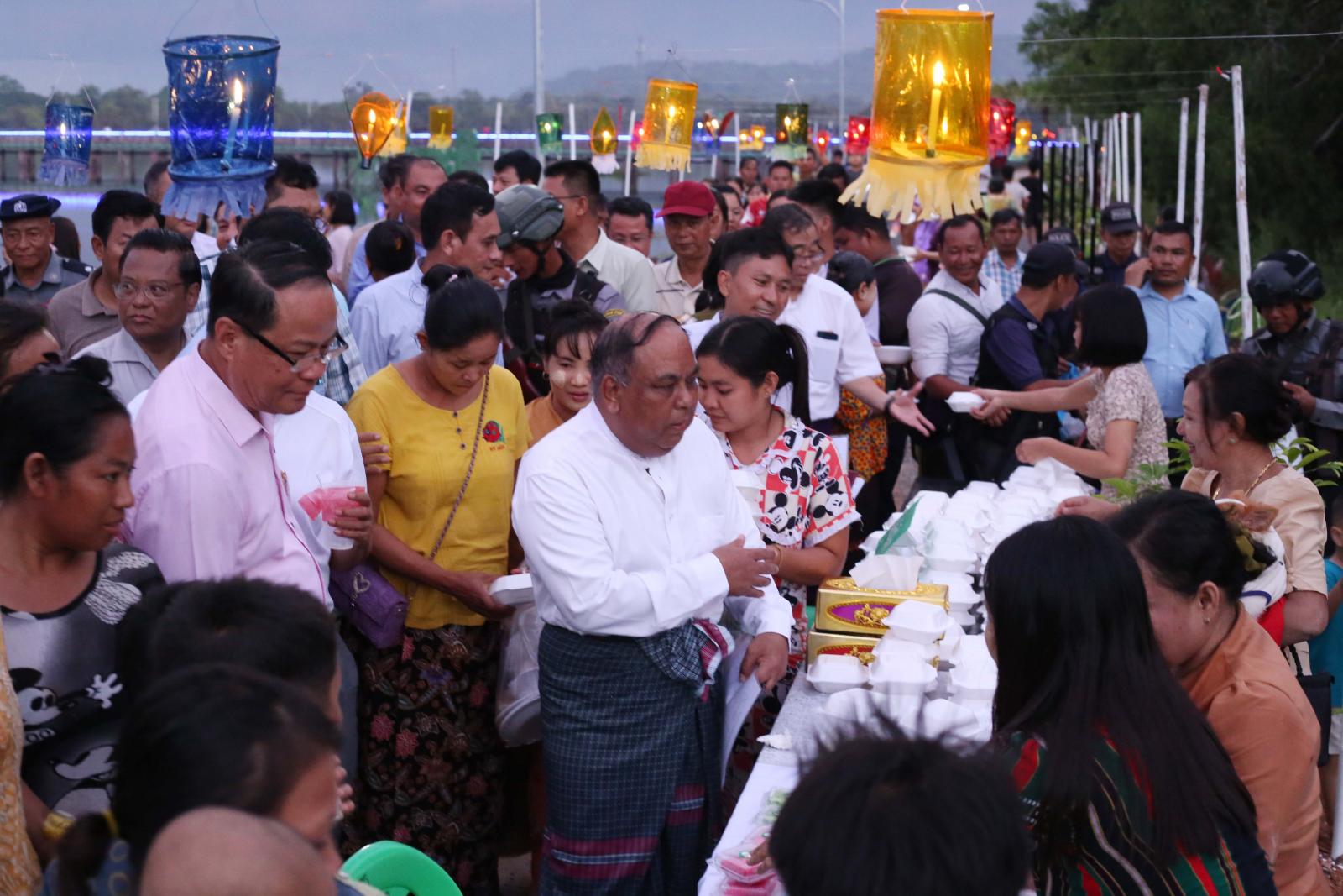 ကရင်ပြည်နယ် စည်ပင်သာယာရေးအဖွဲ့မှ ဦးစီး၍ သီတင်းကျွတ်လပြည့်မီးပုံး (၁၀၀၀) ထွန်းညှိပူဇော်ထားသော ဦးပေါက်လမ်းတွင် ဌာနဆိုင်ရာများနှင့် စေတနာရှင်၊ အလှူရှင်များက လက်ဖက်၊ ရေခဲမုန့်၊ ကြာဇံကြော်၊ အကြော်စုံ၊ ရွှေရင်အေး၊ မြန်မာမုန့်အမျိုးမျိုး၊ အအေးနှင့် အချိုရည်အမျိုးမျိုး၊ ဒေသထွက်အစားအစာများဖြင့် တည်ခင်းဧည့်ခံခဲ့ရာ ပြည်နယ်ဝန်ကြီးချုပ်၊ ပြည်နယ်တရားလွှတ်တော် တရားသူကြီးချုပ်၊ ပြည်နယ်အစိုးရအဖွဲ့ဝင်များနှင့် ၎င်းတို့၏ဇနီးများက ဘားအံမြို့ပေါ်ရှိ ရပ်ကွက်/ကျေးရွာများ၊ ပတ်ဝန်းကျင်ဒေသများရှိ တိုင်းရင်းသားပြည်သူများ၊ ခရီးသွားဧည့်သည်များနှင့်အတူ တည်ခင်းထားသော အစားအစာများအား အတူတကွသုံးဆောင်၍ အေးချမ်းပျော်ရွှင်စွာ ပါဝင်ဆင်နွဲခဲ့ကြကြောင်း သတင်းရရှိသည်။