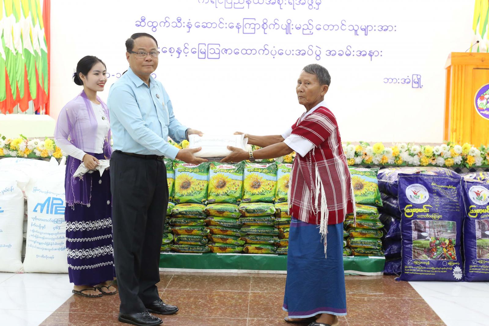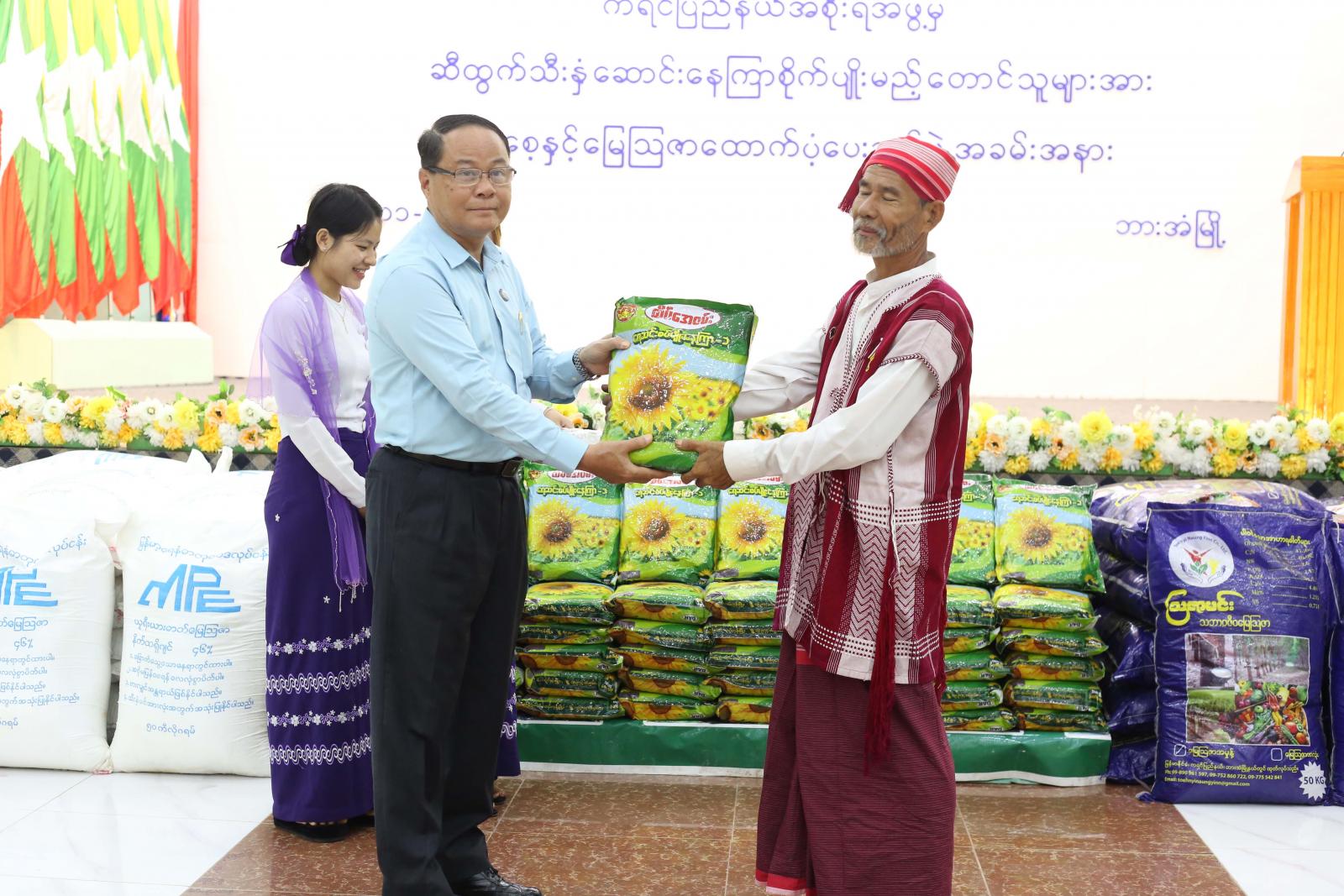 ဆက်လက်၍ ကရင်ပြည်နယ်စိုက်ပျိုးရေးဦးစီးဌာနမှ ဆီထွက်သီးနှံဆောင်းနေကြာစိုက်ပျိုးမည့် တောင်သူများအား မျိုးစေ့နှင့်မြေဩဇာထောက်ပံ့ပေးအပ်ပွဲကို နိုဝင်ဘာလ ၁ ရက်နေ့ နံနက် ၉ နာရီခွဲခန့်က ဘားအံမြို့၊ ဇွဲကပင်ခန်းမ၌ကျင်းပခဲ့သည်။