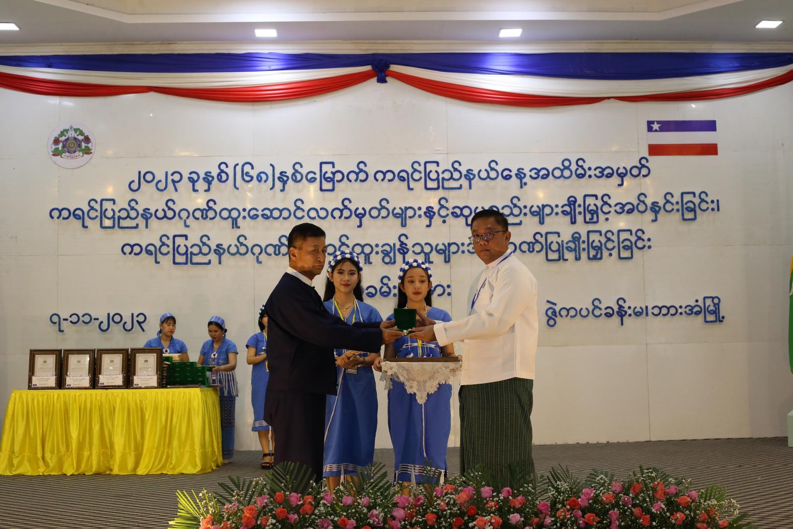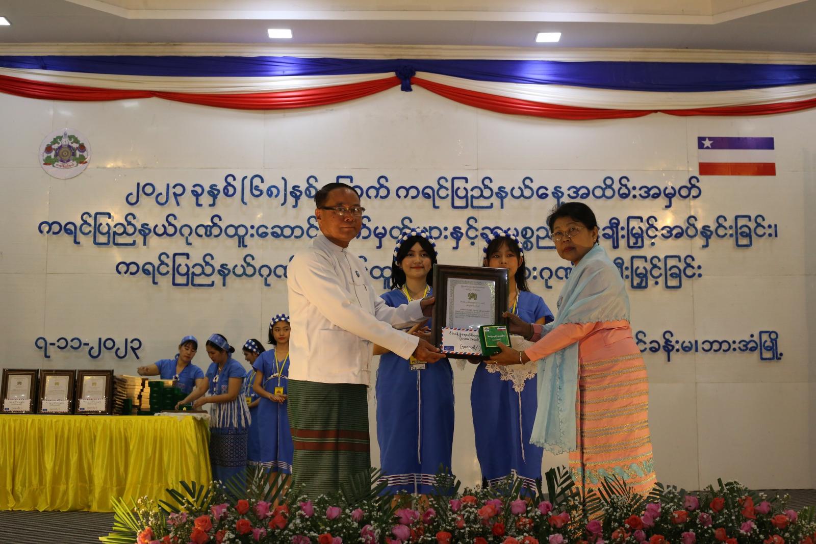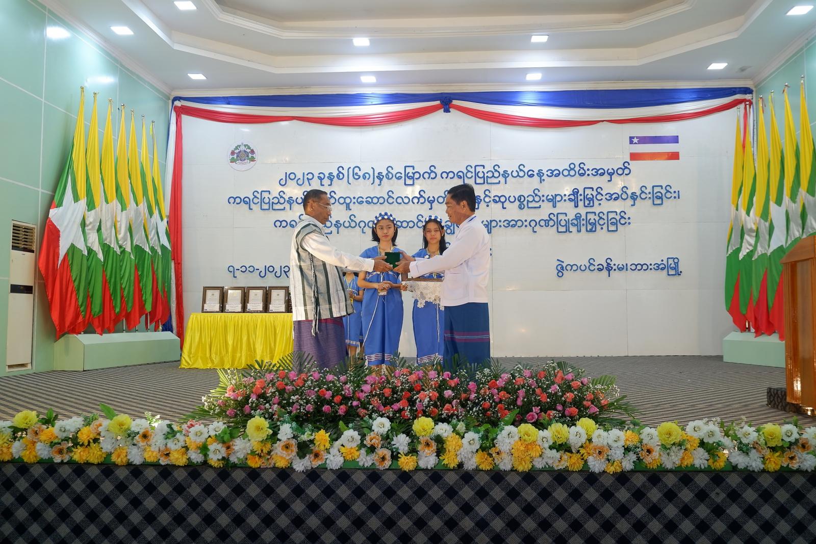 ကရင်ပြည်နယ်ဂုဏ်ထူးဆောင်လက်မှတ်များနှင့် ဆုပစ္စည်းများချီးမြှင့်အပ်နှင်းခြင်း၊ ပြည်နယ်ဂုဏ်ဆောင် ထူးချွန်သူများအား ဂုဏ်ပြုချီးမြှင့်အပ်နှင်းခြင်းတွင် စီမံခန့်ခွဲရေးဆိုင်ရာထူးချွန်ဆု (ပထမအဆင့်)ရရှိသူ (၃၅)ဦး၊ ဒုတိယအဆင့်ရရှိသူ (၁)ဦး၊ တတိယအဆင့်ရရှိသူ(၆)ဦး၊ စက်မှုနှင့်နည်းပညာသုတေသနဆိုင်ရာ ထူးချွန်ဆု(ဒုတိယအဆင့်)ရရှိသူ(၁)ဦး၊ လူမှုဆိုင်ရာထူးချွန်ဆု (ပထမအဆင့်)ရရှိသူ(၃)ဦး၊ ဒုတိယအဆင့်ရရှိသူ (၂)ဦး၊ တတိယအဆင့်ရရှိသူ(၂၄)ဦး၊ တခြားပြည်နယ်ဂုဏ်ဆောင် ထူးချွန်ဆုရရှိသူ (၁၄၆)ဦး၊ ထူးချွန်ဆုရရှိသူ (၂၁၈)ဦးအတွက် စုစုပေါင်းငွေကျပ် ၅၄၄ သိန်းကျော် ဂုဏ်ပြုချီးမြှင့်ခဲ့ကြောင်း သိရှိရသည်။