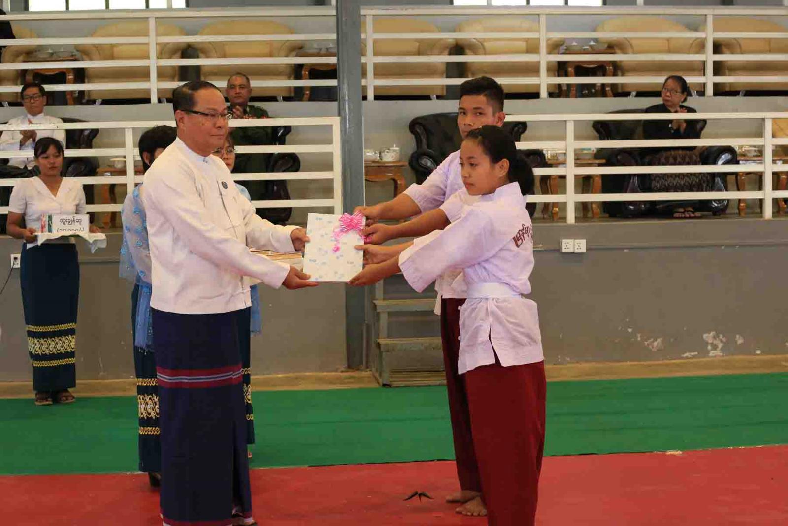 ထို့နောက် အခြေခံမြန်မာ့သိုင်းသင်တန်းဆင်း သင်တန်းသား/သင်တန်းသူများမှ အခြေခံမြန်မာ့သိုင်း ဗန်ဒို(၆၃)နည်းပညာကျင့်စဉ်များအနက် လက်နည်းစနစ်ဖြင့် ခုခံကာကွယ် တိုက်ခိုက်ခြင်း (၆)မျိုးအား သရုပ်ပြသရာ ပြည်နယ်ဝန်ကြီးချုပ်နှင့် တာဝန်ရှိသူများမှ ကြည့်ရှုအားပေးခဲ့ပြီး သင်တန်းဆင်းပွဲ အခမ်းအနား အပြီး၌ ပြည်နယ် ဝန်ကြီးချုပ်နှင့် တာဝန်ရှိသူများသည် သင်တန်းသား/သင်တန်းသူများအား ရင်းရင်းနှီးနှီး လိုက်လံနှုတ်ဆက်အားပေးခဲ့သည်။