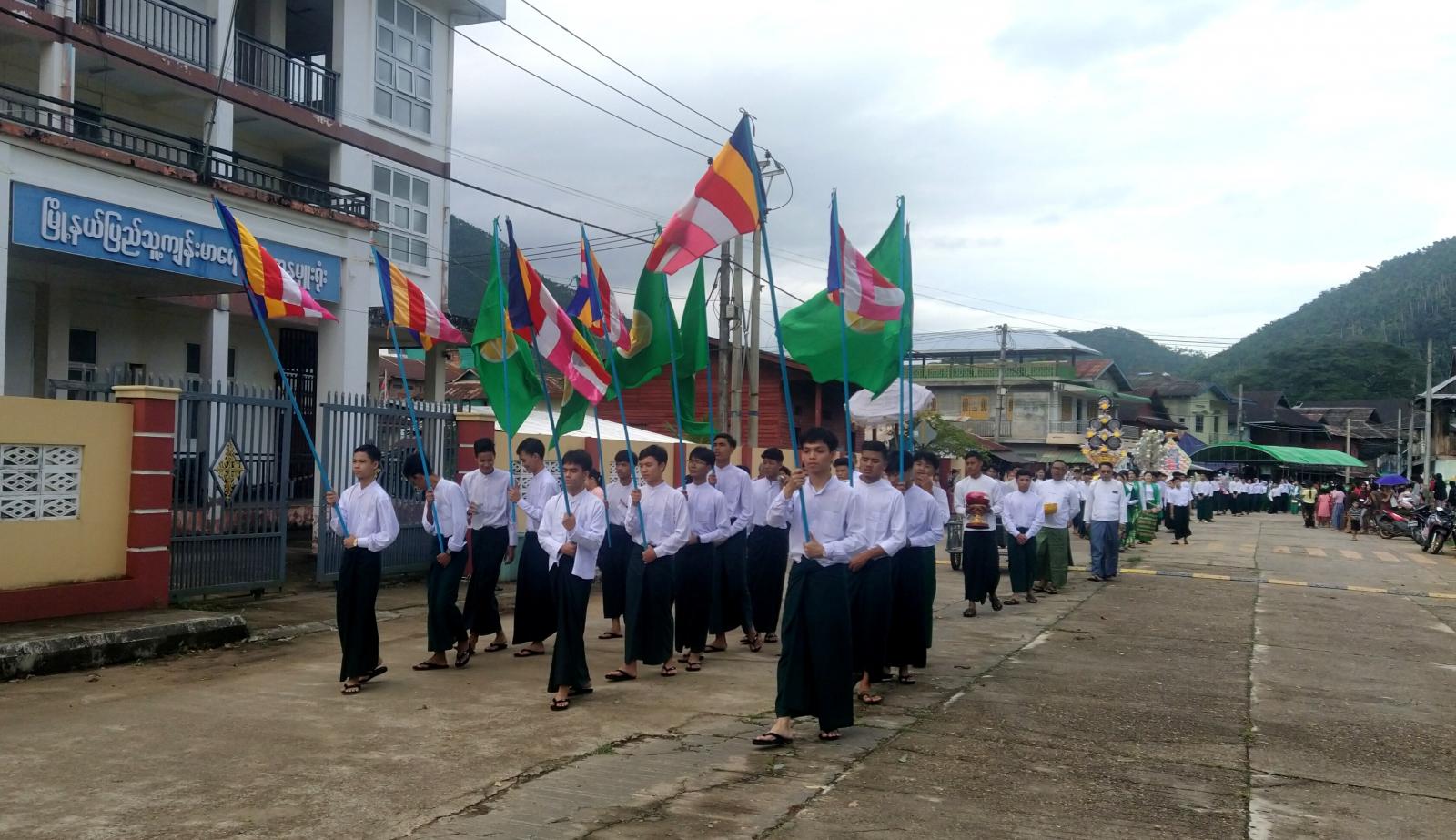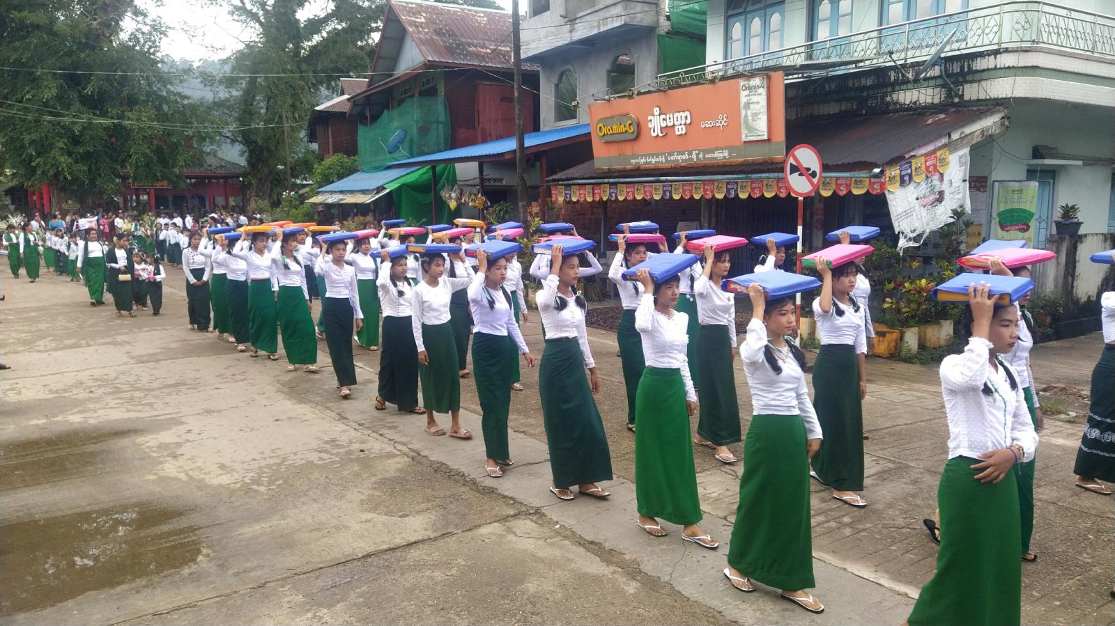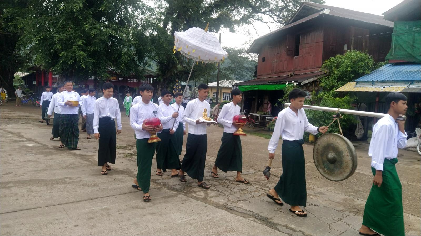 ဆရာ/မများမှ ဦးဆောင်ကြီးကြပ်လျက် ဆိုင်ကယ်အရှေ့ပြေးအဖွဲ့၊ အလံကိုင်အဖွဲ့၊ ကြေးစည်-မောင်း၊ အလှူခံအဖွဲ့၊ ကျက်သရေဆောင်လူကြီးများအဖွဲ့၊ ပဒေသာပင်များ၊ စည်တော်အကအဖွဲ့၊ ကထိန်သင်္ကန်းကိုင် နှင့်ကွမ်းတော်ကိုင်အဖွဲ့၊ ပန်းအိုးကြီးအဖွဲ့၊ ပုသိမ်ထီးအဖွဲ့၊ သင်္ကန်းရွက်အဖွဲ့၊ ပန်းအိုးကိုင်အဖွဲ့နှင့် ဗိုလ်အောင်ဒင်-မမြဝင်းအကအဖွဲ့များစသဖြင့် စနစ်တကျစီတန်းကာ ချောင်းကြီးရပ်ကွက်နှင့် ချောင်းငယ်ရပ်ကွက်အတွင်းရှိ လမ်းများအတိုင်းစည်ကားစွာ ပွဲစံလှည့်လည်ကြကြောင်း သိရသည်။