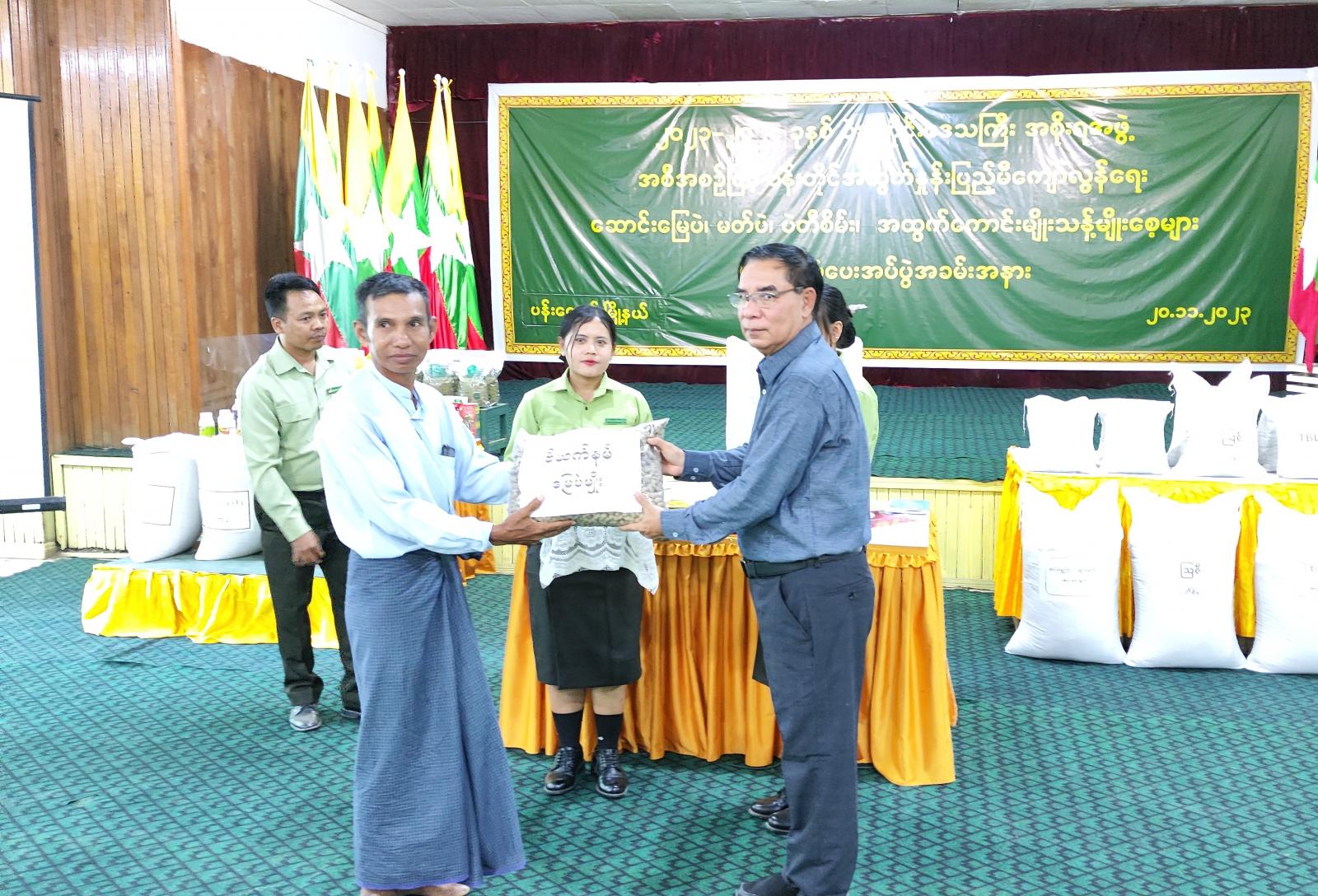 ရှေးဦးစွာ ပဲခူးတိုင်းဒေသကြီးအစိုးရအဖွဲ့ဝန်ကြီးချုပ် ဦးမျိုးဆွေဝင်းက ပန်းတိုင်သီးနှံ(၁၀)မျိုး အထွက်နှုန်းပြည့်မီကျော်လွန်ရေးအတွက် ကဏ္ဍအလိုက် ဝိုင်းဝန်းပူးပေါင်းကြိုးစားဆောင်ရွက်ကြရန် အမှာစကားပြောကြားပြီး ဝန်ကြီးချုပ်ဦးမျိုးဆွေဝင်း၊ ပဲခူးတိုင်းဒေသကြီးအစိုးရအဖွဲ့ လုံခြုံရေးနှင့်နယ်စပ်ရေးရာဝန်ကြီးဗိုလ်မှူးကြီးအောင်သောင်းထိုက်၊ ပဲခူးတိုင်းဒေသကြီး အစိုးရအဖွဲ့စီးပွားရေးရာဝန်ကြီးဦးတင်ဦးနှင့် တာဝန်ရှိသူများက အထွက်နှုန်းကောင်းသော ဗီယက်နမ်မြေပဲ မျိုးသန့်မျိုးစေ့များနှင့် ပဲတီစိမ်းမျိုး ရေဆင်း-၁၄၊ မတ်ပဲမျိုးသန့် TBL-9 မျိုးစေ့များကိုတောင်သူများထံ ပေးအပ်ခဲ့ကြောင်းသိရသည်။