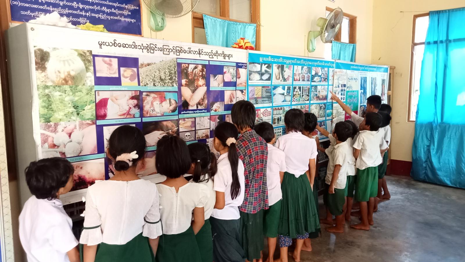 ထို့နောက် မူးယစ်ဆေးဝါးအန္တရာယ်နှင့် ပတ်သက်၍ အသိပညာပေး အကြောင်းအရာများကို အကျယ်တဝင့် သိရှိစေရေးအတွက် နံရံကပ်စာစောင်များ ပြသဆောင်ရွက်ထားမှုကို ကျောင်းသား/ သူကလေးငယ်များက စိတ်ဝင်စားစွာ ကြည့်ရှုလေ့လာမှတ်သားခဲ့ကြောင်း သိရသည်။