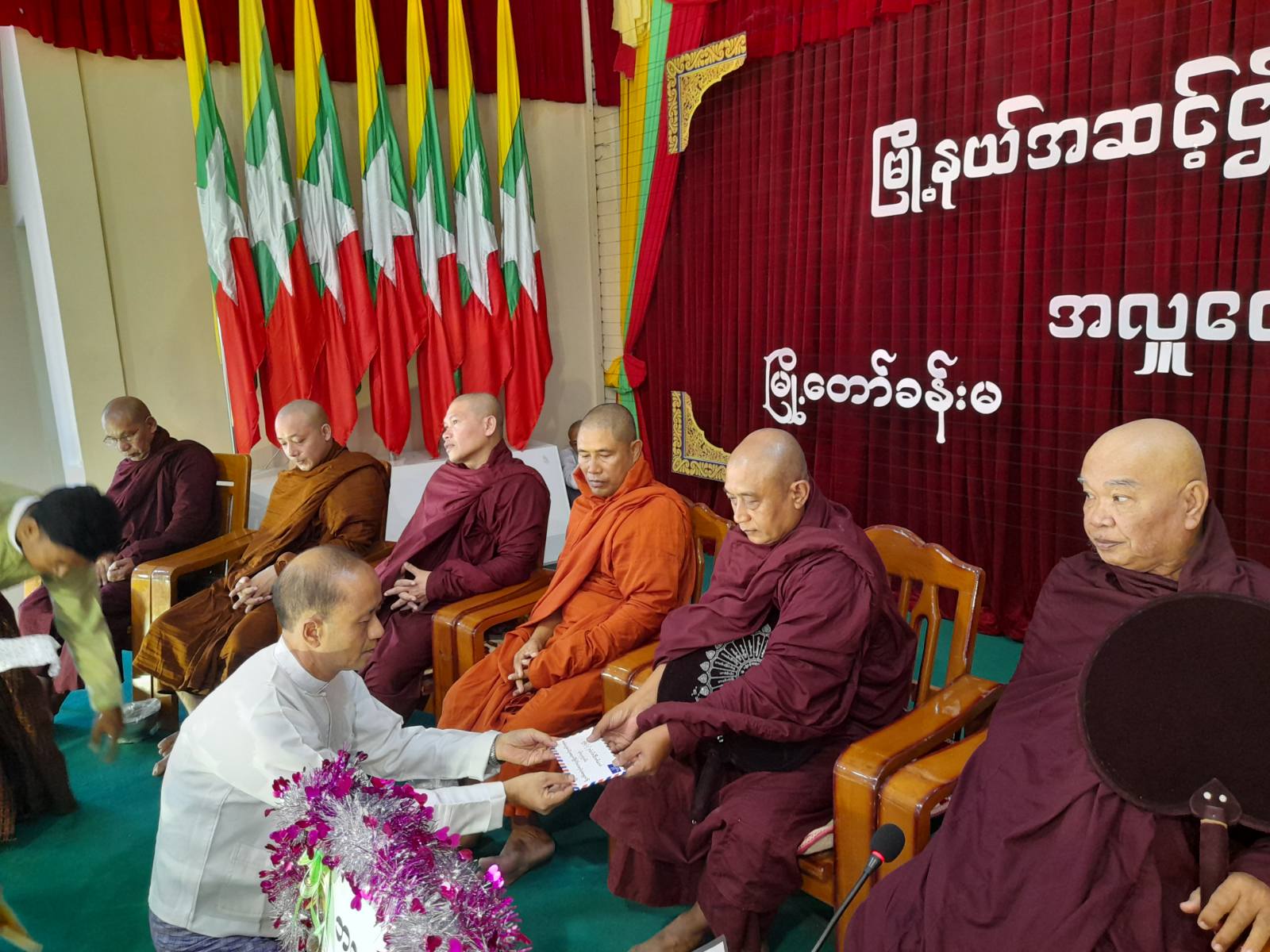 အခမ်းအနားတွင် တိုင်းဒေသကြီးသံဃာနာယကအဖွဲ့ဝင် ကျောက်မြောင်းတောင်သစ်ကျောင်းတိုက် ဆရာတော်ကြီး ဘဒ္ဒန္ဒအာစရထံမှ ငါးပါးသီလ ခံယူဆောက်တည်ကာ ဩဝါဒကထာခံယူခြင်း၊ ကြွရောက်လာသော ဆရာတော်သံဃာတော်အရှင်သူမြတ်များက ပရိတ်တရားတော်များ ရွတ်ဖတ်ချီးမြှင့်တော်မူပြီး မြို့နယ်စီမံအုပ်ချုပ်ရေးအဖွဲ့ဥက္ကဋ္ဌ ဦးမိုးထွေးဦးနှင့် တာဝန်ရှိသူများက ဆရာတော်သံဃာတော်အရှင်သူမြတ်များအား ကထိန်သင်္ကန်း၊ လှူဖွယ်ဝတ္ထုငွေများနှင့် ပစ္စည်းများဆက်ကပ်လှူဒါန်းခဲ့သည်။