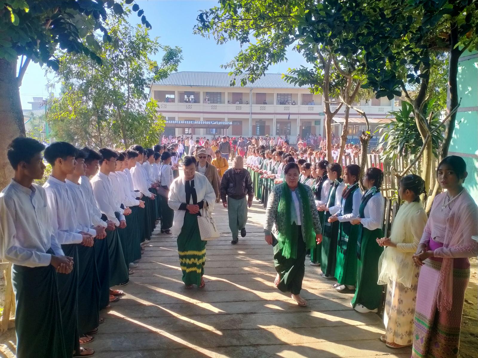 ရှေးဦးစွာအခမ်းအနားကို ဖဲကြိုးဖြတ်ဖွင့်လှစ်ခဲ့ကြပြီး ကျောင်းသား/ကျောင်းသူများက ဘင်ခရာ၊ ပန်းပွားအက၊ ရှမ်းရိုးရာအက၊ သွေးပူလေ့ကျင့်ခန်းများဖြင့် ဖျော်ဖြေဖွင့်လှစ်ပေးခဲ့ကြပြီး မြတ်သီရီခန်းမတွင် “ကြိုဆိုပါသည်စုံညီပွဲတော်”အဖွင့်သီချင်းဖြင့် အခမ်းအနားစတင်၍ မြို့နယ်ပညာရေးမှူး ဒေါ်နန်းခင်ထွေးရီက အမှာစကားပြောကြားပြီး ၊ ကျောင်းအုပ်ဆရာမကြီး ဒေါ်နန်းခင်မြင့်သန်းက ပညာရေးစုံညီပွဲတော် ကျင်းပရခြင်းနှင့်ပတ်သက်၍ ရှင်းလင်းပြောကြား ခဲ့သည်။