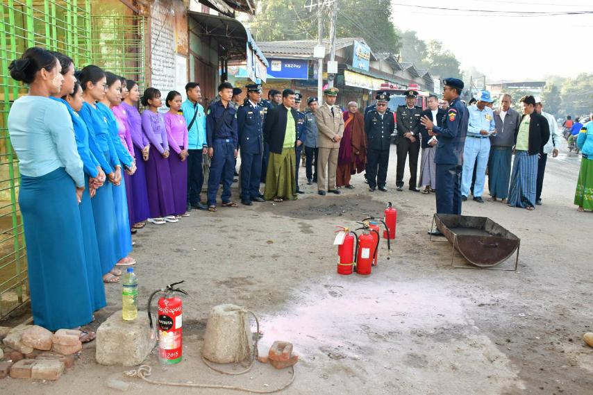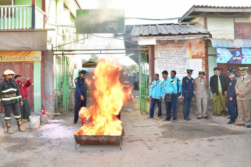 ထို့နောက် မြို့နယ်မီးသတ်ဦးစီးမှူးနှင့် တပ်ဖွဲ့ဝင်များက ဈေးမီးဘေးလုံခြုံရေး အရန်မီးသတ်တပ်ဖွဲ့ဝင်များနှင့် ပူးပေါင်း၍ ဖိတ်ကြားထား သည့် ညောင်ဦးခရိုင်စီမံအုပ်ချုပ်ရေးအဖွဲ့ အဖွဲ့ဝင်(၁) ဒုတိယဗိုလ်မှူးကြီးမျိုးခိုင်ဝင်း၊ ခရိုင်အဆင့်ဌာနဆိုင်ရာများ၊ညောင်ဦးမြို့နယ်စီမံအုပ်ချုပ်ရေးအဖွဲ့ ဥက္ကဋ္ဌ ဦးနန်းတင့်နှင့်မြို့နယ်စီမံအဖွဲ့ဝင်များ၊ မိခင်နှင့်ကလေးစောင့်ရှောက်ရေးအသင်း ဥက္ကဋ္ဌ ဒေါ်ဇာဇာဝင့်နှင့်အသင်းဝင်များ၊ အမျိုးသမီးရေးရာအဖွဲ့ဝင်များ၊ အဈေးသူဈေးသားများနှင့် ဈေးဝယ်လာပြည်သူများကို မီးသတ်ဆေးဘူးဖြင့် စနစ်တကျ ကိုင်တွယ်မီးငြှိမ်းသတ်နည်းများ၊ မီးငြှိမ်းသတ်ယာဉ်ဖြင့် ဇာတ်တိုက်လေ့ကျင့် သရုပ်ပြငြှိမ်းသတ်ခြင်းများကို ပညာပေးပြုလုပ်ဆောင်ရွက်ပြသရာ တက်ရောက်လာကြသူများက စိတ်ဝင်တစ်စား လေ့လာကြည့်ရှုခဲ့ကြောင်း သိရသည်။