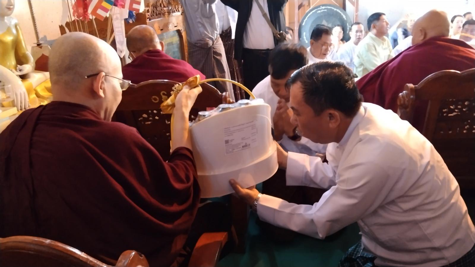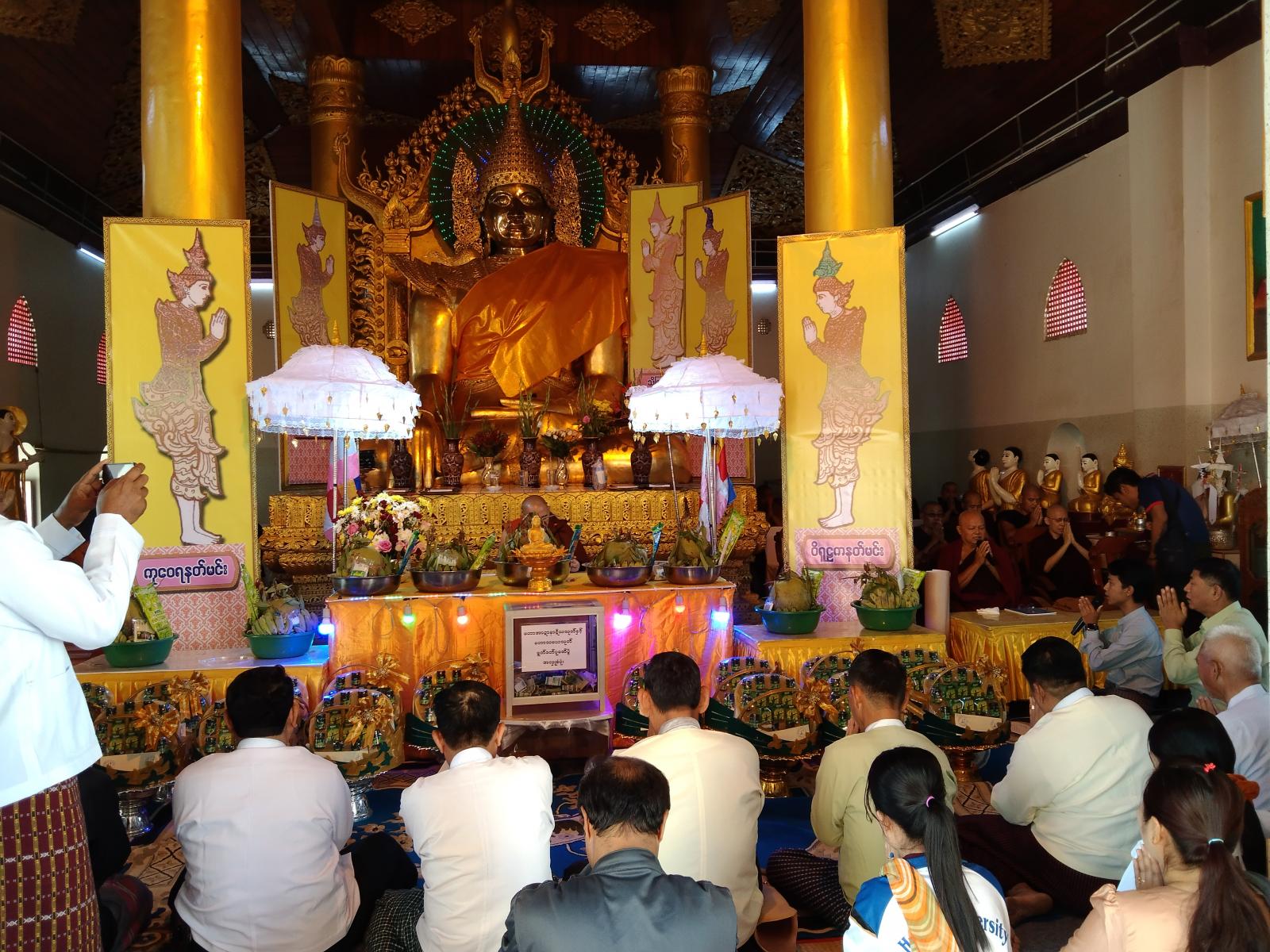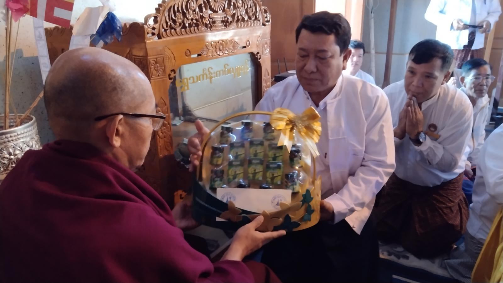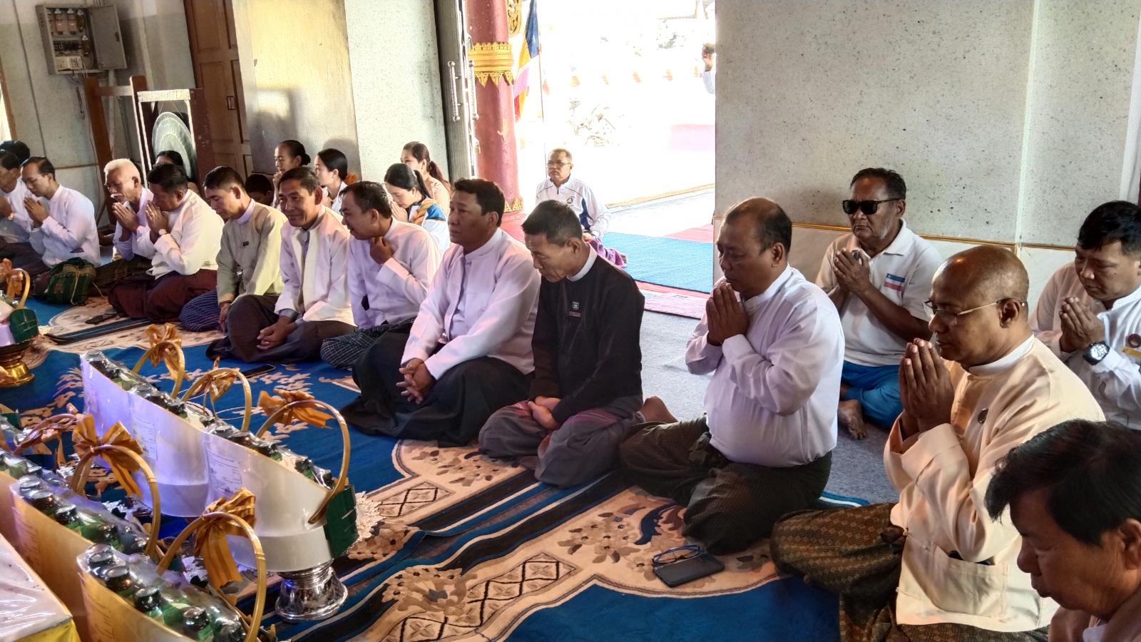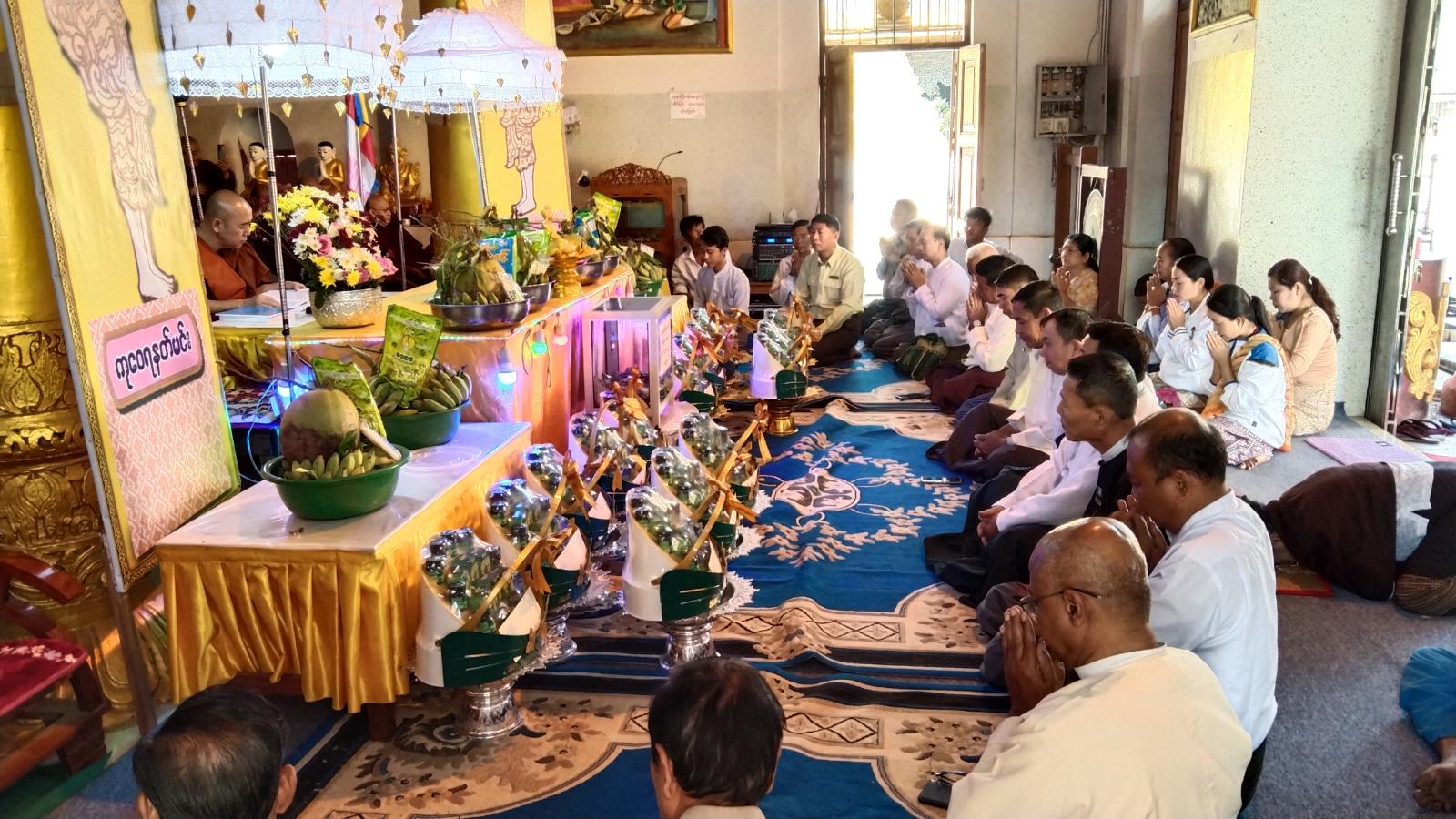 ဦးစွာနိုင်ငံတော်ဗဟိုသံဃာ့ဝန်ဆောင် မြဝတီမြို့၊ မြသုခ၊ အမှတ်(၂၇၅) တပ်ဦးကျောင်းတိုက်ဆရာတော် အဂ္ဂမဟာသဒ္ဓမ္မဇောတိကဓဇ ဘဒ္ဒန္တ ဒေါက်တာပညာနန္ဒ အမှူးရှိသော ဆရာတော်၊ သံဃာတော်အရှင်သူမြတ်တို့က နမောတဿ သုံးကြိမ်ရွတ်ဆို ဘုရားကန်တော့၍ အခမ်းအနားကို ဖွင့်လှစ်ပေးပြီး ခရိုင်စီမံအုပ်ချုပ်ရေးအဖွဲ့မှ အဖွဲ့ဝင် (၁) ဒုတိယ ဗိုလ်မှူးကြီးနိုင်ဝင်း၊ အဖွဲ့ဝင်(၂) ဦးစိန်သောင်း၊ ခရိုင်အထွေထွေအုပ်ချုပ်ရေးဦးစီး ဌာနမှ ဒုတိယခရိုင်အုပ်ချုပ်ရေးမှူး ဦးတင်ရွှေ၊ မြို့နယ်စီမံအုပ်ချုပ်ရေးအဖွဲ့ ဥက္ကဋ္ဌ မြို့နယ်အုပ်ချုပ်ရေးမှူး ဦးသက်လွင်၊ ခရိုင်နှင့် မြို့နယ်အဆင့် ဌာနဆိုင်ရာ တာဝန်ရှိသူများနှင့် ဧည့်ပရိသတ်အပေါင်းတို့က ငါးပါးသီလ ခံယူဆောက်တည်ကြသည်။