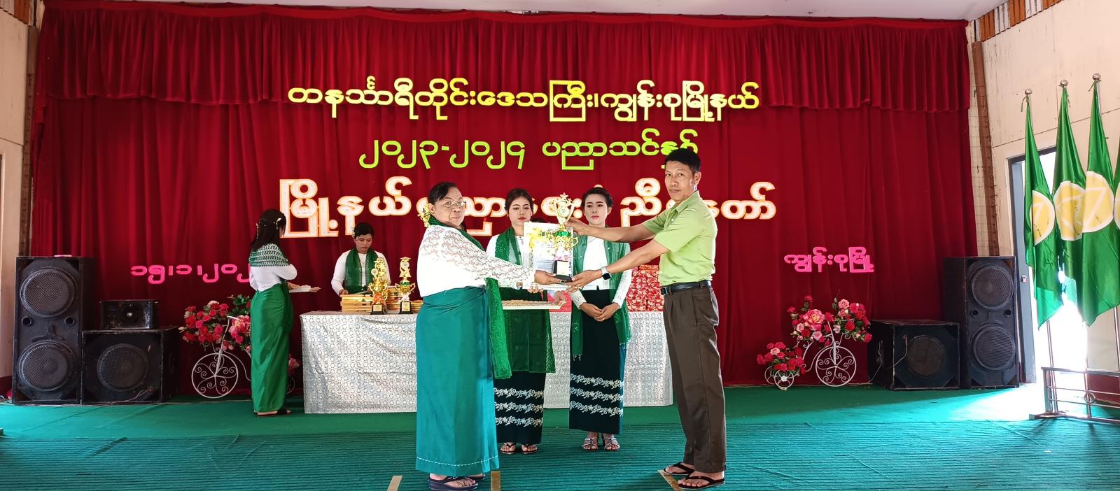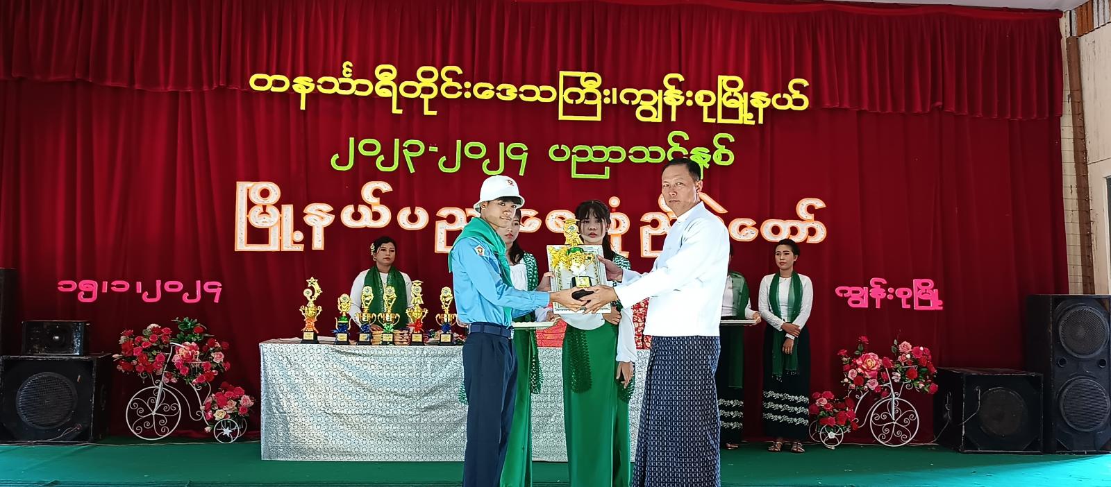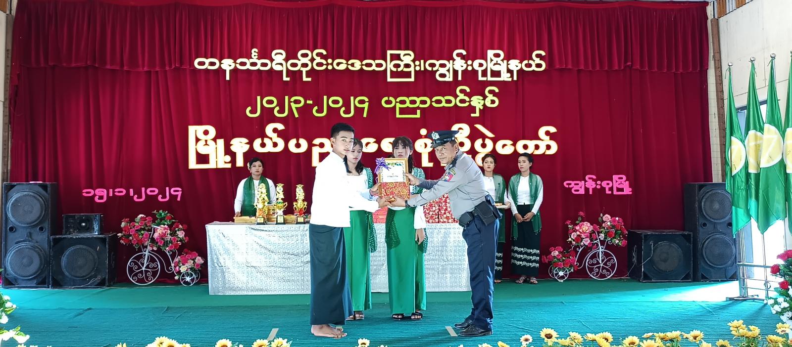 ဆက်လက်၍ ၂၀၂၃-၂၀၂၄ ပညာသင်နှစ်တွင် ပညာရေးဝန်ကြီးဌာနမှ ချီးမြှင့်သော ကမ္ဘာ့ဆရာများနေ့ အထိမ်းအမှတ် ထူးချွန်ဆရာများ ဂုဏ်ပြုပွဲ အခမ်းအနားတွင် ထူးချွန်ဆရာဆု ရရှိခဲ့သော အ.ထ.က ပထက်ကျောင်းမှ ကျောင်းအုပ်ကြီး ဒေါ်မေမြင့်လွင်အားလည်းကောင်း၊ ၂၀၂၂-၂၀၂၃ ပညာသင်နှစ်၊ နိုင်ငံတော်အဆင့် လူရည်ချွန်ဖြစ်အောင် မွေးထုတ်ပေးခဲ့သော အထက ကတ္တလူကျောင်းမှ ကျောင်းအုပ်ကြီးနှင့် ဆရာ၊ ဆရာမများ၊ နိုင်ငံတော်အဆင့် လူရည်ချွန် ရွေးချယ်ခြင်း ခံရသော Grade – 11 ကျောင်းသား မောင်ထူးခြားအားလည်းကောင်း၊ တက္ကသိုလ်ဝင်စာမေးပွဲတွင် အောင်ချက်ရာခိုင်နှုန်း အကောင်းဆုံး ရရှိခဲ့သည့် ကျောင်းများ၊ ၂၀၂၂ - ၂၀၂၃ ပညာသင်နှစ် နှင့် ၂၀၂၃ - ၂၀၂၄ ပညာသင်နှစ်တို့တွင် တိုင်းဒေသကြီးအဆင့်၊ ခရိုင်အဆင့်၊ မြို့နယ်အဆင့် စာစီစာကုံး၊ ကဗျာနှင့် ကျပန်းစကားပြောပြိုင်ပွဲ၊ ကွန်ပျုတာပန်းချီ၊ ကာတွန်း၊ အင်္ဂလိပ်စာစွမ်းရည်ပြိုင်ပွဲ၊ သင်္ချာစွမ်းရည်ပြိုင်ပွဲနှင့် အားကစားပြိုင်ပွဲများတွင် ဆုရရှိသူများအား တနင်္သာရီရေတပ်စခန်းဌာနချုပ်၊ ဌာနချုပ်မှူး ဗိုလ်မှူးချုပ် သိန်းထူးနှင့် ဇနီး ဒေါက်တာ ဒေါ်အေးစိုး၊ မြို့နယ်စီမံအုပ်ချုပ်ရေးအဖွဲ့ဥက္ကဋ္ဌ ဦးအောင်စန်းဝင်းနှင့် အဖွဲ့ဝင်များ၊ ဌာနဆိုင်ရာ အကြီးအကဲများနှင့် တာဝန်ရှိသူများက ဆုများ အသီးသီး ချီးမြှင့်ပေးအပ်ခဲ့ပြီး မြို့နယ်အတွင်းရှိ အခြေခံပညာကျောင်းများ အသီးသီးမှ ချမ်းမြေ့ပါစေ၊ အခြေခံကဗျာလွတ် အက၊ ရတနာပုံ၊ ယောသူတို့ရွာ၊ မြန်မာအမျိုးသမီး အလှထီးယိမ်းအက၊ ထာဝရမြန်မာ၊ ခေတ်(၆)ခေတ် အက၊ စကားဝါမြေ စသည့် သီချင်းများဖြင့် သီဆိုဖျော်ဖြေကပြခဲ့ကြရာ တနင်္သာရီရေတပ်စခန်းဌာနချုပ်၊ ဌာနချုပ်မှူး ဗိုလ်မှူးချုပ် သိန်းထူးနှင့်ဇနီး ဒေါက်တာ ဒေါ်အေးစိုး၊ အရာရှိများ၊ မြို့နယ်စီမံအုပ်ချုပ်ရေးအဖွဲ့ဥက္ကဋ္ဌ ဦးအောင်စန်းဝင်းနှင့် အဖွဲ့ဝင်များ၊ မြို့နယ်ပညာရေးမှူး ဒေါ်ဝင်းမာ၊ မြို့နယ်အတွင်းရှိ အခြေခံပညာကျောင်းများမှ ကျောင်းအုပ်ဆရာကြီး/ ဆရာမကြီးများ၊ ဆရာ/မများ၊ ကျောင်းသားမိဘများနှင့် ဆုရကျောင်းသား/သူများက ကြည့်ရှုအားပေးခဲ့ကြကာ ဆုတော်ငွေများ ချီးမြှင့်ပေးအပ်ခဲ့ကြောင်း သိရသည်။
