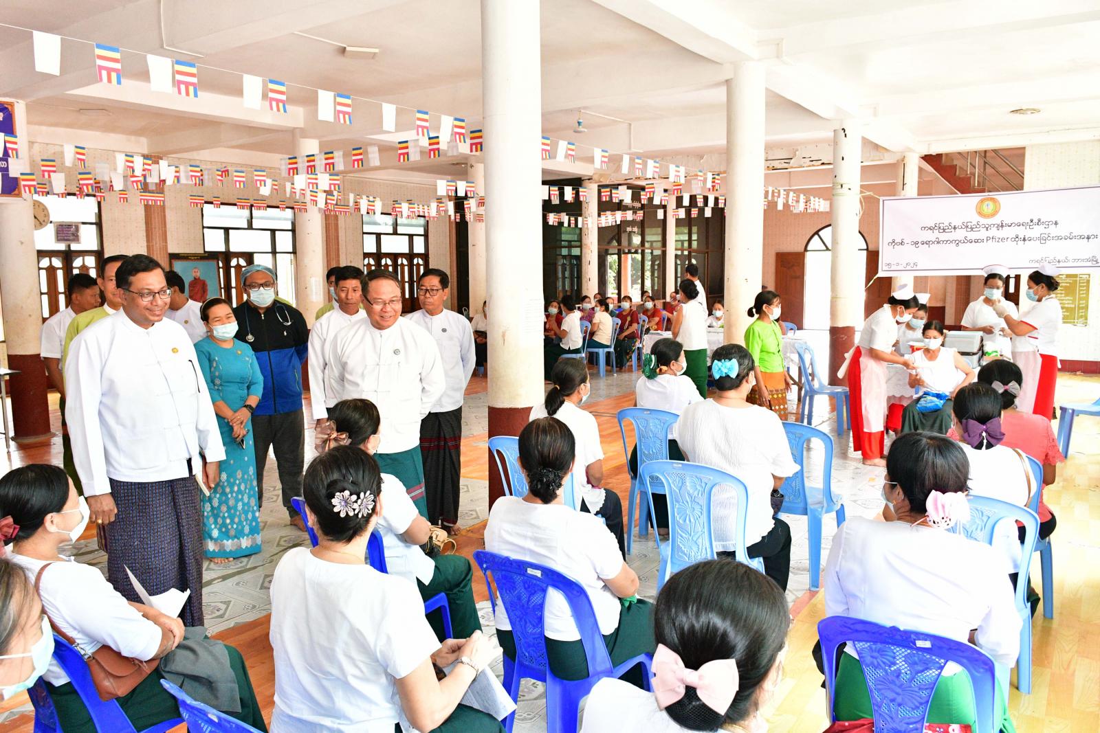 ပြည်နယ်ဝန်ကြီးချုပ်နှင့်အဖွဲ့သည် ထပ်ဆောင်းကာကွယ်ဆေးမထိုးနှံမီ လိုအပ်သည့်ကျန်းမာရေး စစ်ဆေးမှုခံယူနေမှုများ၊ ကာကွယ်ဆေးထိုးနှံပေးနေမှုများ၊ ကာကွယ်ဆေးထိုးပြီး ခေတ္တခဏ စောင့်ဆိုင်းနေစေသည့်အခြေအနေများကို လှည့်လည်ကြည့်ရှုအားပေးပြီး ပြည်နယ်ဝန်ကြီးချုပ်က ကာကွယ်ဆေးထိုးနှံပေးနေသည့် ပြည်သူ့ကျန်းမာရေးဦးစီးဌာနမှ ကျန်းမာရေးဝန်ထမ်းများနှင့် ကြက်ခြေနီသူနာပြုတပ်ဖွဲ့အတွက် ငွေကျပ်(၅)သိန်း(၅)သောင်းကို ထောက်ပံ့ ပေးအပ်ခဲ့သည်။
