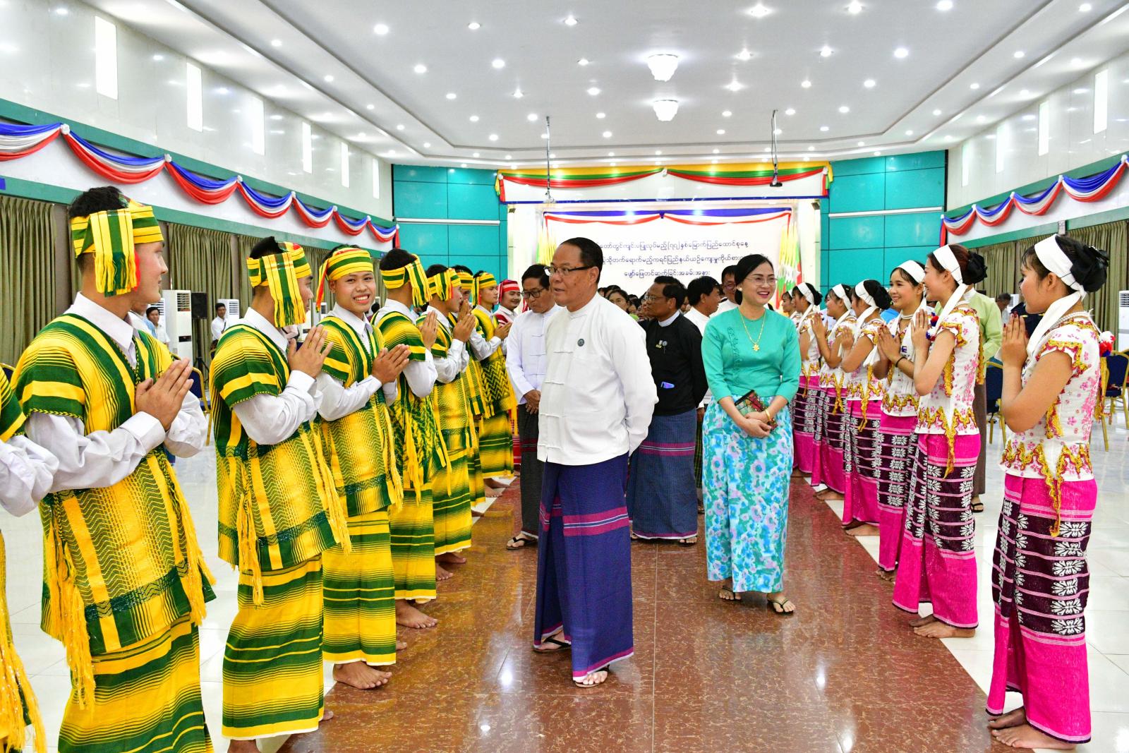 ဆက်လက်၍ (၇၇)နှစ်မြောက် ပြည်ထောင်စုနေ့ဂုဏ်ပြုညစာစားပွဲသို့တက်ရောက်မည့် ကရင် ပြည်နယ် ယဉ်ကျေးမှုကိုယ်စားလှယ်အဖွဲ့များမှဖျော်ဖြေတင်ဆက်ကပြသည့် အခမ်းအနားကို မွန်းလွဲ ၁ နာရီက ဘားအံမြို့၊ ဇွဲကပင်ခန်းမ၌ ကျင်းပရာ ကရင်ပြည်နယ်ဝန်ကြီးချုပ်ဦးစောမြင့်ဦးက ၂၀၂၄ ခုနှစ် ဖေဖော်ဝါရီလ ၁၂ ရက်နေ့တွင်ကျ ရောက်မည့် (၇၇)နှစ်မြောက် ပြည်ထောင်စုနေ့ ဂုဏ်ပြုညစာစားပွဲတွင် သာသနာရေးနှင့်ယဉ်ကျေးမှုဝန်ကြီးဌာနမှ အနုပညာရှင်များက တိုင်းဒေသကြီး(၁)ခုနှင့်ပြည်နယ်(၇)ခုတို့မှ တိုင်းရင်းသားရိုးရာယဉ်ကျေးမှုသုခုမအနုပညာရှင်များ ပေါင်းစပ်ပြီး ပြည်ထောင်စုနေ့ကျင်းပရေးဦးတည်ချက်များနှင့်အညီ သရုပ်ဖော်တင်ဆက်သွားမည် ဖြစ်ကြောင်း၊ လူမျိုးတိုင်းတွင် ကိုယ်ပိုင်ယဉ်ကျေးမှုအက၊ တူရိယာများရှိကြပြီး မိမိယဉ်ကျေးမှုကို ထိန်းသိမ်းဖော်ထုတ်၍ ခေတ်နှင့်အညီ မြှင့်တင်ခြင်းတို့ရှိကြရာ ကရင်ရိုးရာဒုံးအကကို မျိုးဆက်သစ် လူငယ်များသို့ လက်ဆင့်ကမ်းသင်ကြားပေးပြီး တိမ်ကောပပျောက်မှုမဖြစ်ရလေအောင် လက်ဆင့်ကမ်းဖော်ထုတ်ထိန်းသိမ်းကြစေလိုကြောင်း၊ ပြည်ထောင်စုနေ့ဦးတည်ချက် များနှင့်အညီ တိုင်းရင်းသားတို့၏စည်းလုံးညီညွတ်မှုကိုဖော်ထုတ်ပြသရာတွင် ကရင်ပြည်နယ်ယဉ်ကျေးမှုကိုယ်စား လှယ်များက ပူးပေါင်းပါဝင်ဆောင်ရွက်ခွင့်ရပြီး ဒုံးအကအလှများကို ရိုးရာမပျက်ဆန်းသစ်တီထွင် ဖော်ထုတ်ခွင့်ရသည့်အတွက် များစွာဂုဏ်ယူဝမ်းမြောက်မိပါကြောင်း ပြောကြားသည်။