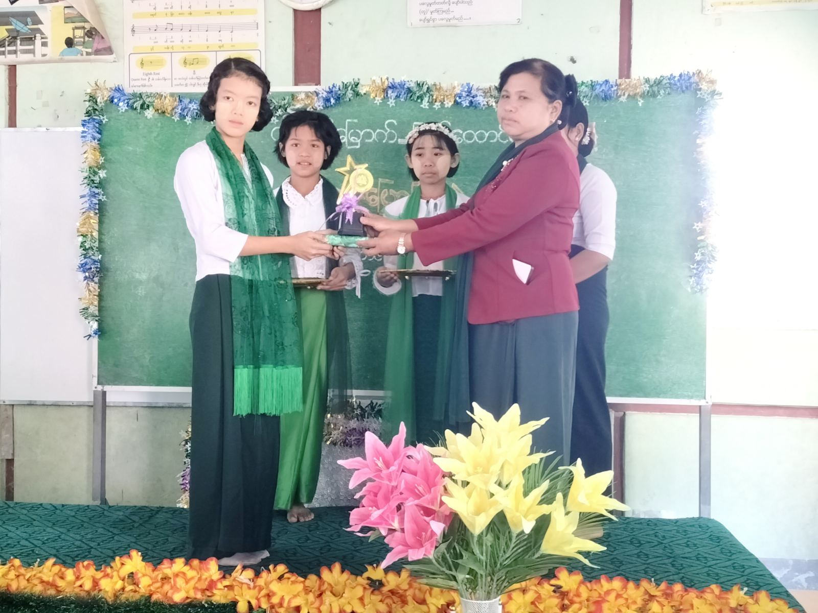 အဆိုပါပုံပြောပြိုင်ပွဲတွင် ကျောင်းသား/ကျောင်းသူ (၁၀)ဦးတို့ ပါဝင်ယှဥ်ပြိုင်ခဲ့ကြပြီး ရွှေယုန်ရွှေကျားပုံပြင်၊ ဆဒ္ဒန်ဆင်မင်းပုံပြင်၊ ပညာရှိဇီးကွက်ပုံပြင်၊ သူငယ်ချင်းသုံးယောက်၊ အပျင်းကြီးသူ အစရှိသည့်ခေါင်းစဥ်များနှင့် အသီးသီးယှဉ်ပြိုင်ခဲ့ကြရာ ပြိုင်ပွဲတွင်ပထမဆုရရှိသူအား ကျောင်းအုပ်ဆရာကြီး(ငြိမ်း)က လည်းကောင်း၊ ဒုတိယဆုရရှိသူအား စာရေးဆရာမောင်ရန်ရှင်း (ရန်ကင်းတောင်)က လည်းကောင်း၊ တတိယဆုရရှိသူအား ရှင်တော်ကုန်းကျောင်းအုပ်ဆရာမကြီးကလည်းကောင်း၊ အထူးဆုရရှိသူများအား ပြန်ကြားရေးနှင့်ပြည်သူ့ဆက်ဆံရေးဦးစီးဌာနမှ ဒုတိယဦးစီးမှူးနှင့် ရန်ကင်းတောင် အ.မ.က(၁၈) ကျောင်းအုပ်ဆရာမကြီးတို့ကလည်းကောင်း ဆုများပေးအပ်ချီးမြှင့်ပေးခဲ့ကြသည်။