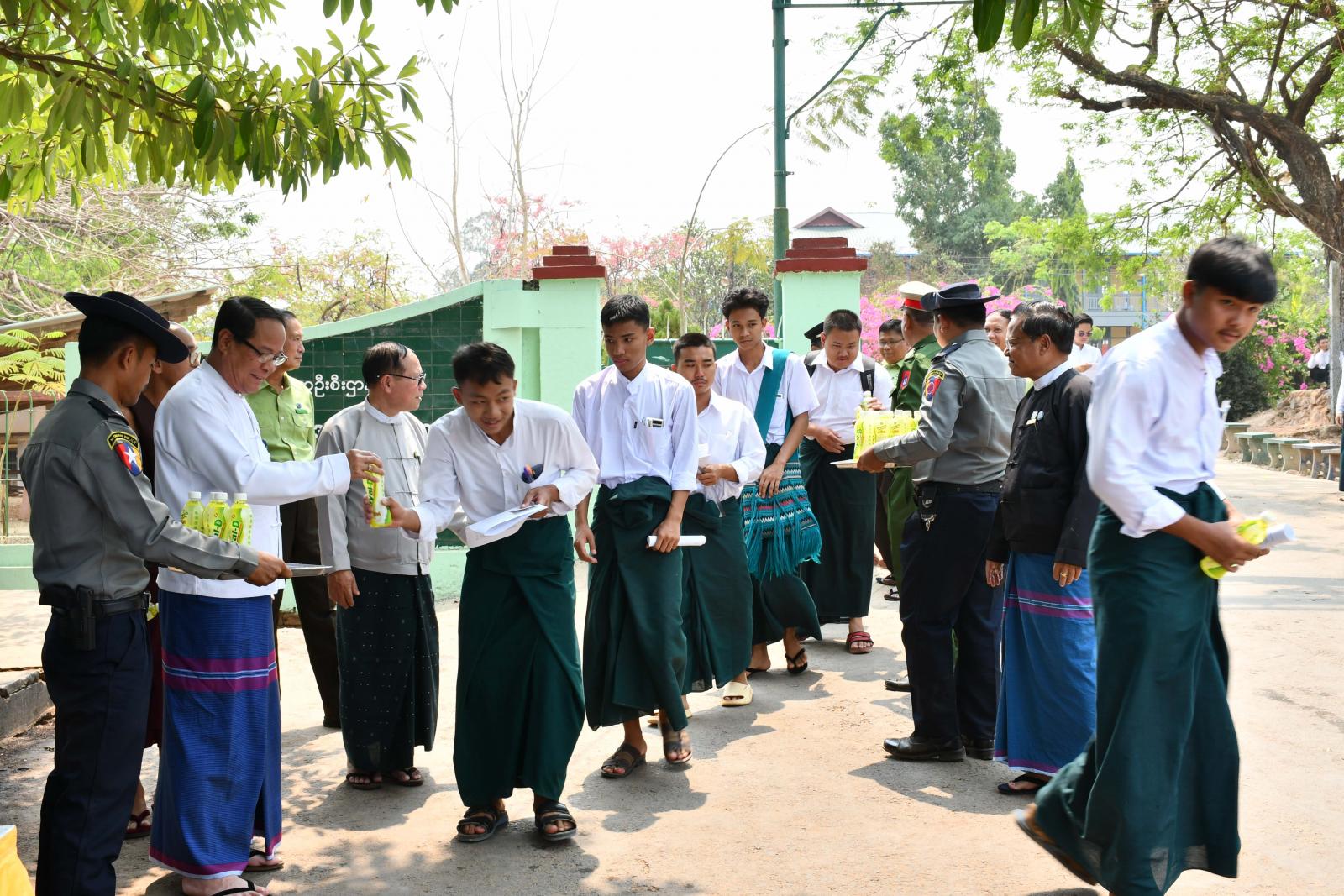 ပြည်နယ်ဝန်ကြီးချုပ်နှင့်ပြည်နယ်အစိုးရအဖွဲ့ဝင်များသည် ဘားအံမြို့၊ အမှတ်(၁)အခြေခံပညာအထက်တန်းကျောင်း၌ တက္ကသိုလ်ဝင်စာမေးပွဲ ပဥ္စမမြောက်နေ့ ရူပဗေဒဘာသာရပ်နှင့် သမိုင်းဘာသာရပ် ဖြေဆိုနေကြသည့် ကျောင်းသား၊ ကျောင်းသူ ၃၉၉ ဦးအား စာမေးပွဲဖြေဆိုပြီးချိန်တွင် အားဖြည့်အချိုရည်များ ဝေငှပေးခဲ့ပြီး အားပေးစကားများ ပြောကြားခဲ့ကြောင်း သိရှိရသည်။