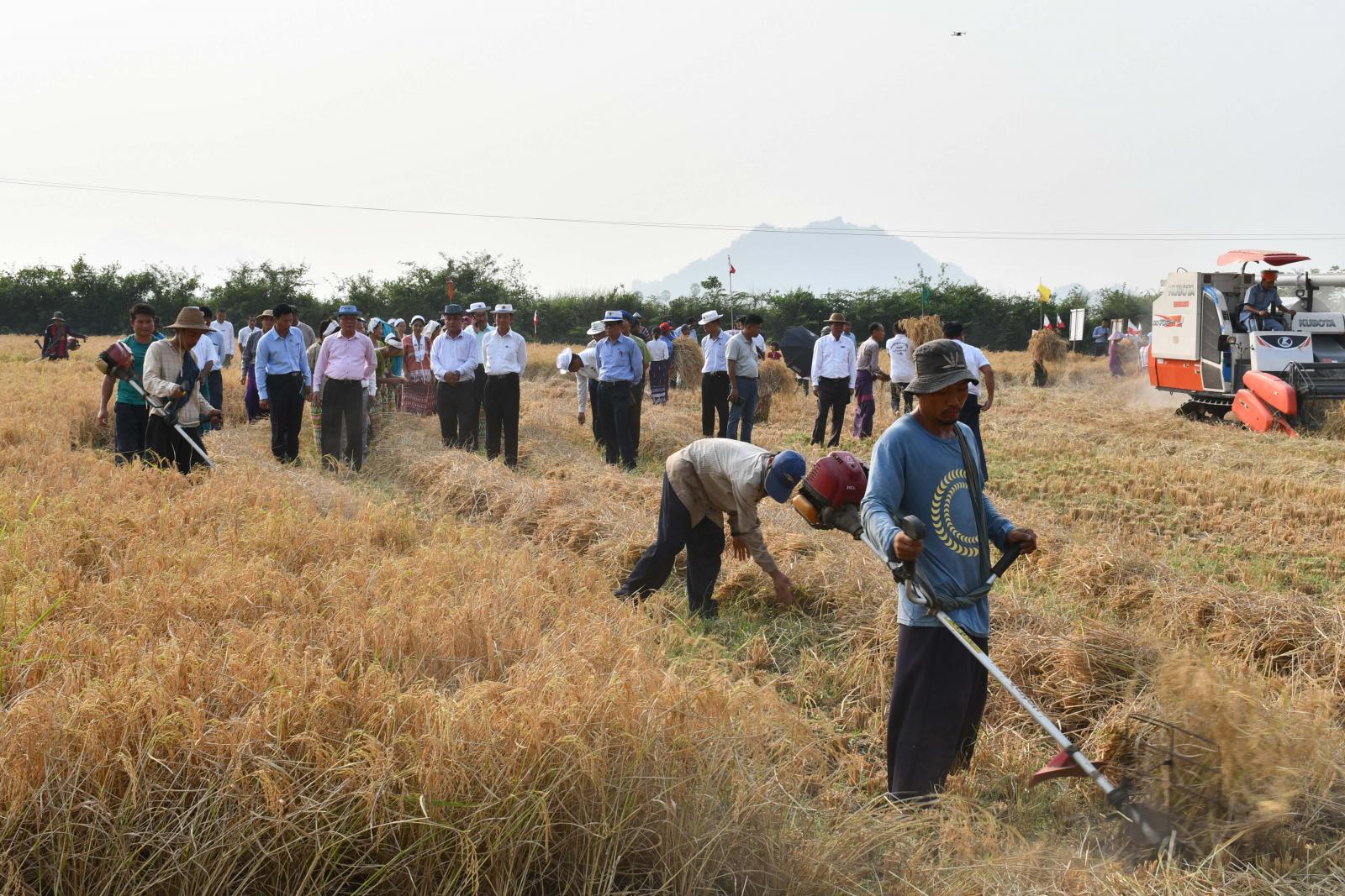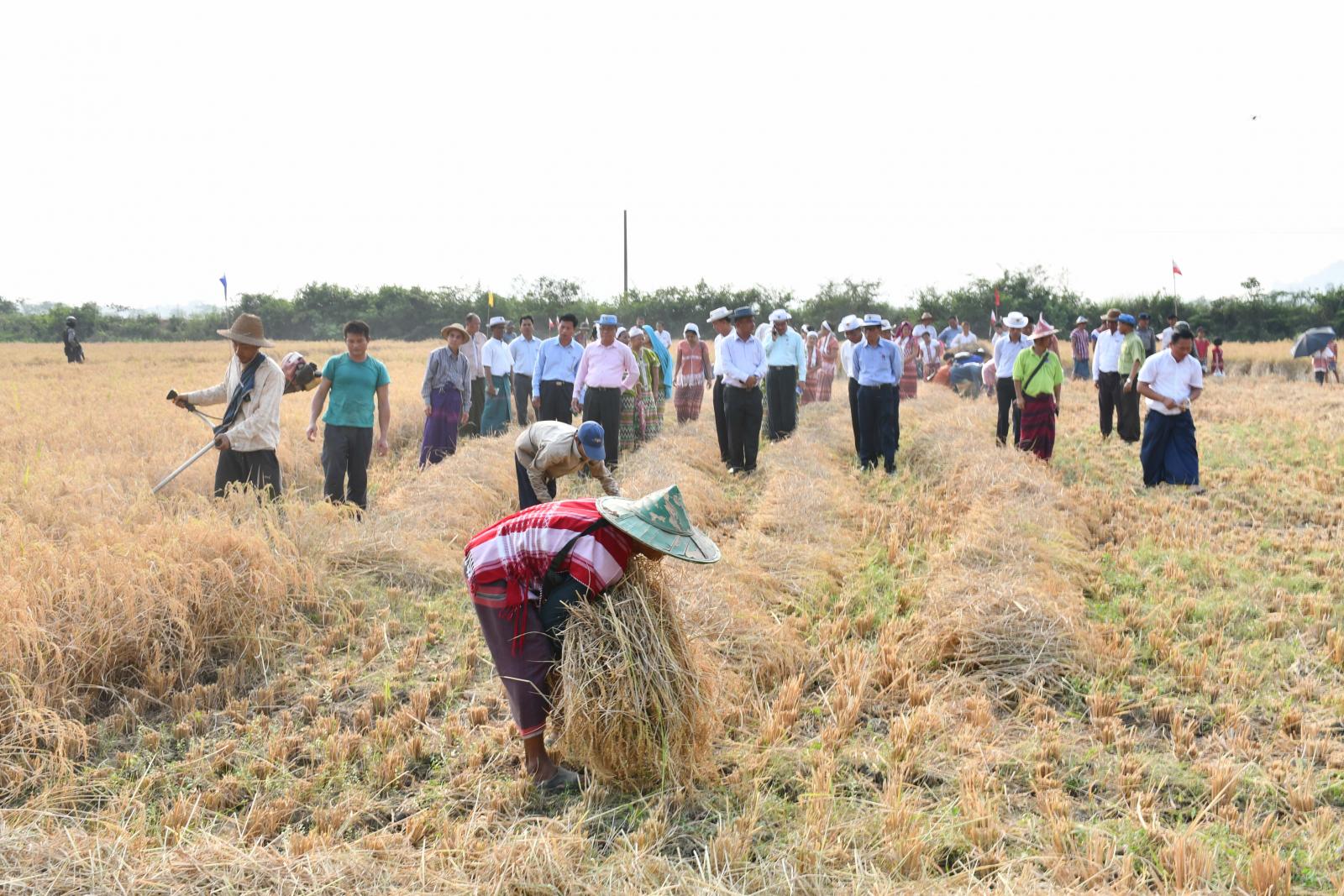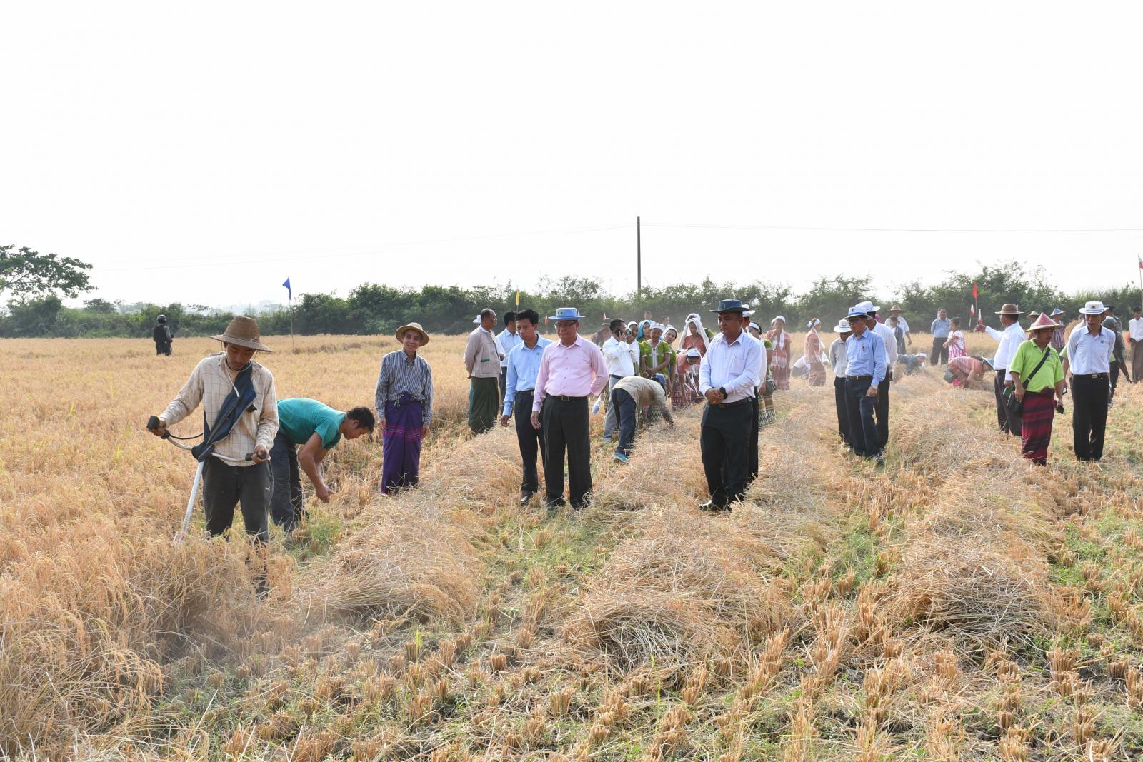 ထို့နောက် ပြည်နယ်လယ်ယာမြေစီမံခန့်ခွဲရေးနှင့် စာရင်းအင်းဦးစီးဌာနညွှန်ကြားရေးမှူးက ဆင်းသုခ အထွက်ကောင်းမျိုးစပါးတစ်ဧကအကျိုးအမြတ်ရရှိမှုအခြေအနေများကို ရှင်းလင်းတင်ပြပြီး ပြည်နယ်ဝန်ကြီးချုပ်က စံကွက်ရိတ်သိမ်းသည့်အဖွဲ့နှင့်ယဉ်ကျေးမှုအဖွဲ့များအား ဂုဏ်ပြုဆုငွေများ ပေးအပ်ချီးမြှင့်ကာ ယနေ့စံကွက်ရိတ်သိမ်းရာတွင် တစ်ဧကအထွက်နှုန်း ၁၂၃ ဒဿမ ၁၈ တင်း ရရှိကြောင်း သိရသည်။