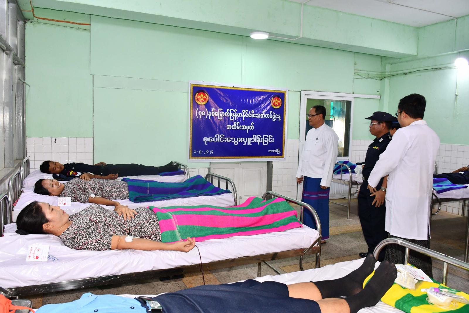 ဦးစွာ ပြည်နယ်ဝန်ကြီးချုပ်နှင့်အဖွဲ့သည် ကျန်းမာရေးဝန်ထမ်းများမှ မီးသတ်တပ်ဖွဲ့ဝင်များ စုပေါင်းသွေးလှူဒါန်းနိုင်ရေး လိုအပ်သည့်ကျန်းမာရေးစစ်ဆေးမှုများ ဆောင်ရွက်ပေးနေမှုအခြေအနေနှင့် သတ်မှတ်ချက်များနှင့်ကိုက်ညီသည့် မီးသတ်တပ်ဖွဲ့ဝင်များမှ စုပေါင်းသွေးလှူဒါန်းပေးနေမှုအခြေအနေများကို ကြည့်ရှုအားပေးပြီး အာဟာရဖြည့်စွက်အစားအစာများဖြစ်သော ကြက်ဥ၊ အားဖြည့်အချိုရည်နှင့်အားဆေးများကို ထောက်ပံ့ပေးအပ်ခဲ့ကြောင်း သိရသည်။