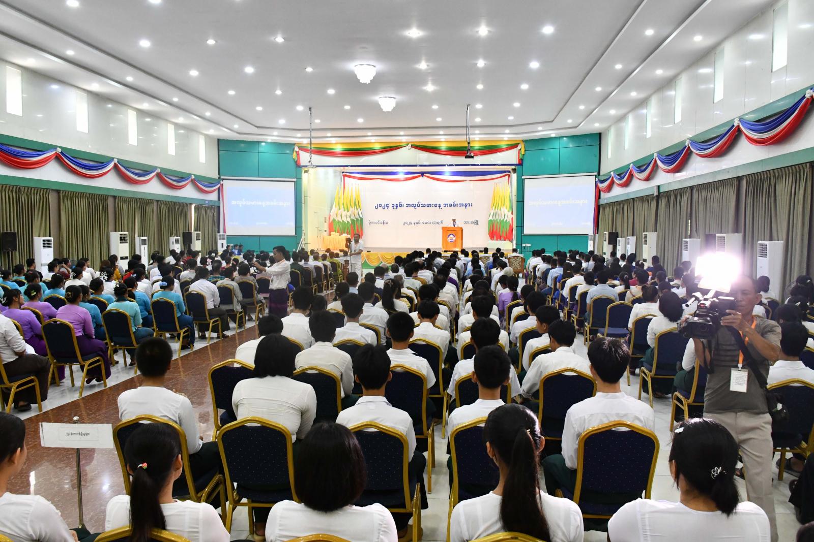 အလုပ်သမားနေ့အခမ်းအနားတွင် ပြည်ထောင်စုသမ္မတမြန်မာနိုင်ငံတော် နိုင်ငံတော်စီမံအုပ်ချုပ်ရေးကောင်စီဥက္ကဋ္ဌ နိုင်ငံတော်ဝန်ကြီးချုပ် ဗိုလ်ချုပ်မှူးကြီး သတိုးမဟာသရေစည်သူ သတိုးသီရိသုဓမ္မ မင်းအောင်လှိုင်ထံမှ ပေးပို့သော သဝဏ်လွှာကို ပြည်နယ်ဝန်ကြီးချုပ် ဦးစောမြင့်ဦးက ဖတ်ကြားပြီး ပြည်နယ်ဝန်ကြီးချုပ်နှင့်အခမ်းအနားသို့ တက်ရောက်လာသူများက အလုပ်သမားဆိုင်ရာလှုပ်ရှားဆောင်ရွက်မှုများ Video Clip ကို အတူတကွကြည့်ရှုခဲ့ကြသည်။