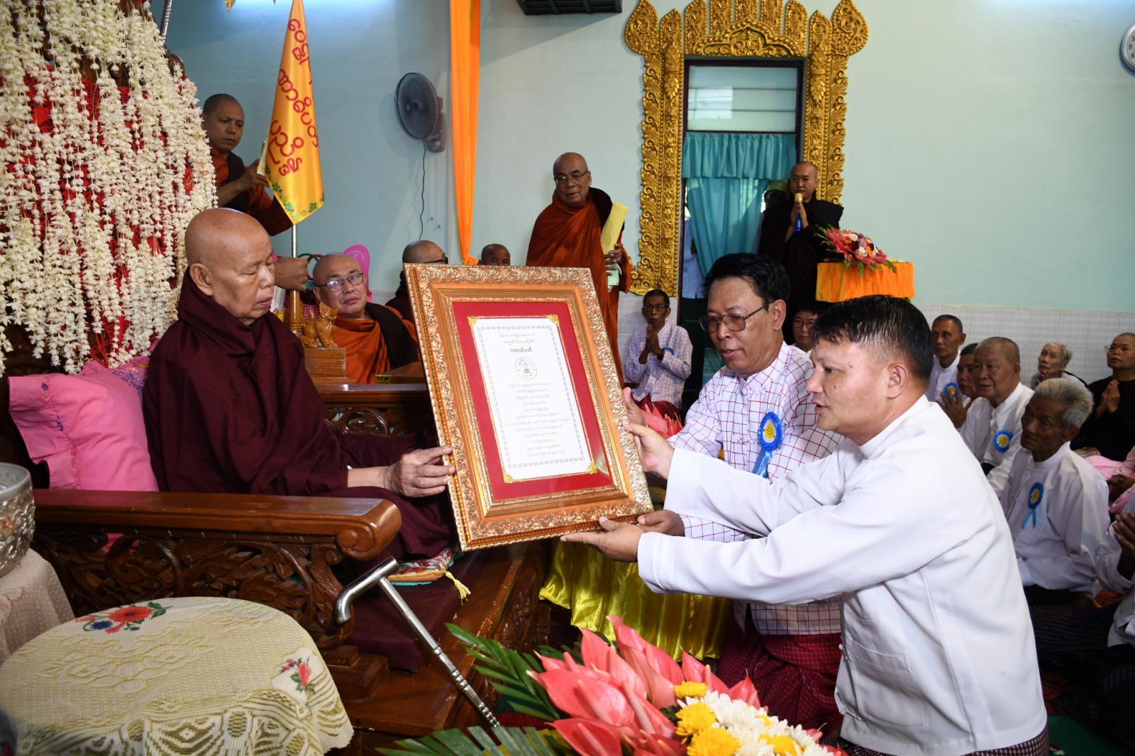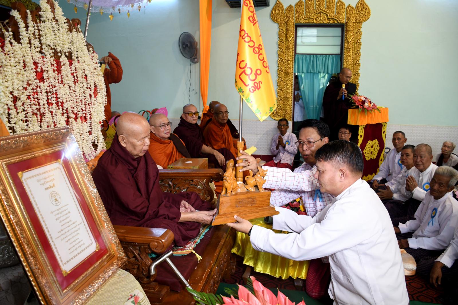 ထို့နောက် ခရိုင်စီမံအုပ်ချုပ်ရေးအဖွဲ့ဥက္ကဋ္ဌနှင့် အလှူရှင်တို့က ဆရာတော်ကြီးများထံလှူဖွယ်များ ဆက်ကပ်လှူဒါန်းပေးကြပြီး ဝေဠုဝန်နိကာယဂိုဏ်း ဗဟိုအကျိုးတော်ဆောင်ချုပ်ဆရာတော် ဘဒ္ဒန္တပဏ္ဍိတက သာသနာပိုင် ဘွဲ့တံဆိပ်တော်ဆက်ကပ်ရခြင်းနှင့် စပ်လျဉ်း၍ ရှင်းလင်းလျှောက်ထားပေးကာ ဝေဠုဝန်နိကာယဂိုဏ်း၏ ပန္နရသမမြောက် ဂဏာဓိပတိသာသနာပိုင် ဘွဲ့တံဆိပ်တော်နှင့် ဘွဲ့လက်မှတ်တို့အား ပဏ္ဍိတာရုံကျောင်းတိုက် ပဓာနနာယကဆရာတော် သာသနဓဇသိရီပဝရဓမ္မာစရိယ ဝိနယပါဠိပါရဂူ BA ဘဒ္ဒန္တပညိန္ဒမဟာထေရ်မြတ်ကြီးထံ ခရိုင်စီမံအုပ်ချုပ်ရေးအဖွဲ့ဥက္ကဋ္ဌမှ ဆက်ကပ်ပေးခဲ့သည်။