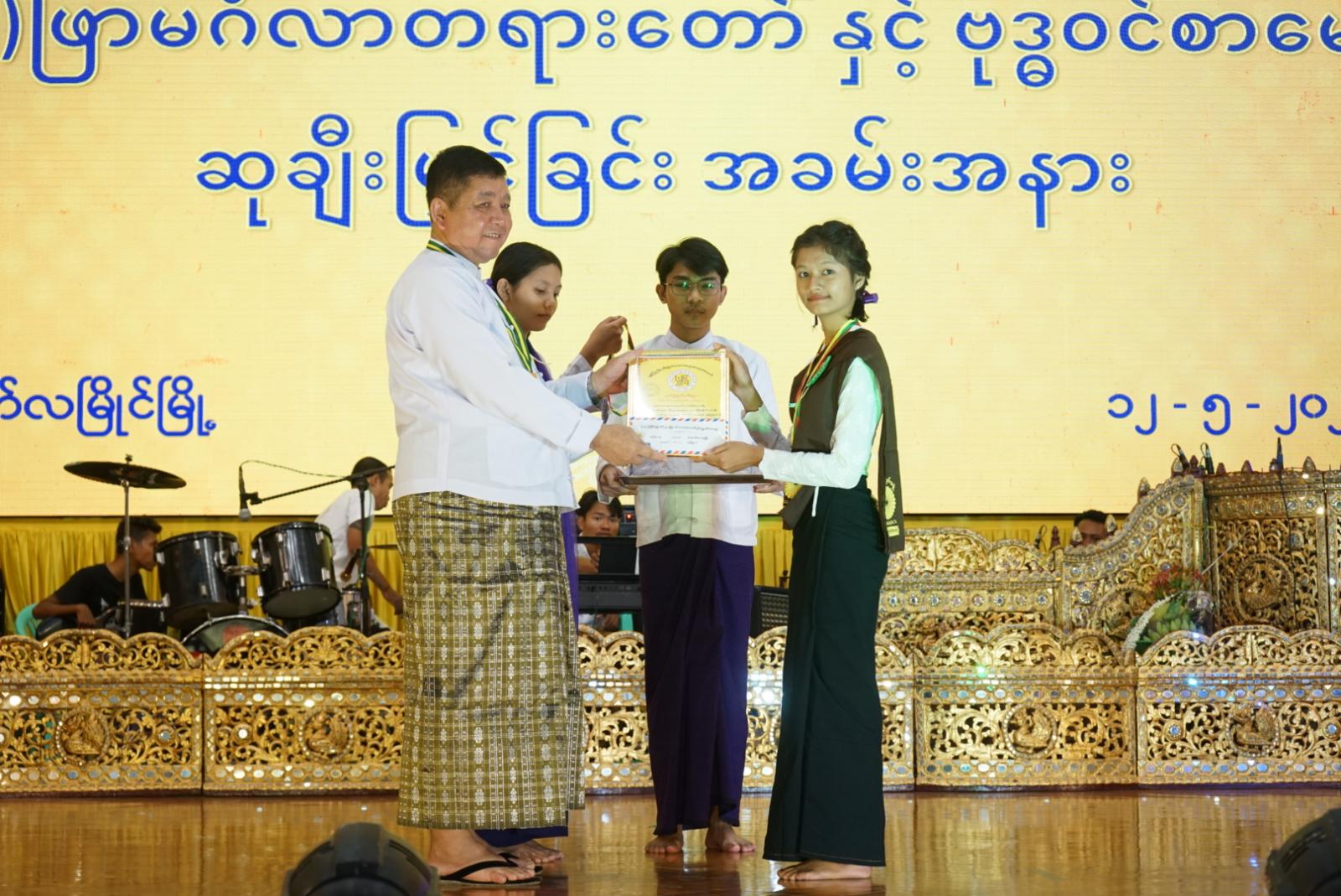 ယင်းနောက် ဆုရရှိသူများနှင့်တက်ရောက်လာကြသည့် ကျောင်းသား/သူများမှ(၃၈)ဖြာမင်္ဂလာတေးကဗျာဖြင့် သီဆိုပြီး နိုင်ငံတော်ရွှေတံဆိပ်ဆုရ တေးသံရှင်မြပန်းစံအိမ်မှ “အောင်နိမိတ်”တေးသီချင်းဖြင့် သီဆိုဖျော်ဖြေမှုကိုလည်းကောင်း၊ မြန်မာ့ကြွေးကြော်သံသီချင်းဖြင့် ဧည့်ခံဖျော်ဖြေခြင်းကိုလည်းကောင်း၊ ဇာတိမာန်တေးသီချင်းဖြင့် သီဆိုဖျော်ဖြေနေမှုများကို ပြည်နယ်ဝန်ကြီးချုပ်နင့် ပြည်နယ်အစိုးရအဖွဲ့ဝင် ဝန်ကြီးများက ကြည့်ရှုအားပေးခဲ့ပြီး ဆုရရှိသူများနှင့် စုပေါင်းမှတ်တမ်းဓာတ်ပုံရိုက်ကူးခဲ့ကြောင်း သိရှိရသည်။