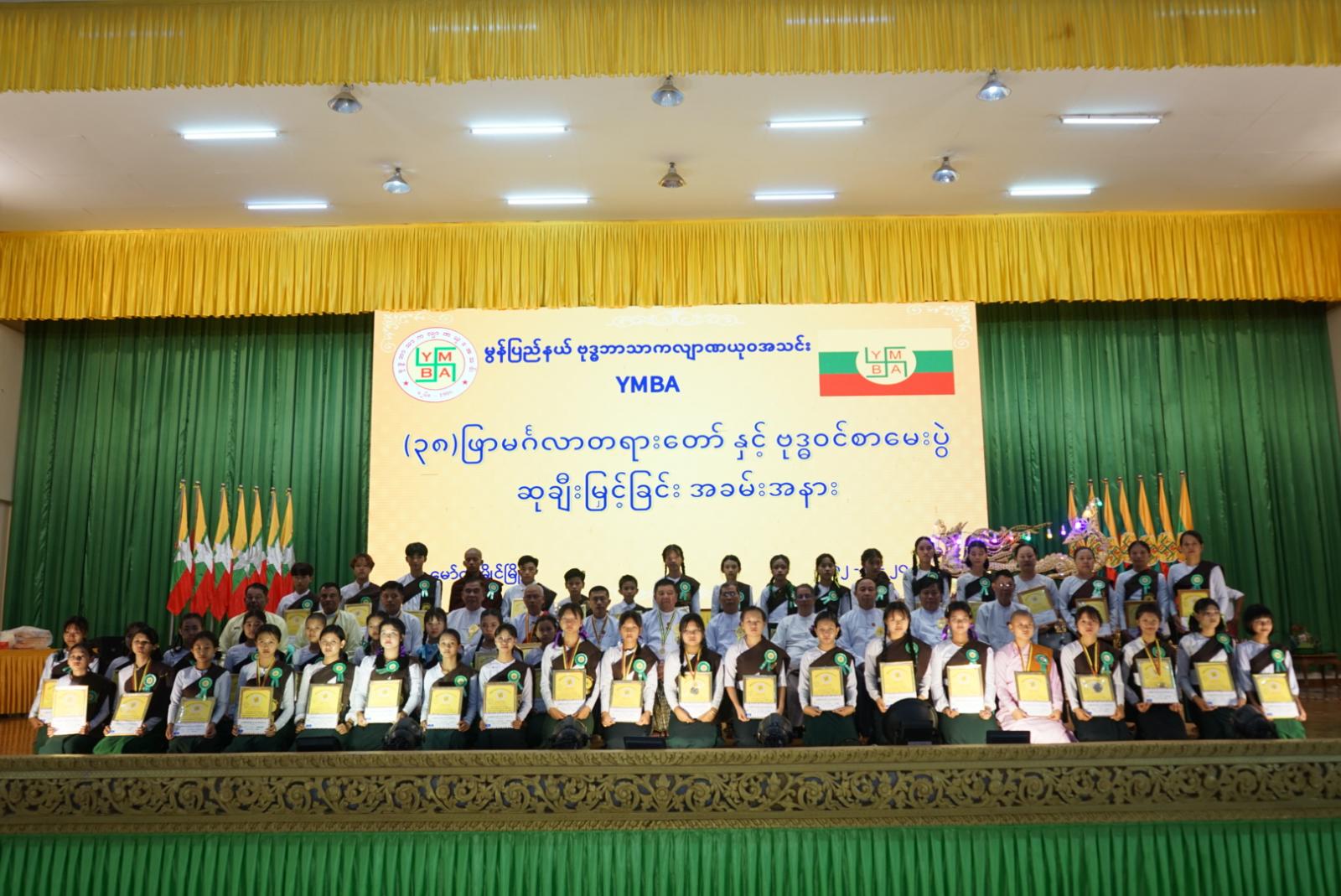 ရှေးဦးစွာ နိုင်ငံတော်အလံအား နိုင်ငံတော်သီချင်းဖွင့်လှစ်ကာ ဦးညွှတ်အလေးပြု၍ အခမ်းအနားအား ဖွင့်လှစ်ခဲ့ပြီး ပြည်နယ်ဝန်ကြီးချုပ် ဦးအောင်ကြည်သိန်းက ပြည်နယ်အတွင်းရှိ မြို့နယ်အသီးသီးတွင် YMBA အသင်းများက ကြီးမှူးပြီး ကျောင်းသား/သူများ၊ သားငယ်/သမီးငယ်များအနေနှင့် မြတ်ဗုဒ္ဓဟောကြားခဲ့သည့် (၃၈)ဖြာမင်္ဂလာတရားတော်နှင့် ဗုဒ္ဓဝင်ဖြစ်တော်စဉ်များ၊ ကျင့်ဝတ်နီတိများကို သင်ကြားနာယူခဲ့ကြပြီး စာမေးပွဲအသီးသီးကို ဝင်ရောက်ဖြေဆိုခဲ့၍ အောင်မြင်ခဲ့ကြသည့်အပြင် ထူးချွန်စွာအောင်မြင်ပြီး အငယ်တန်းအဆင့်၊ အလတ်တန်းအဆင့်၊ အကြီးတန်းအဆင့်တို့မှာ ပထမ၊ ဒုတိယ၊ တတိယဆုရရှိခဲ့ကြသော သားငယ်/သမီးငယ်များကို ဆုချီးမြှင့်ပေးခြင်းဖြစ်ကြောင်း၊ အငယ်တန်းအဆင့်မှာ ထူးချွန်စွာအောင်မြင်သူ(၁၂)ဦး၊ အလတ်တန်းအဆင့်မှာ ထူးချွန်စွာ အောင်မြင်သူ(၇)ဦး၊ အကြီးတန်းအဆင့်မှာ ထူးချွန်စွာ အောင်မြင်သူ(၇)ဦး၊ မော်လမြိုင်မြို့နယ်မှ အမှတ်အများဆုံးရရှိအောင် ဖြေဆိုသူ(၈)ဦးအပါအဝင် စုစုပေါင်း (၄၃)ဦးတို့ကို ဆုအသီးသီး ချီးမြှင့်ပေးသွားမှာဖြစ်ကြောင်း၊ တိုင်းပြည်တာဝန်ကို ပုခုံးပြောင်းယူကြမည့် လူငယ်/လူရွယ်များအနေဖြင့် ယခုလို ငယ်ရွယ်စဉ် ကာလမှာ လိမ္မာရေးခြားရှိဖို့၊ အသိပညာကြွယ်ဝဖို့၊ ကိုယ့်အမျိုးဘာသာ၊ သာသနာအကြောင်း သိရှိနားလည်ပြီး ကာကွယ်စောင့်ရှောက်ဖို့ လိုအပ်ပါကြောင်းနှင့် လူ့လောကတွင် ကျင်လည်ကြစဉ်မှာ သင်ကြားဆည်းပူးထားသည့် လောကနီတိများကို လိုက်နာကျင့်ကြံကြိုးစားအားထုတ်ကြရန် တိုက်တွန်းပြောကြားခဲ့သည်။