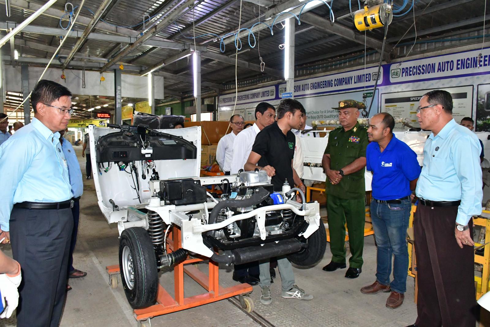 ဦးစွာ ပြည်နယ်ဝန်ကြီးချုပ်နှင့်အဖွဲ့သည် Precision Auto Engineering Co.,Ltd ၏ ဘားအံစက်မှုဇုန်ရှိ BAJA အမှတ်တံဆိပ် သုံးဘီးနှင့်မော်တော်ယာဉ်များ တပ်ဆင်ထုတ်လုပ်သည့် စက်ရုံတွင် နေ့စဉ်အလုပ်သမား ၆၀ ဦးခန့်ဖြင့် တစ်ရက်လျှင် BAJA RE နှင့် BAJA Maxima အမှတ်တံဆိပ်သုံးဘီးယာဉ် ၄၅ စီးခန့် တပ်ဆင်ထုတ်လုပ်၍ နိုင်ငံတစ်ဝန်း ဖြန့်ဖြူးရောင်းချပေးနေမှု အခြေအနေများကို သွားရောက်ကြည့်ရှုစစ်ဆေးရာ Precision Auto Engineering Co.,Ltd Ptoject general manager နှင့် တာဝန်ရှိသူများက ကုန်ကြမ်းရရှိမှုနှင့် လုပ်ငန်းလည်ပတ်မှု အခြေအနေများကို ရှင်းလင်းတင်ပြပြီး ပြည်နယ်ဝန်ကြီးချုပ်က နိုင်ငံခြားငွေ သုံးစွဲမှု လျော့ချနိုင်ရေး စက်ပစ္စည်း အစိတ်အပိုင်းများ ပြည်ပမှ မှာယူတင်သွင်းမှုများကို လျော့ချ၍ ပြည်တွင်း၌သာ ထုတ်လုပ်တပ်ဆင်အသုံးပြုနိုင်ရေး ကြိုးပမ်းဆောင်ရွက်သွားရန် မှာကြားသည်။