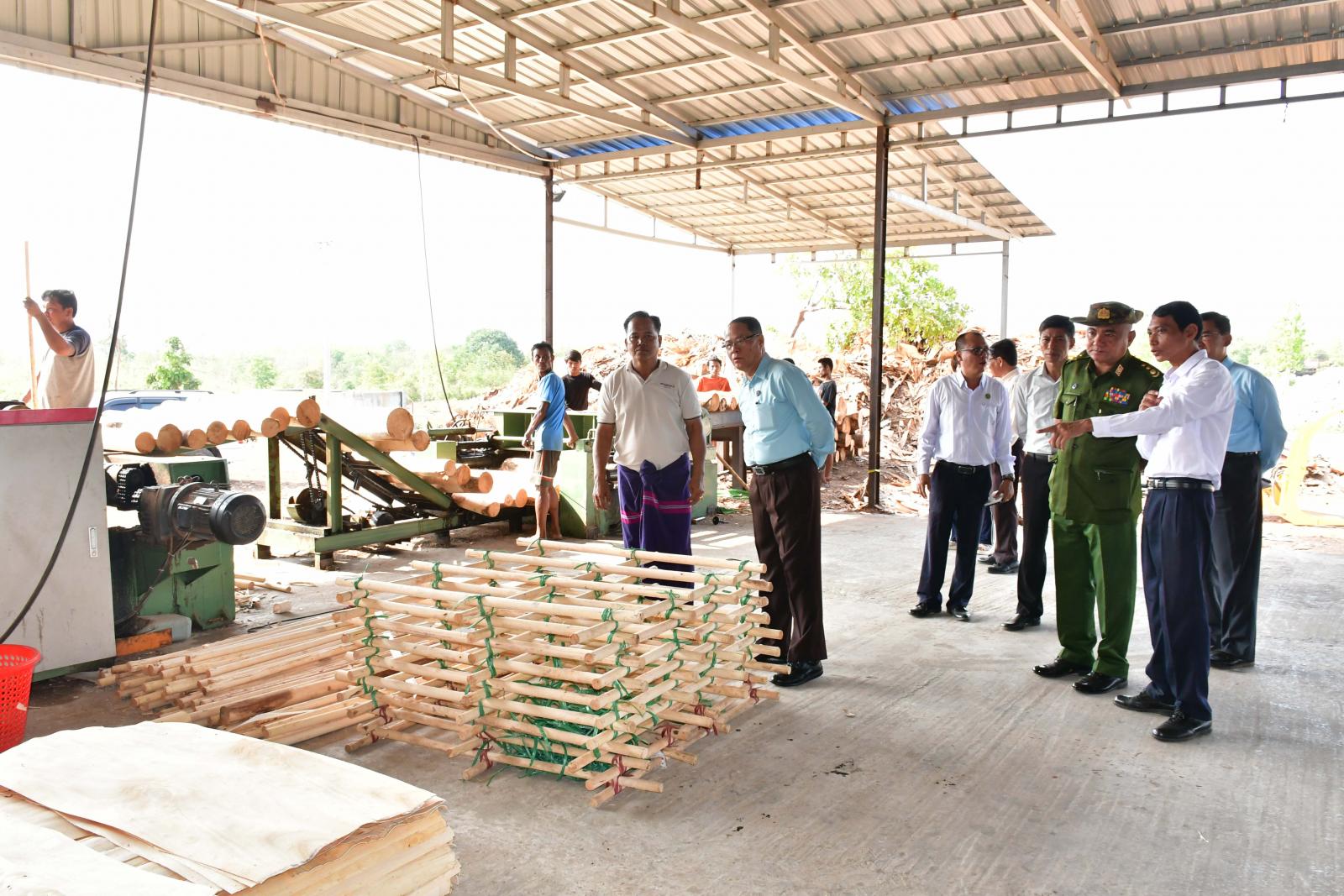 ထို့နောက် ပြည်နယ်ဝန်ကြီးချုပ်နှင့်အဖွဲ့သည် ဘားအံစက်မှုဇုန်ရှိ စောငမန်းရာဘာ သစ်ပါးလွှာ စက်ရုံ၌ အလုပ်သမား ၄၀ ဦးခန့်ဖြင့် အထပ်သားအခွံခွာအကြမ်းစက်၊ အထပ်သားအချောစက်၊ ဓါးသွေးစက်၊ ဖိသိပ်ထုတ်ပိုးစက်များဖြင့် ရာဘာသစ်ပါးလွှာ ထုတ်လုပ်ပုံအဆင့်ဆင့်၊ အရည်အသွေး ခွဲခြားပါကင်ထုတ်ပိုးထားရှိမှုနှင့် ဈေးကွက်တင်ပို့မှု အခြေအနေများကို လိုက်လံကြည့်ရှုစစ်ဆေးရာ တာဝန်ရှိသူများက ဒေသတွင်း ကုန်ကြမ်းရရှိမှု၊ သစ်ပါးလွှာထုတ်လုပ်မှုနှင့် ဈေးကွက်ရရှိမှု အခြေအနေများကို ရှင်းလင်းတင်ပြပြီး ပြည်နယ်ဝန်ကြီးချုပ်က ရာဘာသစ်ပါးလွှာထုတ်လုပ်ရာမှ ရာဘာအထပ်သား၊ ကြိတ်သား၊ သုံးထပ်သား၊ ငါးထပ်သား၊ ရာဘာသစ်အချောထည်ပစ္စည်းများ ထုတ်လုပ်နိုင်သည့် စက်ရုံသို့ အဆင့်မြှင့်တင်ဆောင်ရွက်သွားနိုင်ရေး ကြိုးပမ်းဆောင်ရွက်ကြရန် မှာကြားသည်။