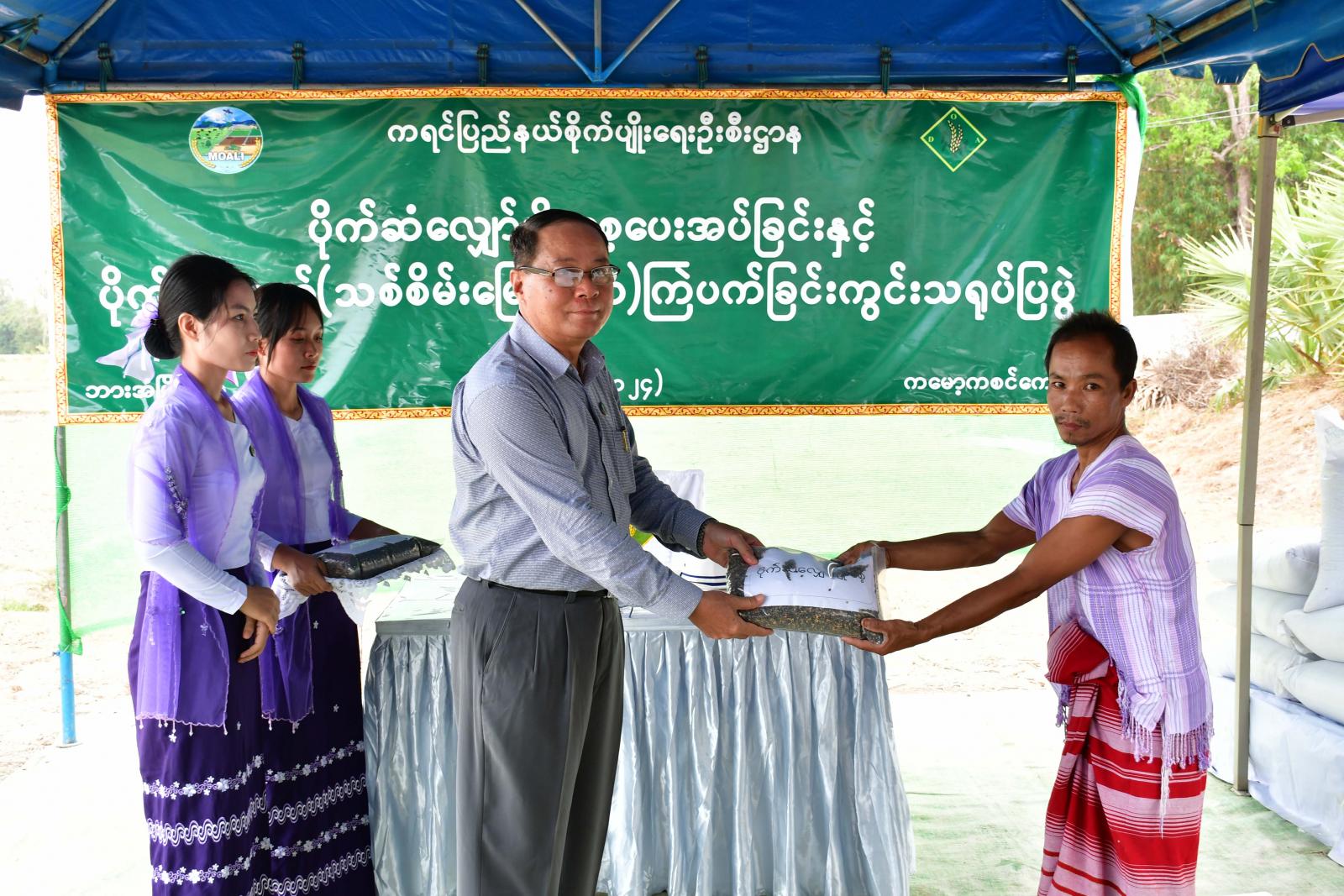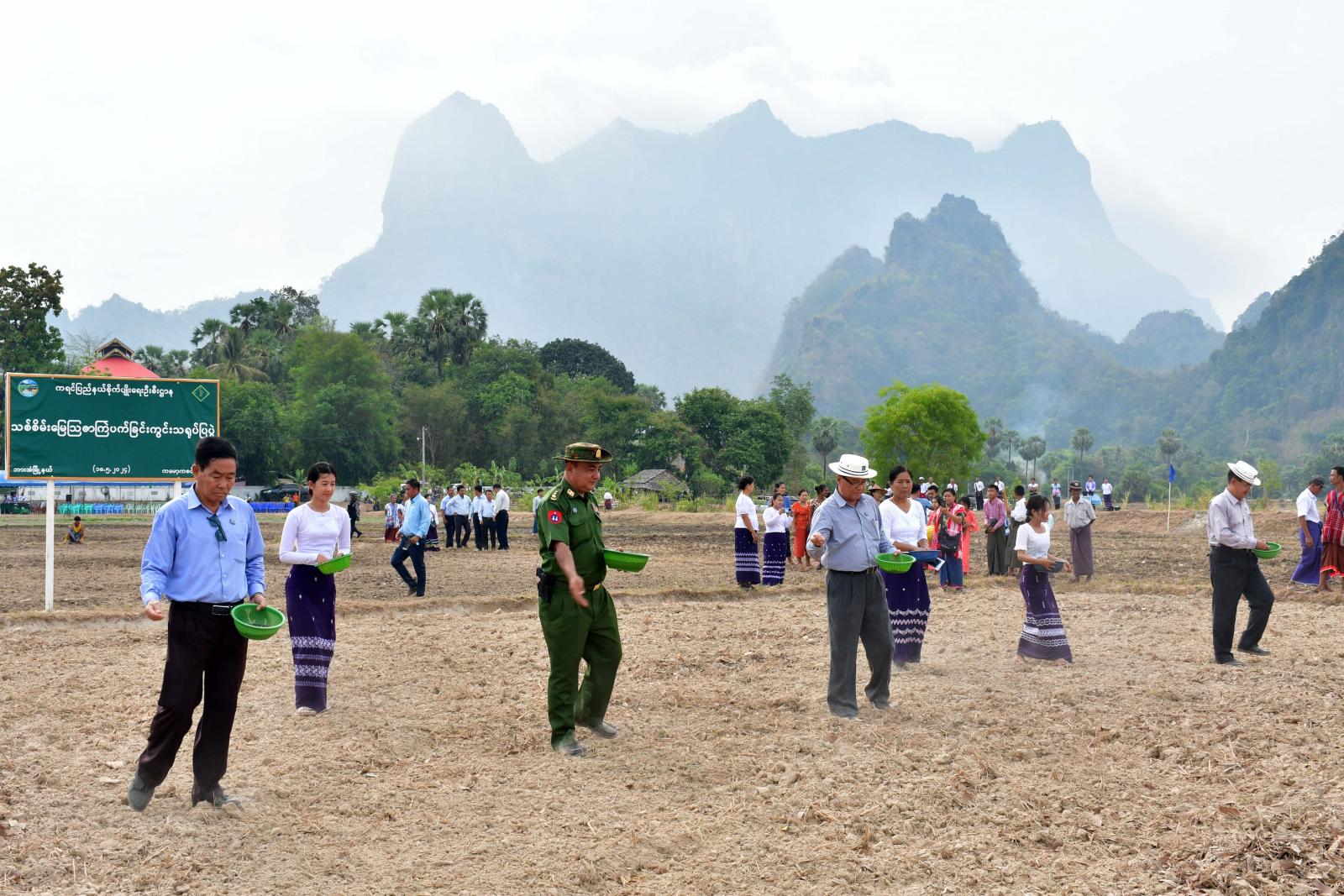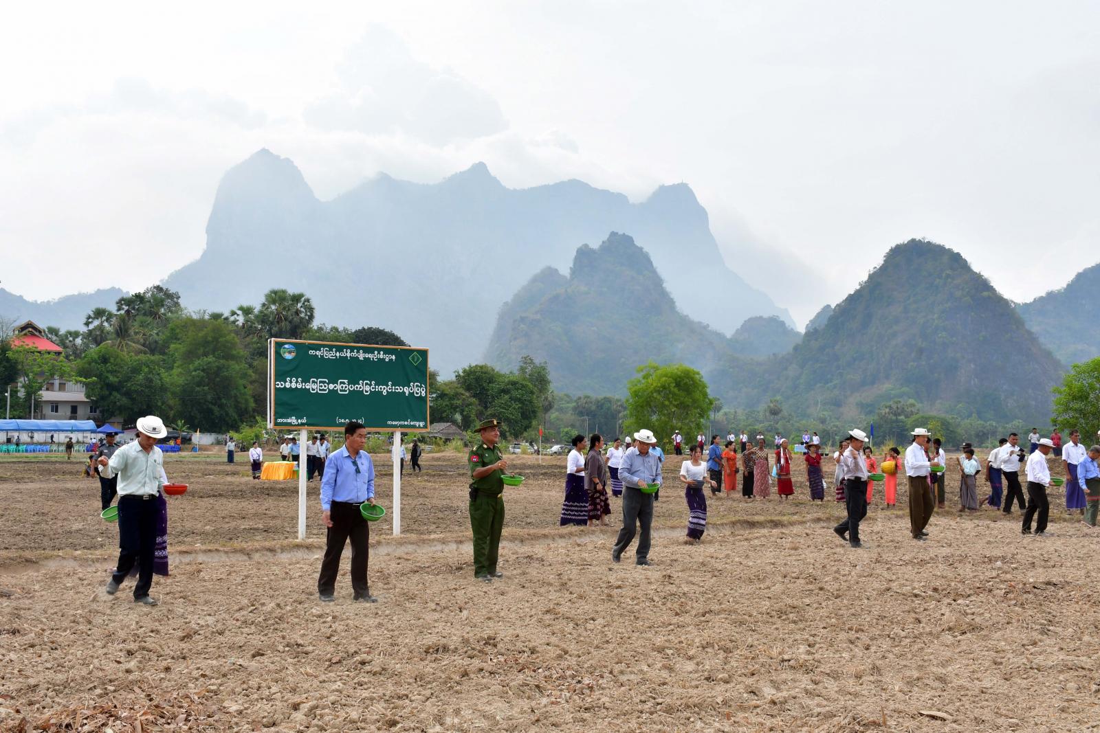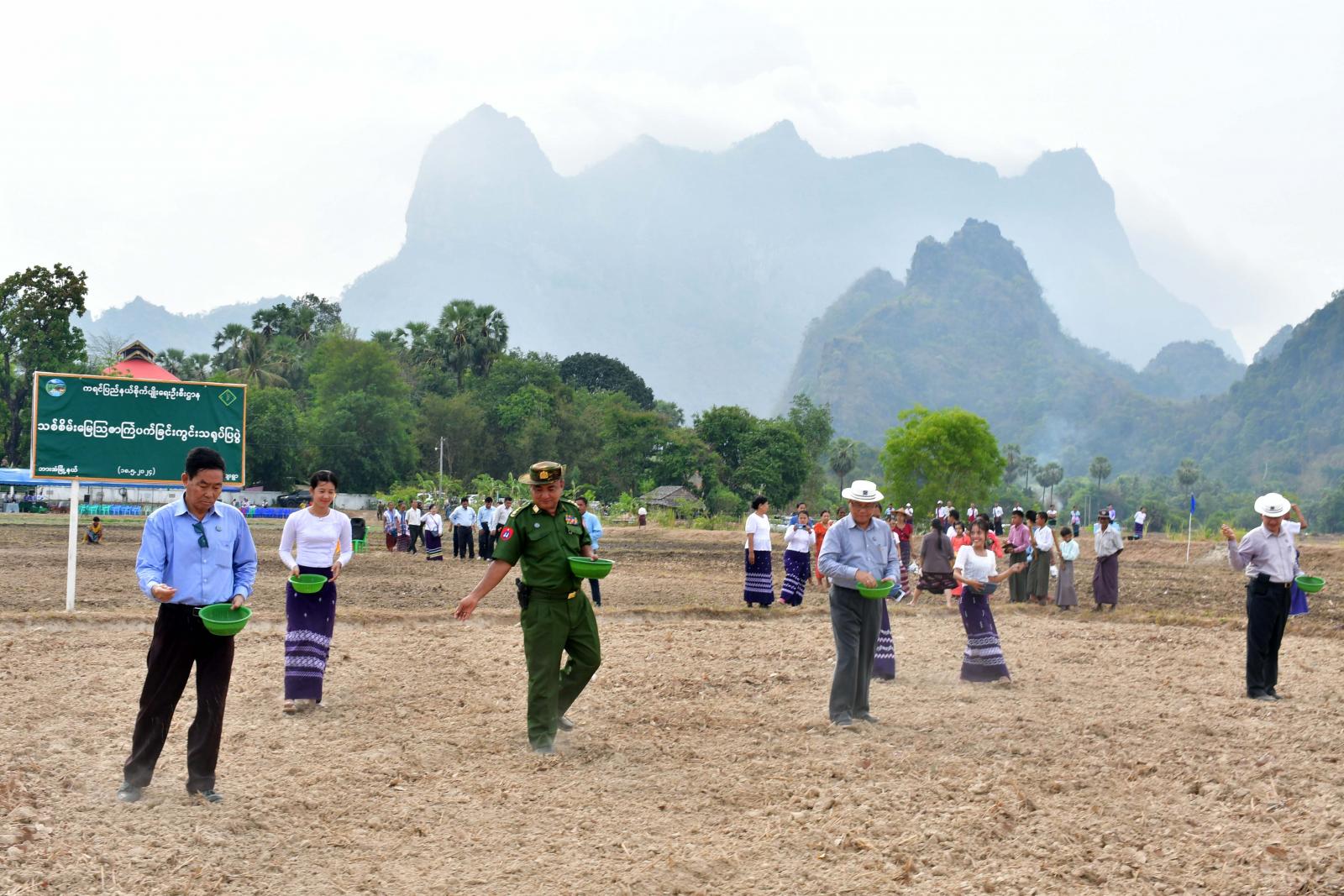 ထို့နောက် ပြည်နယ်ဝန်ကြီးချုပ်၊ ပြည်နယ်တရားလွှတ်တော်တရားသူကြီးချုပ်၊ ပြည်နယ်အစိုးရအဖွဲ့ဝင်များက ကျေးရွာ(၁၅)ရွာမှ တောင်သူများအား တစ်ဧက(၅)ပြည်နှုန်းဖြင့် ဧက(၁၅၀)အတွက် ပိုက်ဆံလျှော်မျိုးစေ့ (၃၀)တင်းကို ထောက်ပံ့ပေးအပ်ပြီး တောင်သူများနှင့်အတူ ပိုက်ဆံလျှော် (သစ်စိမ်းမြေဩဇာ)မျိုးစေ့များ အတူတကွကြဲ ပက်ခဲ့ကြသည်။