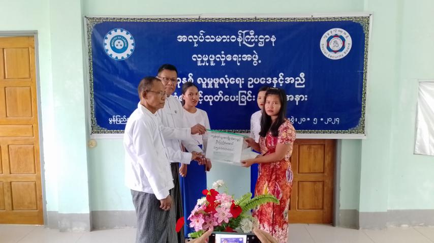 ထို့နောက် Grand Royal Co,ltd မှ အာမခံအလုပ်သမား ဦးပြည့်စုံအောင်၏ အလုပ်တွင်ထိခိုက် သေဆုံးမှုအတွက် ကျန်ရစ်သူ အကျိုးခံစားခွင့်ငွေကျပ် (၁၅၀၀၀၀၀၀)ကျပ်ကို လည်းကောင်း၊ Myanmar CP Live Stock မှ အာမခံအလုပ်သမား ဒေါ်စုဇာနည်သိမ့်က မီးဖွားမှုအတွက် အကျိုးခံစားခွင့် ငွေကျပ်(၈၂၅၀၀၀)ကျပ်ကို လည်းကောင်း၊ မြို့နယ်စည်ပင်သာယာရေးမှ အာမခံအလုပ်သမား ဒေါ်ကေဇင်ဝင်းမှ မီးဖွားမှုအတွက် အကျိုးခံစားခွင့် ငွေကျပ်(၃၂၅၂၀၀)ကို လည်းကောင်း၊ သံလွင်အေးကုမ္မဏီမှ အာမခံအလုပ်သမား ဒေါ်စုမြတ်ဖြိုးမှ မီးဖွားမှုအတွက် အကျိုးခံစားခွင့်ငွေကျပ်(၄၁၈၀၀၀)ကို လည်းကောင်း၊ သံလွင်အေးကုမ္မဏီမှ အာမခံအလုပ်သမား ဒေါ်စုစု(ခ) စုအေးငြိမ်းမှ မီးဖွားမှုအတွက် အကျိုးခံစားခွင့်ငွေကျပ် (၄၁၅၅၂၀)ကို လည်းကောင်း တာဝန်ရှိသူများက ကာယကံရှင်လက်၀ယ်အရောက်ပေးအပ်ခဲ့ပြီး Grand Royal Co.Itd မန်နေဂျာက ကျေးဇူးတင်စကား ပြန်လည်ပြောကြားခဲ့ကြောင်း သိရှိရသည်။
