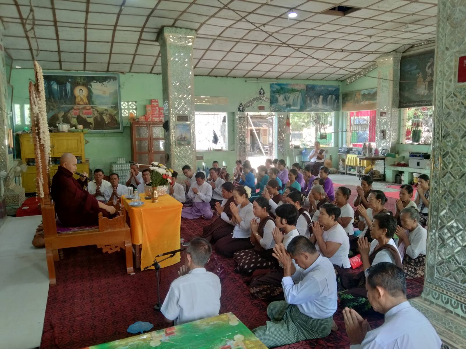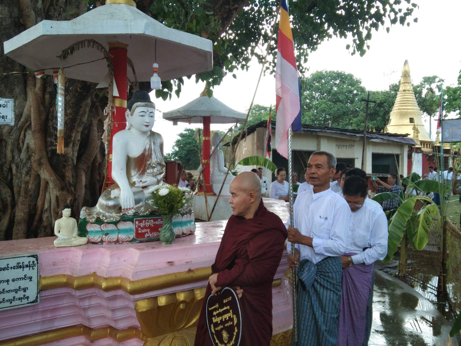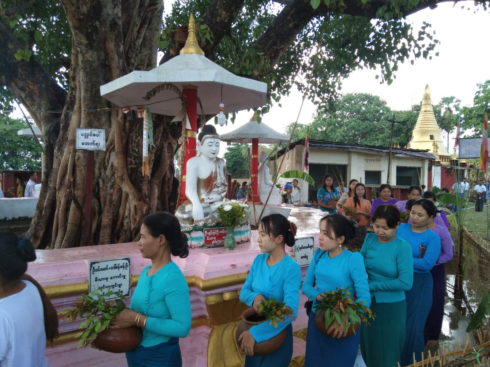 ရှေးဦးစွာ “နမောတဿ” သုံးကြိမ်ရွတ်ဆို ဘုရားကန်တော့ဖွင့်လှစ်ပြီး ဧည့်ပရိသတ်များက ဆရာတော်အရှင်သူမြတ်များထံမှ ရှစ်ပါးသီလခံယူဆောက်တည်ကာ ရေစက်သွန်းချ အမျှပေးဝေကြသည်။ ထို့နောက် မဟာဇေယျကျောင်းတိုက် ဆရာတော်ဘဒ္ဒန္တကေသရဦးဆောင်၍ ညောင်ရေအိုးများကိုင်ဆောင်ပြီး ဗောဓိညောင်ပင်ကို လက်ယာရစ်ပတ်လှည့်လည်ပူဇော်ကာ ညောင်ရေသွန်းလောင်းပူဇော်ခဲ့ကြသည်။