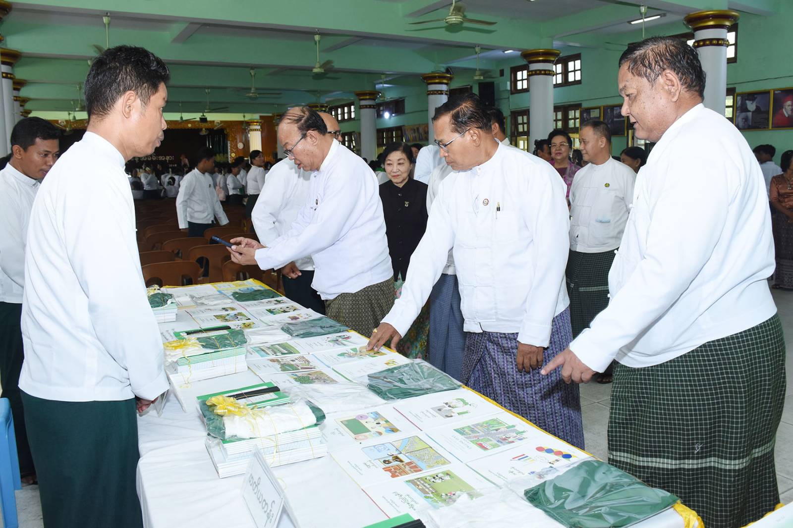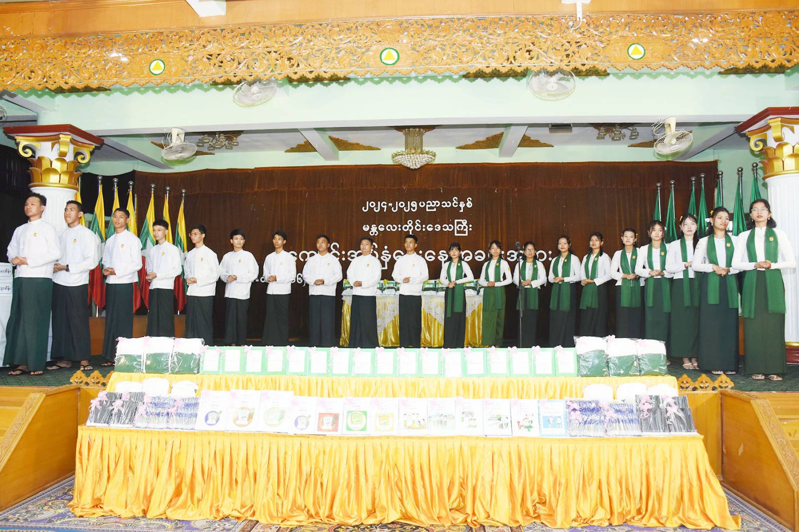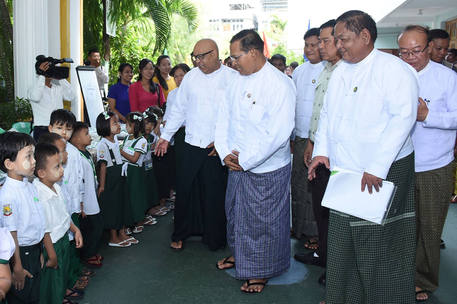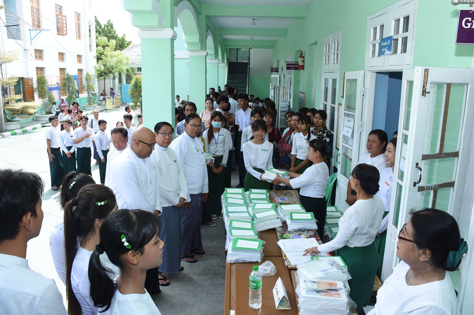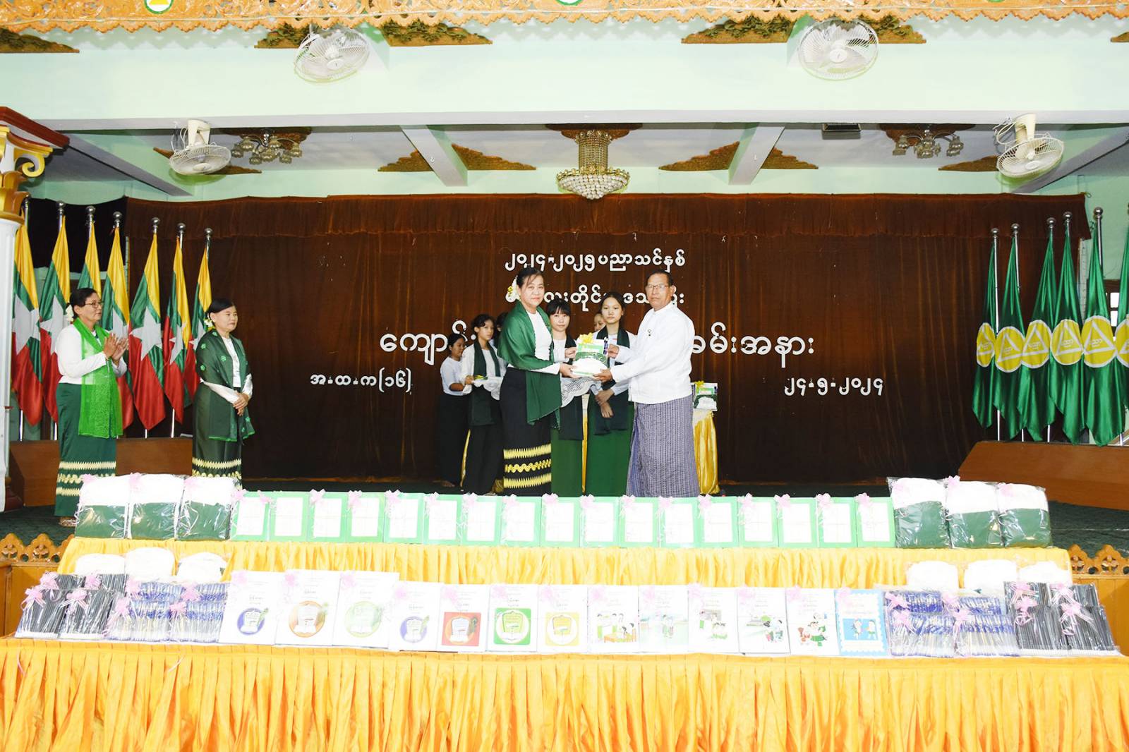 ၎င်းနောက် တိုင်းဒေသကြီး တရားလွှတ်တော် တရားသူကြီးချုပ်၊ စည်ပင်သာယာရေးဝန်ကြီး၊ လမ်းပန်းရေးရာဝန်ကြီး၊ တိုင်းဒေသကြီးပညာရေးမှူးတို့က နိုင်ငံတော်မှ အခမဲ့ ဖြန့်ဝေသည့် အခြေခံပညာ မူလတန်းအဆင့်တွင် ကျောင်းဝတ်စုံများ၊ ကျောင်းသုံးပုံနှိပ်စာအုပ်များ၊ ဗလာစာအုပ်များနှင့် စာရေးကိရိယာများကိုလည်းကောင်း၊ အခြေခံပညာ အထက်တန်းနှင့် အလယ်တန်းအဆင့်တွင် ကျောင်းသုံးပုံနှိပ်စာအုပ်များ၊ ဗလာစာအုပ်များနှင့် စာရေးကိရိယာများကိုလည်းကောင်း သက်ဆိုင်ရာ ခရိုင်ပညာရေးမှူးများထံသို့ ပေးအပ်ပြီးနောက် စေတနာ အလှူရှင်များမှ လှူဒါန်းငွေများကို တိုင်းပညာရေးမှူးရုံးမှ တာဝန်ရှိသူများက လက်ခံ ခဲ့ကြောင်းနှင့် တိုင်းဒေသကြီး တရားလွှတ်တော်တရားသူကြီးချုပ်၊ တိုင်းဒေသကြီး အစိုးရ အဖွဲ့ဝင်ဝန်ကြီးများနှင့် တာဝန်ရှိသူများသည် ဆရာဆရာမများ၊ကျောင်းသား ကျောင်းသူများနှင့် မိဘများအား ရင်းနှီးစွာနှုတ်ဆက်ကာ ကျောင်းအပ်နှံလက်ခံ ဆောင်ရွက်ပေးနေမှုများကို လိုက်လံရှုအားပေးခဲ့သည်။