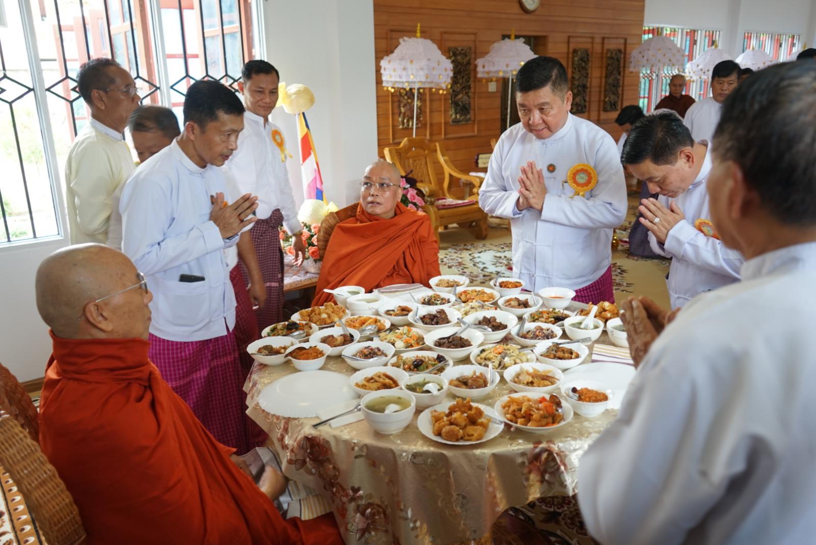 ထို့နောက် ပြည်နယ်ဝန်ကြီးချုပ်၊ တိုင်းမှူးနှင့် ပြည်နယ်ဝန်ကြီးများက နေ့ဆွမ်းဆက်ကပ်လှူဒါန်း၍ ပြည်နယ်ဝန်ကြီးချုပ်က တိပိဋကဓရ ဓမ္မဘဏ္ဍာဂါရိကဘွဲ့ တံဆိပ်တော်၊ ဒွိပိဋကကောဝိဒ ဘွဲ့တံဆိပ်တော်ရ ဆရာတော်များအား လှူဖွယ်ဝတ္ထုပစ္စည်းများ ဆက်ကပ် လှူဒါန်းခဲ့ကြသည်။