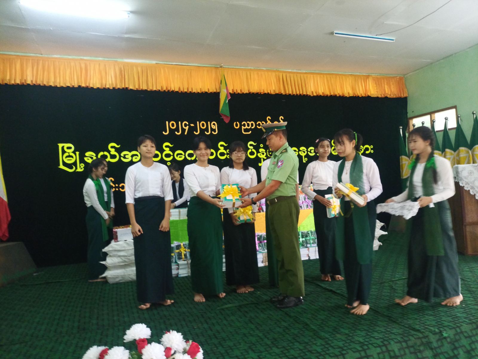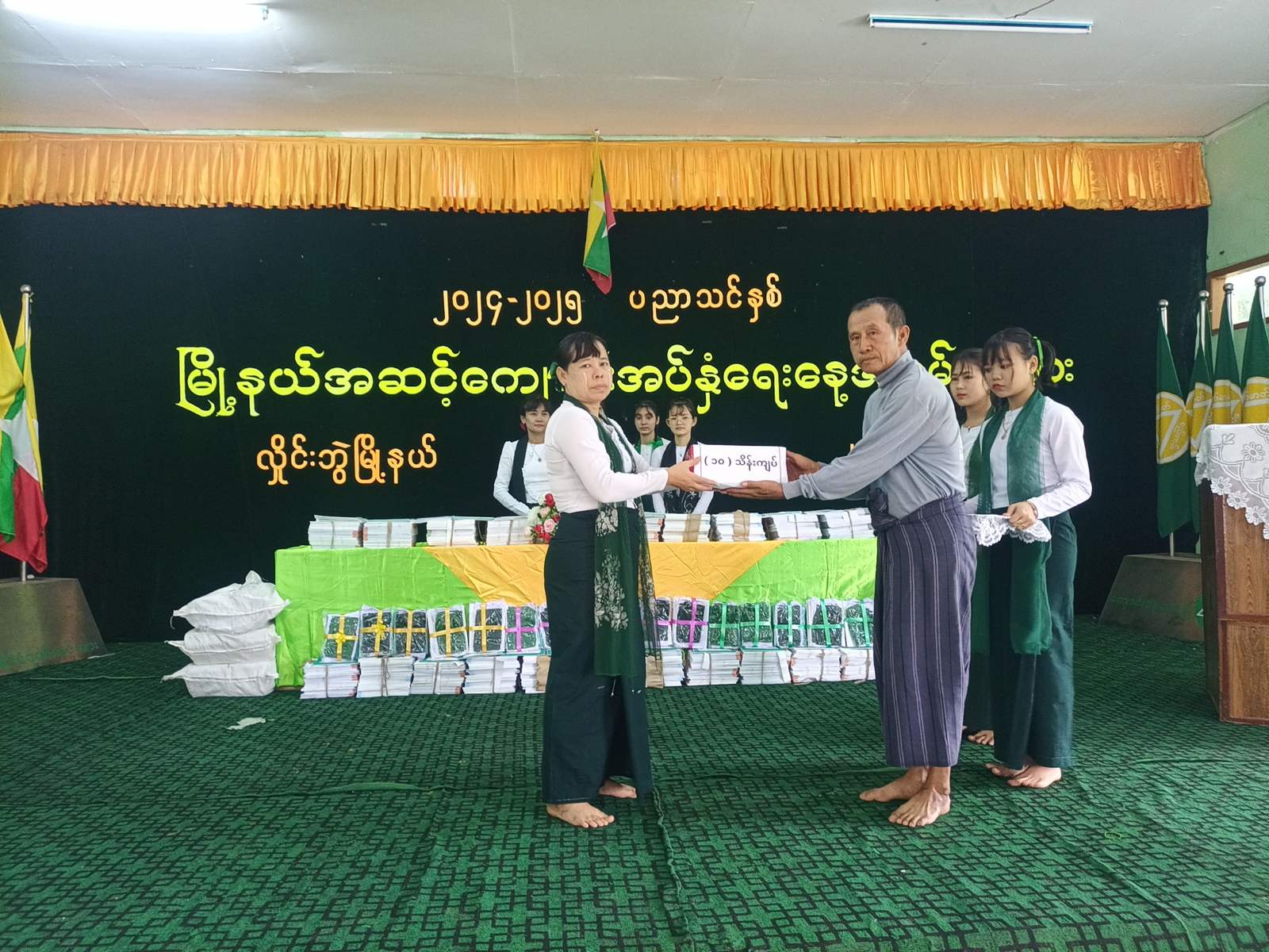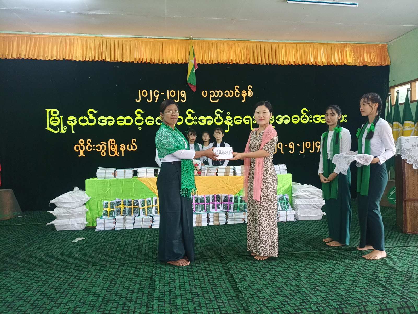 ထို့နောက် အခြေခံပညာ အထက်တန်း၊ အလယ်တန်း၊ မူလတန်းအဆင့် ကျောင်းသား၊ကျောင်းသူလေးများအတွက် ကျောင်းသုံးထောက်ပံ့ပစ္စည်းများအား မြို့နယ်စီမံအုပ်ချုပ်ရေးအဖွဲ့ဥက္ကဋ္ဌ၊ အတွင်းရေးမှူးနှင့် အဖွဲ့ဝင်များက ပေးအပ်ခဲ့ကြသည်။ ဆက်လက်၍ လှိုင်းဘွဲမြို့နယ်အတွင်းရှိ အခြေခံပညာကျောင်းများအတွက် လိုအပ်သည့် တစ်နှစ်စာသောက်ရေသန့်အလှူငွေ၊ ကျောင်းဝေယျာဝစ္စအလှူငွေ၊ ကျောင်းခြံစည်းရိုး အုတ်တံတိုင်းကာရံခြင်းအတွက် အလှူငွေ၊ ကျောင်းဆောင်ကူး စင်္ကြန်လမ်းခင်းခြင်းအတွက်အလှူငွေ၊ ကျောင်းဝင်းစက်ဘီးထားရန်အတွက် အလှူငွေ၊ ကျောင်းအားကစားပစ္စည်းများဝယ်ယူရန်အတွက် အလှူငွေ စုစုပေါင်းငွေကျပ် ၁၁၇သိန်းနှင့် ၅ သောင်းကို စေတနာရှင်ကျောင်းသားမိဘများက ပေးအပ်လှူဒါန်းရာ သက်ဆိုင်သည့် ကျောင်းအုပ်ဆရာမကြီးများက လက်ခံရယူပေးခဲ့ကြပြီးလှိုင်းဘွဲမြို့ အခြေခံပညာ ကျောင်းအုပ်ဆရာမကြီး ဒေါ်နန်းဝင်းရွှေက ကျေးဇူးတင်စကားပြောကြားပေးခဲ့ကြောင်း သိရသည်။
