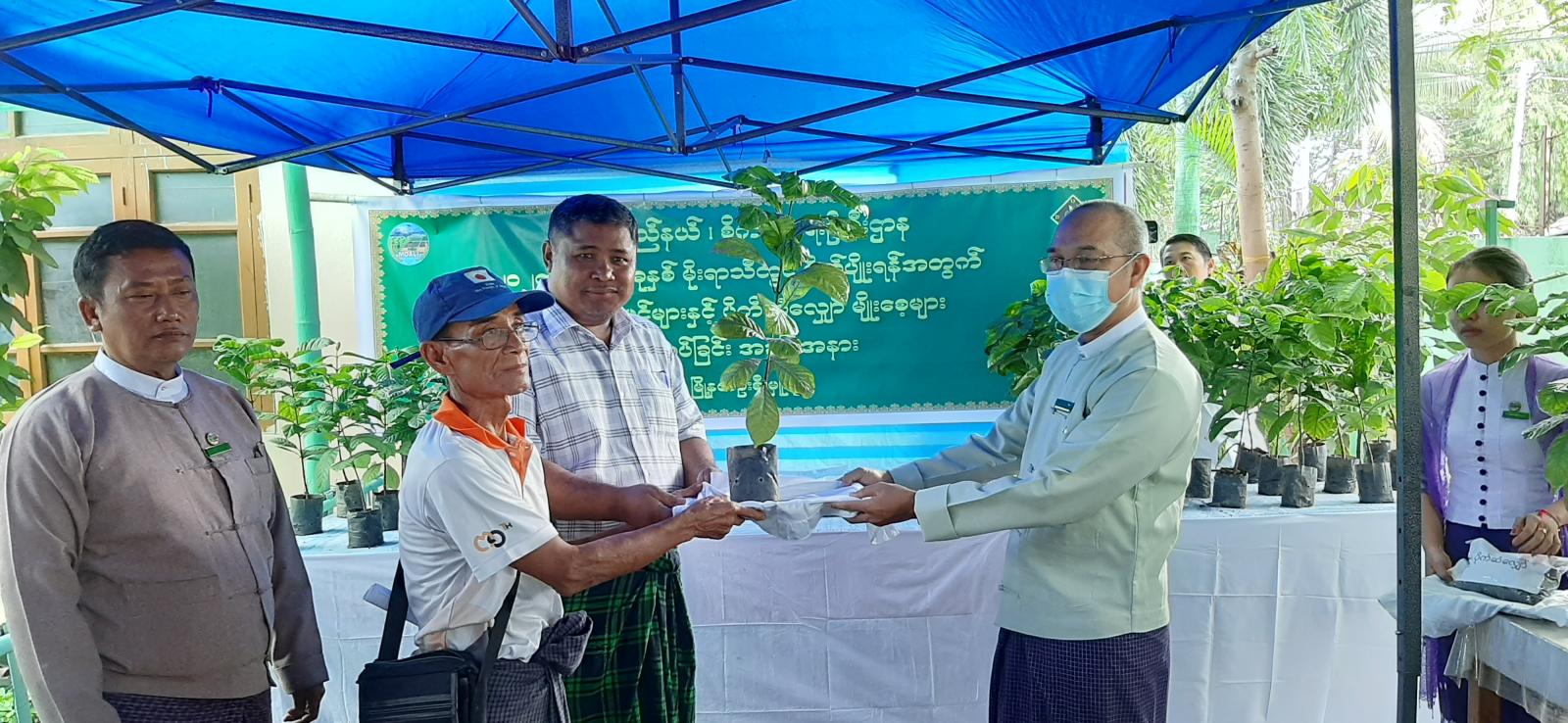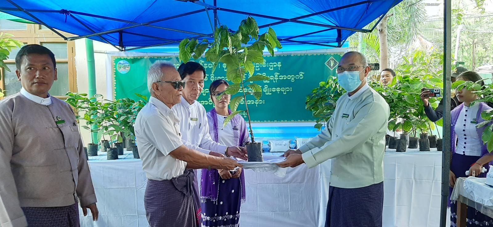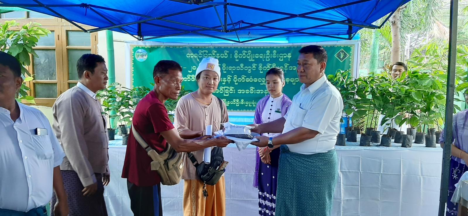 ပေးအပ်ပွဲတွင် မြဝတီခရိုင်စီမံအုပ်ချုပ်ရေးအဖွဲ့ဥက္ကဋ္ဌ ခရိုင်အုပ်ချုပ်ရေးမှူး ဦးကောင်းစံလင်း၊ ခရိုင်စီမံအုပ်ချုပ်ရေးအဖွဲ့မှ အဖွဲ့ဝင်(၂) ဦးစီန်သောင်း၊ မြို့နယ်စီမံအုပ်ချုပ်ရေးအဖွဲ့ ဥက္ကဋ္ဌ မြို့နယ်အုပ်ချုပ်ရေးမှူး ဦးသက်လွင်၊ ခရိုင်စိုက်ပျိုးရေးဦးစီးဌာနမှ ခရိုင်ဦးစီးမှူး ဦးတင်နိုင်ဦး၊ မြို့နယ်စိုက်ပျိုးရေးဌာနမှ မြို့နယ်ဦးစီးမှူး ဦးသန်းရွှေ၊ ခရိုင်နှင့် မြို့နယ်အဆင့် ဌာနဆိုင်ရာ တာဝန်ရှိသူတို့က ရပ်ကွက် ၅ ခုမှ အုပ်ချုပ်ရေးမှူးများနှင့် ကျေးရွာစိုက်ပျိုးရေး တောင်သူများအား စိုက်ဧက ၂၅ ဧကအတွက် ကော်ဖီပျိုးပင် ၁၀၈၈၂ ပင်နှင့် ပိုက်ဆံလျှော်မျိုးစေ့ထုတ်များကို တစ်ဦးချင်းအလိုက် ပေးအပ်သည်။