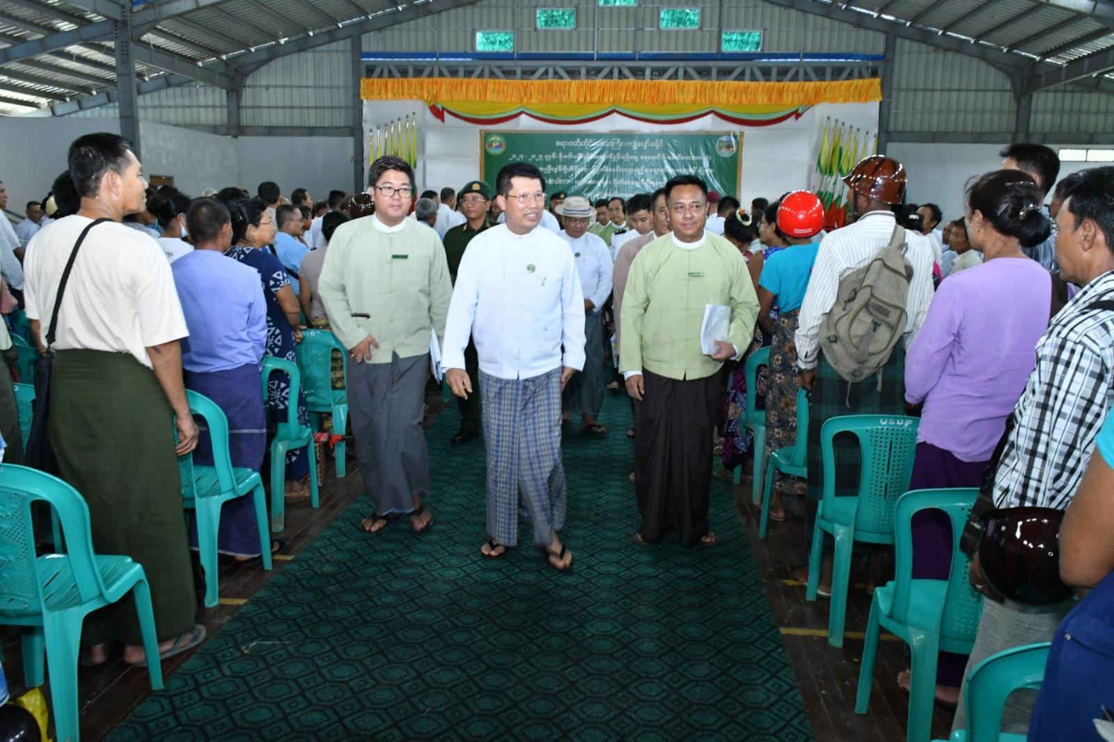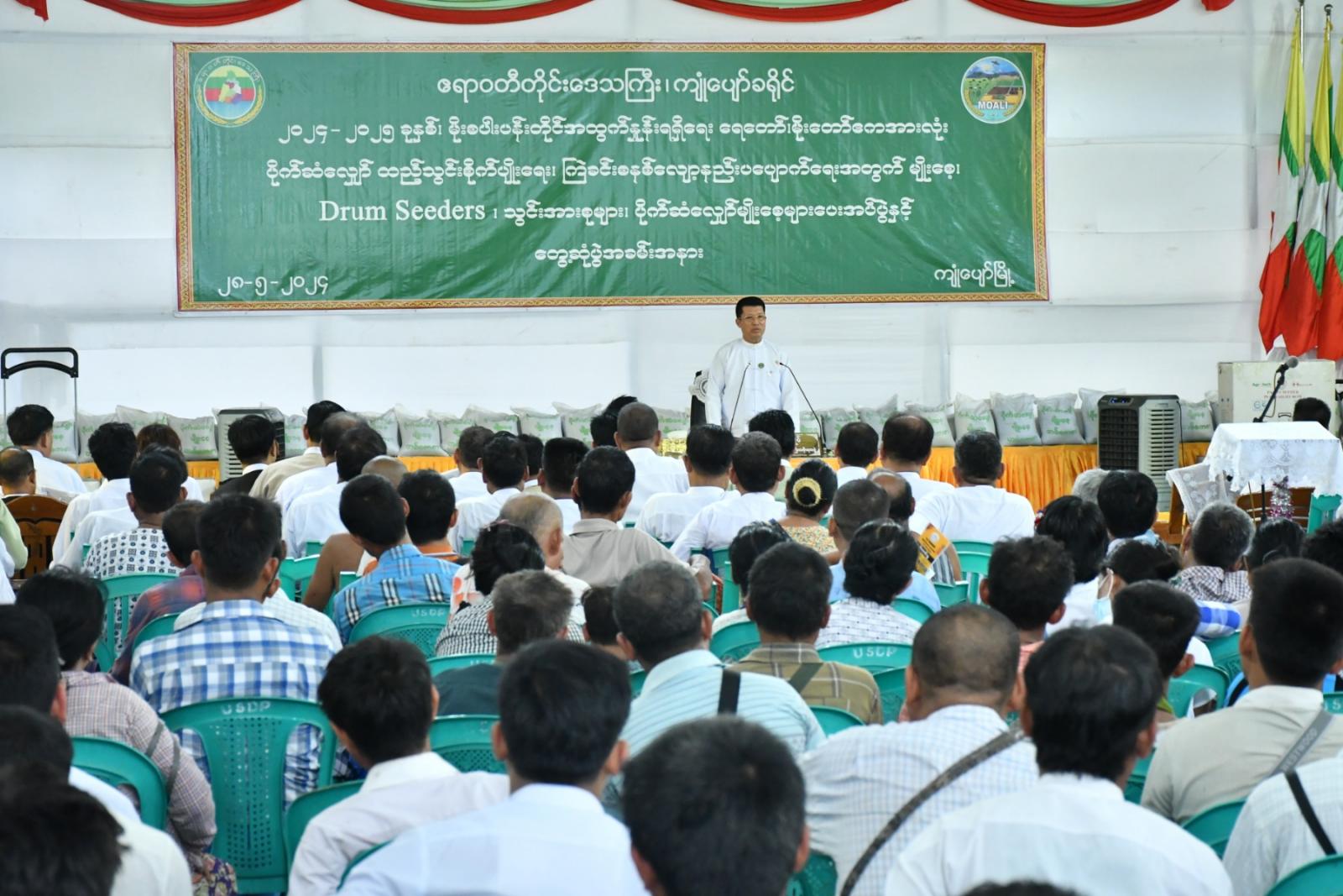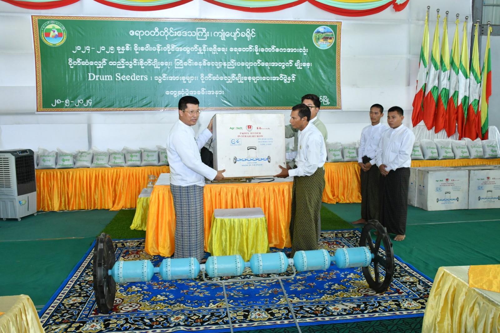 ထို့နောက် တိုင်းဒေသကြီးဝန်ကြီးချုပ်က ကျုံပျော်၊ ရေကြည်၊ ကျောင်းကုန်းမြို့နယ်များမှ တောင်သူများထံသို့ Drum Seeders များကိုလည်းကောင်း၊ လုံခြုံရေးနှင့်နယ်စပ်ရေးရာဝန်ကြီးက ပိုက်ဆံလျှော်မျိုးစေ့များကိုလည်းကောင်း၊ လမ်းပန်းဆက်သွယ်ရေးဝန်ကြီးက သွင်းအားစုများကို လည်းကောင်း အသီးသီးပေးအပ်ခဲ့ပြီး တောင်သူတစ်ဦးက ကျေးဇူးတင်စကား ပြောကြားခဲ့သည်။ ထို့နောက် တိုင်းဒေသကြီးဝန်ကြီးချုပ်သည် အခမ်းအနားသို့တက်ရောက်လာသည့် တောင်သူ များအား ရင်းရင်းနှီးနှီးနှုတ်ဆက်ခဲ့ပြီး ခင်းကျင်းပြသထားသည့် စိုက်ပျိုးရေးသွင်းအားစုများအား ကြည့်ရှုအားပေးခဲ့ကြောင်းသိရသည်။