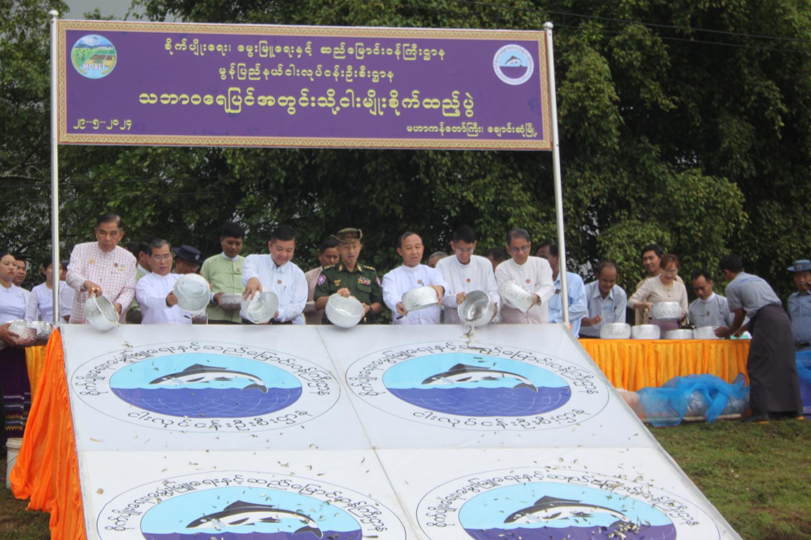 မွန်ပြည်နယ်တွင် ဒေသခံပြည်သူများ ငါးရိက္ခာဖူလုံစေရန် ငါးသယံဇာတ ပေါကြွယ်ဝစေရန် ၊ ငါးမျိုးပြုန်းတီးမှုမှ ကာကွယ်၍ ငါးထုတ်လုပ်မှု တိုးတက်လာစေရန်၊ ဒေသခံပြည်သူများ ငါးရိက္ခာဖူလုံစေရန်နှင့် ငါးမျိုးများ ပွားများလာစေရန်အတွက် ရည်ရွယ်၍ မွန်ပြည်နယ် ငါးလုပ်ငန်းဦးစီးဌာနမှ ငါးသားပေါက်များ ငါးမျိုးစိုက်ထည့်ပွဲ အခမ်းအနားကို ယနေ့နံနက်(၈)နာရီက ချောင်းဆုံမြို့နယ် ချောင်းဆုံအနောက်ရပ်ကွက် မဟာကန်တော်ကြီး ကန်ရေပြင်တွင်ကျင်းပရာ မွန်ပြည်နယ်ဝန်ကြီးချုပ် ဦးအောင်ကြည်သိန်းနှင့် ပြည်နယ်အစိုးရ အဖွဲ့ဝင်ဝန်ကြီးများ တက်ရောက်ခဲ့သည်။