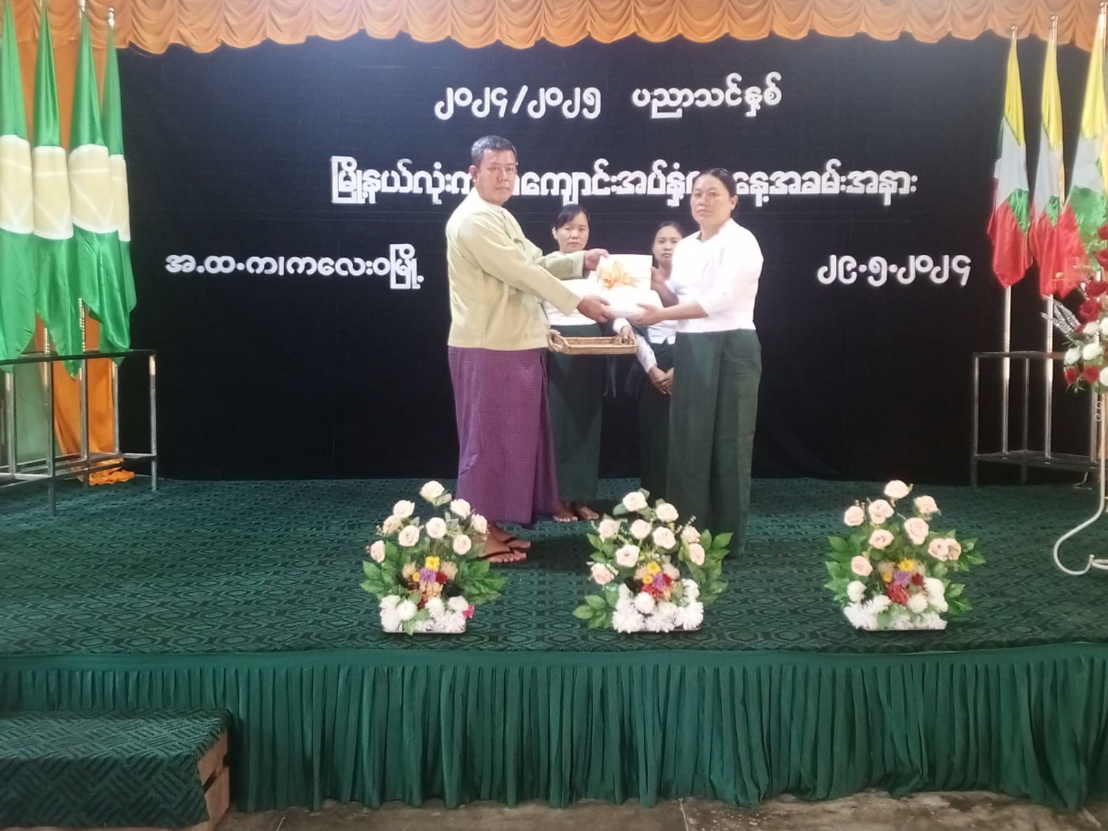 ထို့နောက် နိုင်ငံတော်မှအခမဲ့ပေးအပ်သော ပုံနှိပ်စာအုပ်နှင့် ဗလာစာအုပ်များကို မြို့နယ်စီမံ အုပ်ချုပ်ရေးအဖွဲ့ဥက္ကဋ္ဌက ပေးအပ်ခဲ့ပြီး ဌာနဆိုင်ရာတာဝန်ရှိအကြီးအကဲများ၊ အလှူရှင်များက ကျောင်းနေရန်အခက်အခဲရှိသော ကလေးများအတွက် ထောက်ပံ့ငွေများ ပေးအပ်လှူဒါန်းခဲ့ကြ သည်။