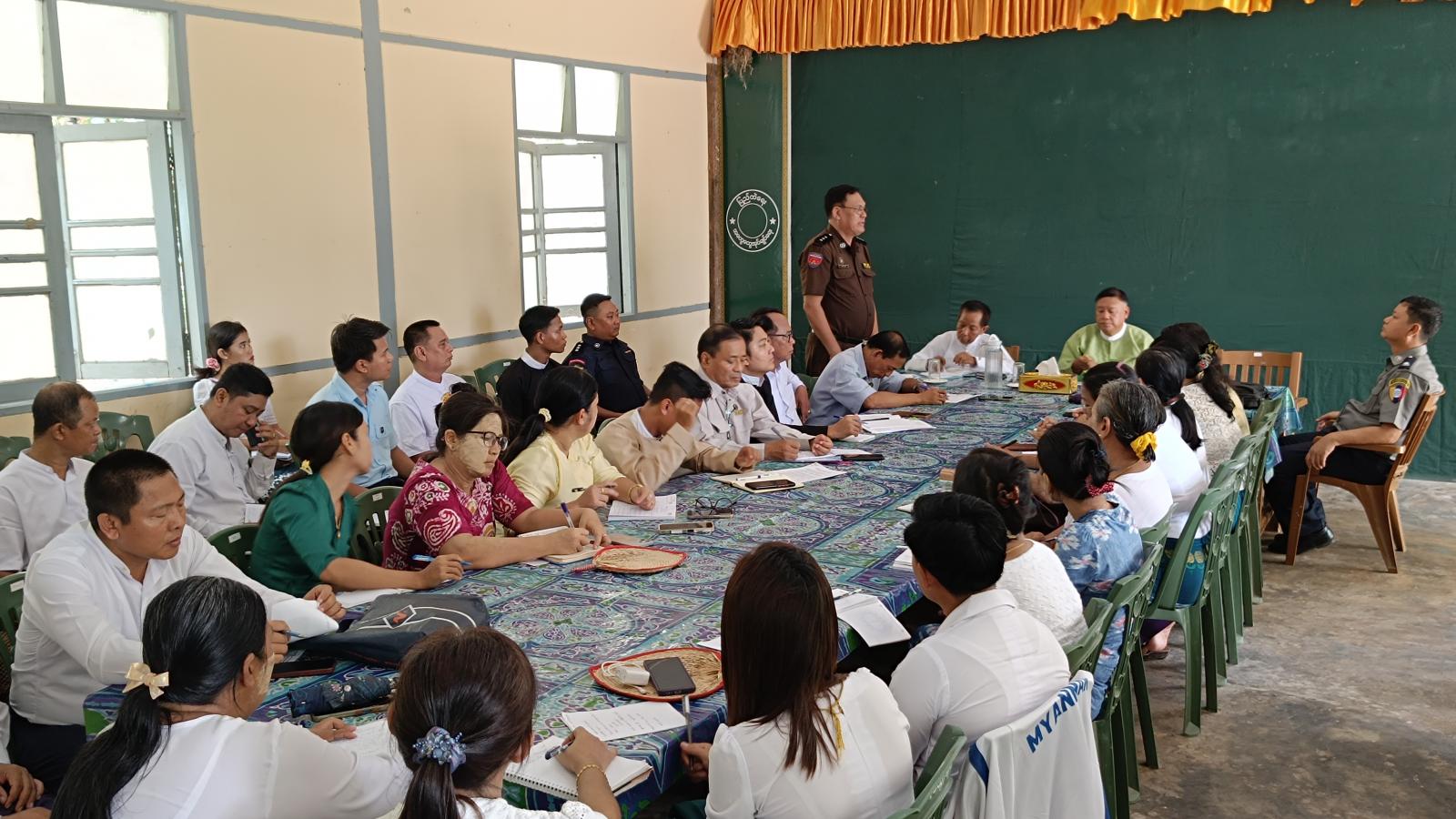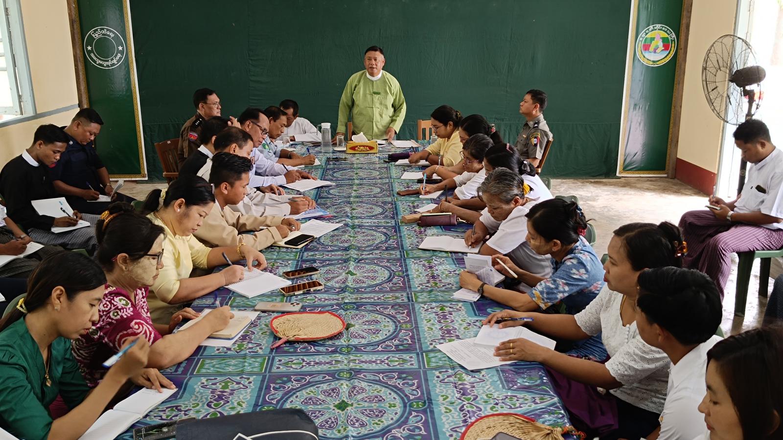 အဆိုပါ အစည်းအဝေးသို့ မြို့နယ်စီမံအုပ်ချုပ်ရေးအဖွဲ့ဥက္ကဋ္ဌနှင့် အဖွဲ့ဝင်များ၊ မြို့နယ်အဆင့် ဌာနဆိုင်ရာအကြီးအကဲများ တက်ရောက်ခဲ့ကြပြီး ပိုက်ဆံလျှော် စိုက်ပျိုးမှု၊ မိုးစပါးစိုက်ပျိုးမှု ကိစ္စရပ်များ၊ မိုးရာသီအားကစားပွဲများ ကျင်းပနိုင်ရေး၊ ဆိုကရေးတီးပြိုင်ပွဲများတွင် ဝင်ရောက်ယှဉ်ပြိုင်နိုင်ရေး၊ ကျောင်းဖွင့်ချိန်အမီ ကျောင်းသား/သူများ ကျောင်းအပ်ပြီး ကျောင်းတက်ရောက်နိုင်ရေး၊ မိုးရာသီရောက်ရှိလာပြီးဖြစ်၍ ဌာနဆိုင်ရာရုံးများအား အရေးကြီးစာရွက်စာတမ်းများ စနစ်တကျထားရှိရေး၊ မြို့နယ်အင်္ဂါရပ်နှင့်အညီ သန့်ရှင်းသာယာလှပစေရေး၊ လမ်းဘေးဝဲယာ သန့်ရှင်းရေးကိစ္စရပ်များ၊ ရုံးတွင်း/ပြင် သန့်ရှင်းရေးကိစ္စရပ်များနှင့် သက်ဆိုင်ရာဌာနအလိုက် ဆောင်ရွက်နေသည့် ကိစ္စရပ်များအား ညှိနှိုင်းဆွေးနွေးခဲ့ကြကြောင်း သိရသည်။