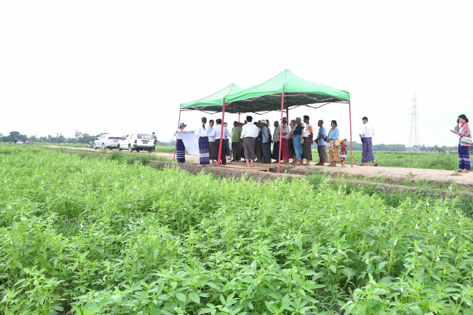 ထို့နောက် နေပြည်တော်ကောင်စီဝင် ဦးဇေယျာလင်းနှင့် တာဝန်ရှိသူများက အင်ဘက်ကုန်းကျေးရွာ၊ စနစ်တကျလယ်မြေအတွင်း ဘောင်ကြီးတင်စနစ်ဖြင့် စိုက်ပျိုးထားသော နွေနှမ်း ၁၁၂ ဧက စိုက်ကွင်းသို့ ရောက်ရှိ၍ နှမ်းစိုက်တောင်သူများနှင့်တွေ့ဆုံကာ မြို့နယ်စိုက်ပျိုးရေးဦးစီးဌာနမှ ဦးစီးအရာရှိ ဦးထွန်းညွန့်က ရေရရှိရေးနည်းလမ်းအလိုက် နွေ၊ မိုးကြို သီးနှံစိုက်ပျိုးထားရှိမှုအခြေအနေ၊ နွေစပါး၊ နွေနှမ်းစိုက်ပျိုးမှုအခြေအနေများ၊ ချည်မျှင်ရှည်ဝါနှင့် မိုးစပါးစိုက်ပျိုးအခြေအနေများ ရှင်းလင်းတင်ပြပြီးနောက် နေပြည်တော်ကောင်စီဝင် ဦးဇေယျာလင်းက တောင်သူများ နွေစပါး၊ မိုးစပါးများ ကြဲပက်စနစ်ပပျောက်ရေး ရှင်းလင်းမှာကြားခဲ့သည်။
