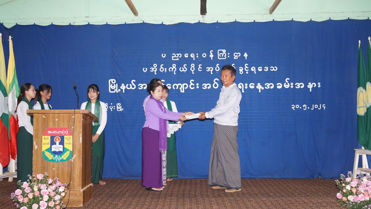 ထို့နောက် ပအိုဝ်းကိုယ်ပိုင်အုပ်ချုပ်ခွင့်ရဒေ စီမံအုပ်ချုပ်ရေးအဖွဲ့ဥက္ကဋ္ဌ ဦးခွန်ရဲထွေးက ပအိုဝ်းကိုယ်ပိုင်အုပ်ချုပ်ခွင့်ရဒေသ စီမံအုပ်ချုပ်ရေးအဖွဲ့၊ မြို့နယ်စီမံအုပ်ချုပ်ရေးအဖွဲ့နှင့် အလှူရှင်များမှထောက်ပံ့ပေးအပ်သည့် ကျောင်းသုံးဗလာစာအုပ်၊ စာရေးကိရိယာများကိုလည်းကောင်း၊ မြို့နယ်မိခင်နှင့်ကလေးစောင့်ရှောက်ရေးအသင်းနှင့် အမျိုးသမီးရေးရာအဖွဲ့တို့က ထောက်ပံ့ငွေများကိုလည်းကောင်း တာဝန်ရှိသူများအား အသီးသီးပေးအပ်ခဲ့ကြပြီး အမှတ်(၁)အခြေခံပညာအထက်တန်းကျောင်း ကျောင်းသား၊ ကျောင်းသူများက “ဇာတိမာန်”သီချင်းဖြင့် သီဆိုဖျော်ဖြေခဲ့ကြောင်းသိရသည်။