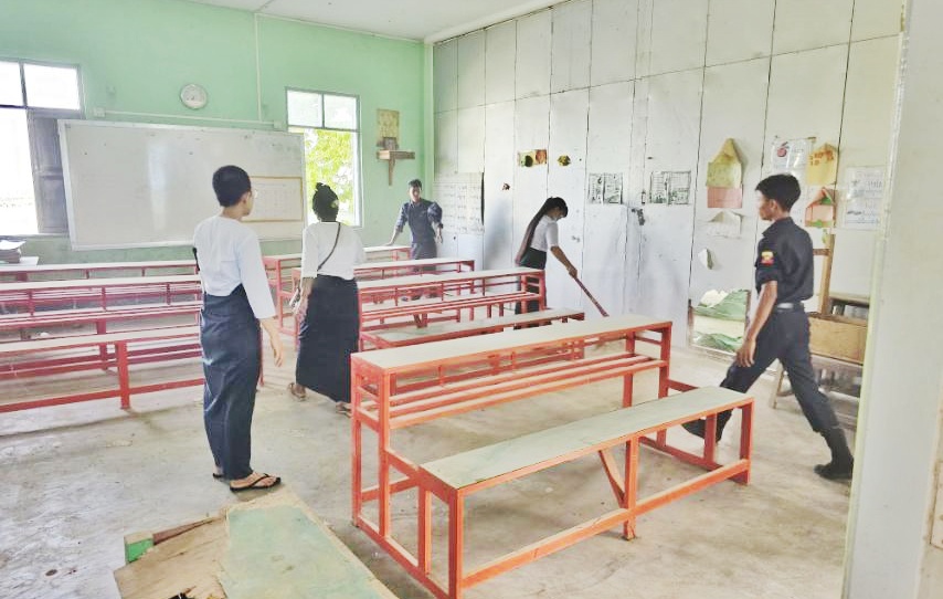 ကျောင်းဖွင့်ချိန်အမီ စာသင်ကျောင်းများ သန့်ရှင်းသာယာလှပရေး၊ ဥပဓိရုပ်ကောင်းမွန်ရေးအတွက် စုပေါင်းသန့်ရှင်းရေးဆောင်ရွက်ခြင်းကို ယနေ့နံနက် ၈ နာရီက မန္တလေးတိုင်းဒေသကြီး၊ အောင်မြေသာစံမြို့နယ်၊ ညောင်ကွဲရပ်ကွက်၊ အကွက်(၅)ရှိ အမှတ်(၃၈)အခြေခံပညာအထက်တန်းကျောင်းတွင် စုပေါင်းပြုလုပ်ကြသည်။