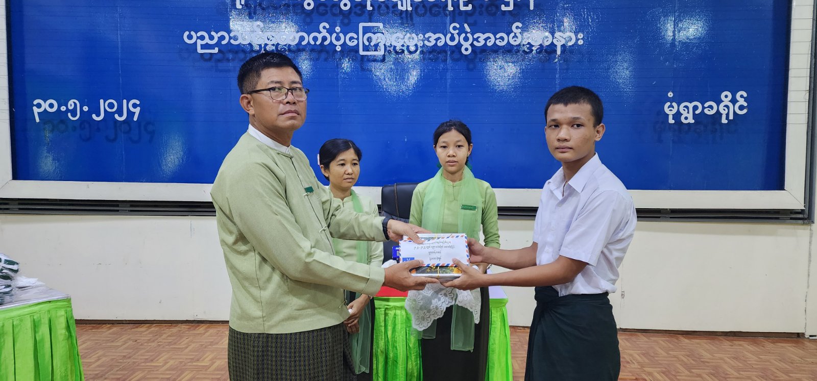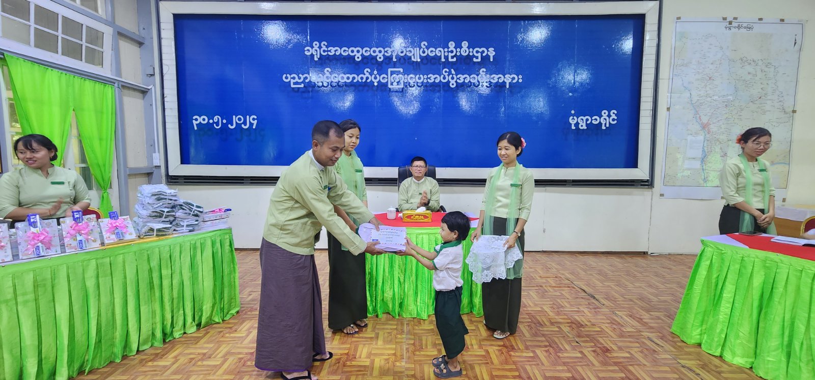 ယနေ့ ကျင်းပပြုလုပ်သော ပညာသင်ထောက်ပံ့ကြေးပေးအပ်ပွဲ အခမ်းအနားတွင် ခရိုင် အထွေထွေအုပ်ချုပ်ရေးဦးစီးဌာန ဝန်ထမ်းများ၏ သားသမီးများဖြစ်ကြသော တက္ကသိုလ်အဆင့် တွင် ပညာသင်ကြားနေကြသည့် ကျောင်းသား/သူ(၂)ဦး၊ အထက်တန်းအဆင့်တွင် ပညာသင်ကြားနေသည့် ကျောင်းသား၊ ကျောင်းသူ(၃)ဦး၊ အလယ်တန်းအဆင့်တွင် ပညာသင်ကြားနေသည့် ကျောင်းသား၊ ကျောင်းသူ(၅)ဦး၊ မူလတန်းအဆင့်တွင် ပညာသင်ကြားနေသည့် ကျောင်းသား၊ ကျောင်းသူ (၁ဝ)ဦး၊ စုစုပေါင်း(၂၀)ဦးတို့အတွက် တက္ကသိုလ်အဆင့်အတွက် တစ်ဦးလျှင် (၁၀၀၀၀၀ိ/)ကျပ်နှုန်းဖြင့်လည်းကောင်း၊ အထက်တန်းအဆင့်အတွက် တစ်ဦးလျှင် (၈၀ဝဝဝိ/) ကျပ်နှုန်းဖြင့်လည်းကောင်း၊ အလယ်တန်းအဆင့်အတွက် တစ်ဦးလျှင် (၆၀၀၀၀ိ/) ကျပ်နှုန်းဖြင့် လည်းကောင်း၊ မူလတန်းအဆင့်အတွက် တစ်ဦးလျှင် (၄၀၀၀၀ိ/)ကျပ်နှုန်းဖြင့်လည်းကောင်း၊ ပညာသင်စရိတ် ထောက်ပံ့ငွေ စုစုပေါင်းငွေကျပ် (၁၁၄၀၀၀၀ိ/)တို့အပြင် မူလတန်း၊ အလယ်တန်းနှင့် အထက်တန်းကျောင်းသား/သူများအတွက် ဗလာစာအုပ် (၁)ဒါဇင်စီနှင့် ဘောပင်၊ ခဲတံများ အတွက် ကုန်ကျငွေ (၂၃၅၀၀ဝိ/) တို့အပါအဝင် စုစုပေါင်းထောက်ပံ့ငွေကျပ် (၁၃၇၅၀၀၀ိ/) ကို အသီးသီးပေးအပ်ခဲ့ကြောင်း သိရသည်။