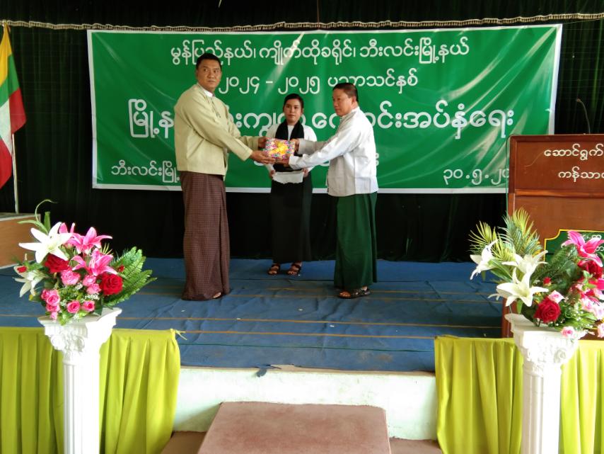 ဆက်လက်၍ ဘီးလင်းမြို့နယ်စီမံအုပ်ချုပ်ရေးအဖွဲ့ဥက္ကဋ္ဌ ဦးစည်သူအောင်၊ ဘီးလင်းမြို့နယ်ရဲတပ်ဖွဲ့မှူး ရဲမှူးမင်းတင်၊ မြို့နယ်စည်ပင်သာယာရေးအဖွဲ့မှ အမှုဆောင်အရာရှိ ဦးသိန်းသန်းစိုးတို့က နိုင်ငံတော်မှထောက်ပံ့ပေးအပ်သော ကျောင်းသုံးပုံနှိပ်စာအုပ်၊ ဗလာစာအုပ်၊ ဘောပင်၊ ခဲတံ၊ ကျောင်းဝတ်စုံများအား သက်ဆိုင်ရာကျောင်းအလိုက် ကျောင်းအုပ်ဆရာကြီး၊ ဆရာမကြီးများထံသို့ လွှဲပြောင်းပေးအပ်ခဲ့ကြောင်း သိရသည်။