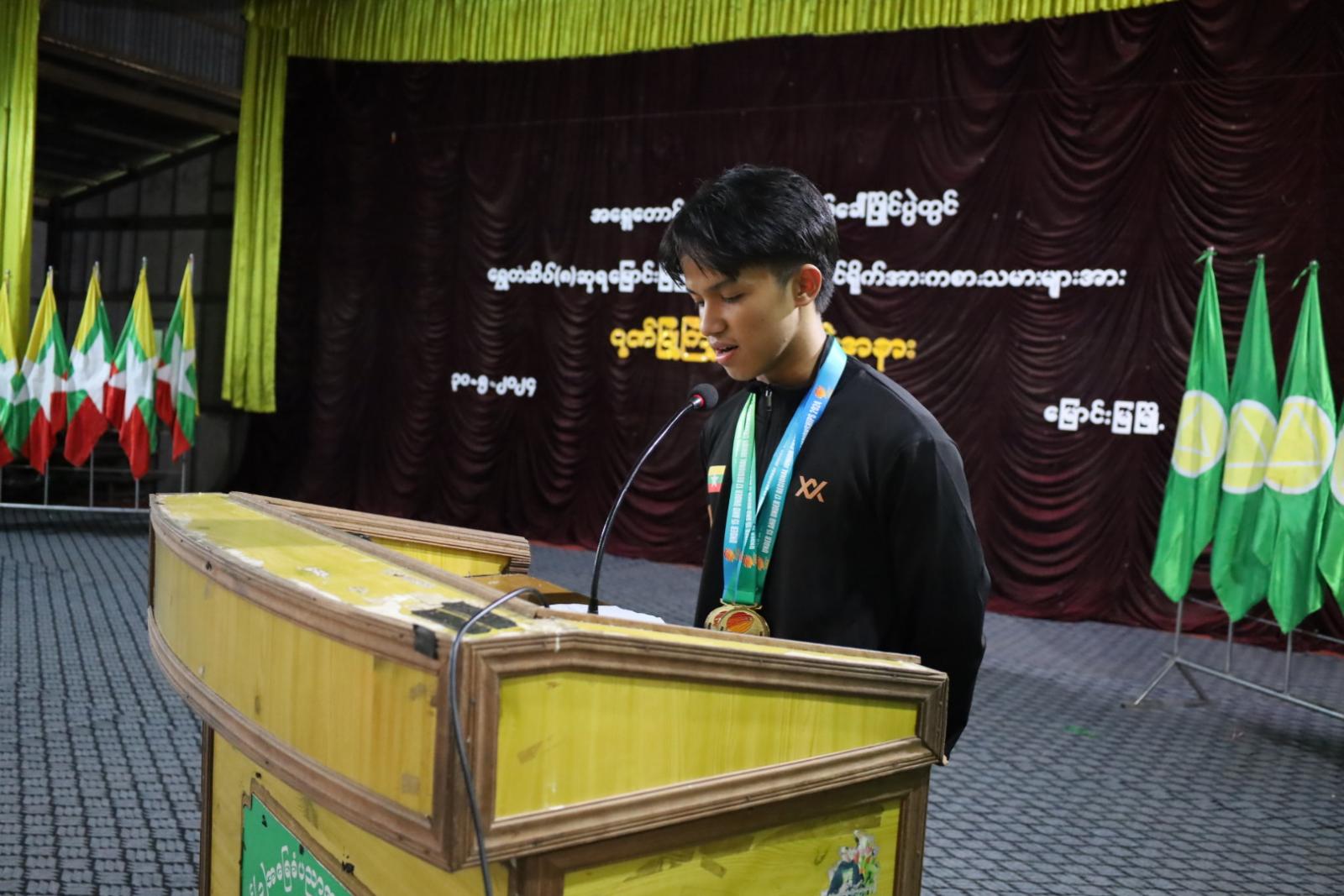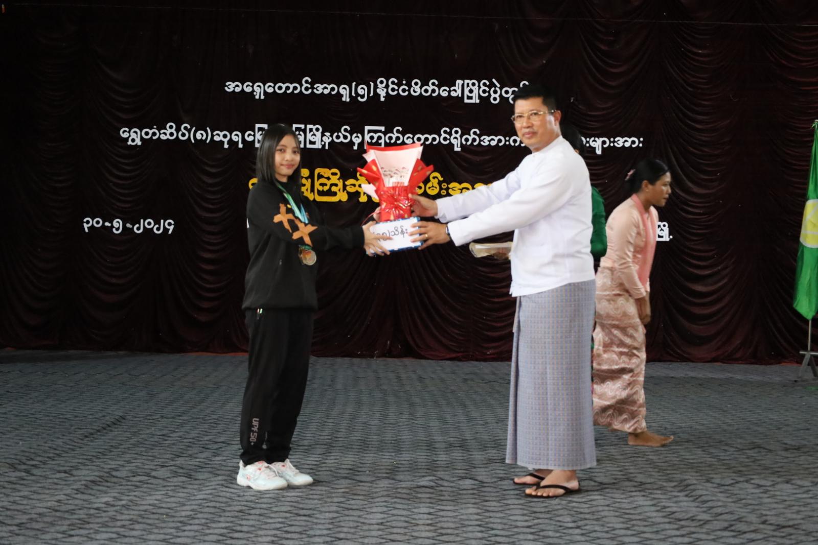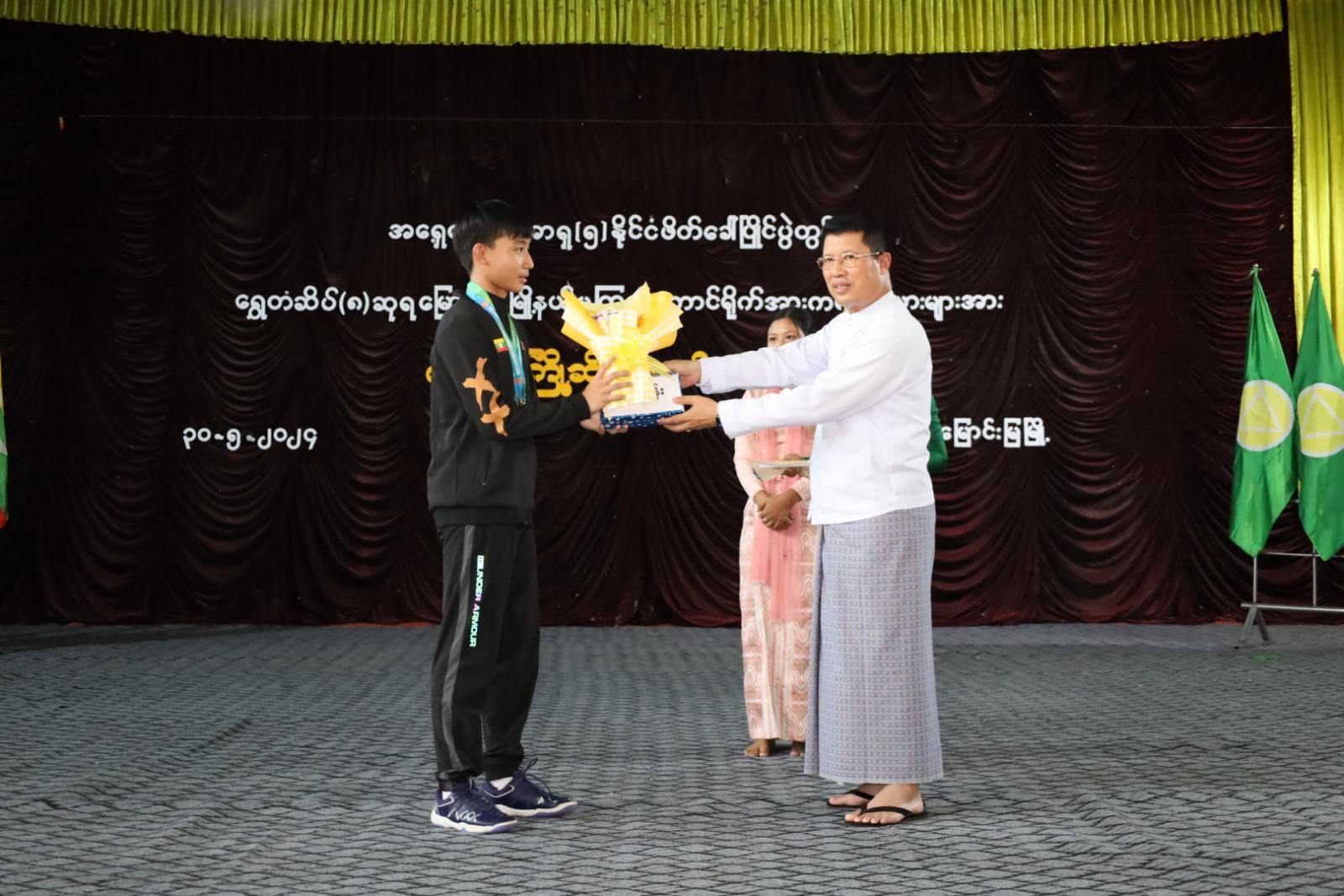 ရှေးဦးစွာ ဧရာဝတီတိုင်းဒေသကြီး၊ အစိုးရအဖွဲ့ဝန်ကြီးချုပ် ဦးတင်မောင်ဝင်းက ဂုဏ်ပြု အမှာစကားပြောကြားခဲ့ပြီး၊ မြောင်းမြမြို့၊ အမှတ် (၁) အခြေခံပညာအထက်တန်းကျောင်းမှ နိုင်ငံ ဂုဏ်ဆောင်အားကစားသမားများက တစ်ဦးချင်းမိတ်ဆက်စကား ပြောြကား၍ အားကစား သမားများကိုယ်စား ရွှေတံဆိပ် (၃) ဆုနှင့် ငွေတံဆိပ် (၁) ဆုရ အားကစားသမား မောင်ဟိန်းသီဟအောင်က ပြိုင်ပွဲအတွေ့အကြုံများအား ရှင်းလင်းပြောကြားခဲ့သည်။ ဆက်လက်၍ ဧရာဝတီတိုင်းဒေသကြီး အစိုးရအဖွဲ့မှ ပေးအပ်သော ထောက်ပံ့ငွေ (၉၃၀၀၀၀၀) ကျပ်၊ မြောင်းမြခရိုင်/မြို့နယ်စီမံအုပ်ချုပ်ရေးအဖွဲ့မှ ပေးအပ်သော ထောက်ပံ့ငွေ (၈၅၀၀၀၀) ကျပ်နှင့် အမျိုးသမီးရေးရာအဖွဲ့နှင့် မိခင်နှင့်ကလေးစောင့်ရှောက်ရေးအဖွဲ့တို့မှ ပေးအပ်သောထောက်ပံ့ငွေ (၁၀၀၀၀၀) ကျပ် စုစုပေါင်း (၁၀၂၅၀၀၀၀) ကျပ်အား တာဝန်ရှိသူများက ပေးအပ်ချီးမြှင့်ခဲ့ရာ နိုင်ငံ့ဂုဏ်ဆောင် အားကစားသမားများက လက်ခံရယူခဲ့ကြောင်းသိရသည်။ ထို့နောက် မြောင်းမြခရိုင်စီမံအုပ်ချုပ်ရေးအဖွဲ့ ဥက္ကဋ္ဌ ဦးစန်းဌေးက ဂုဏ်ပြုကျေးဇူးတင်စကားပြောကြား ခဲ့သည်။