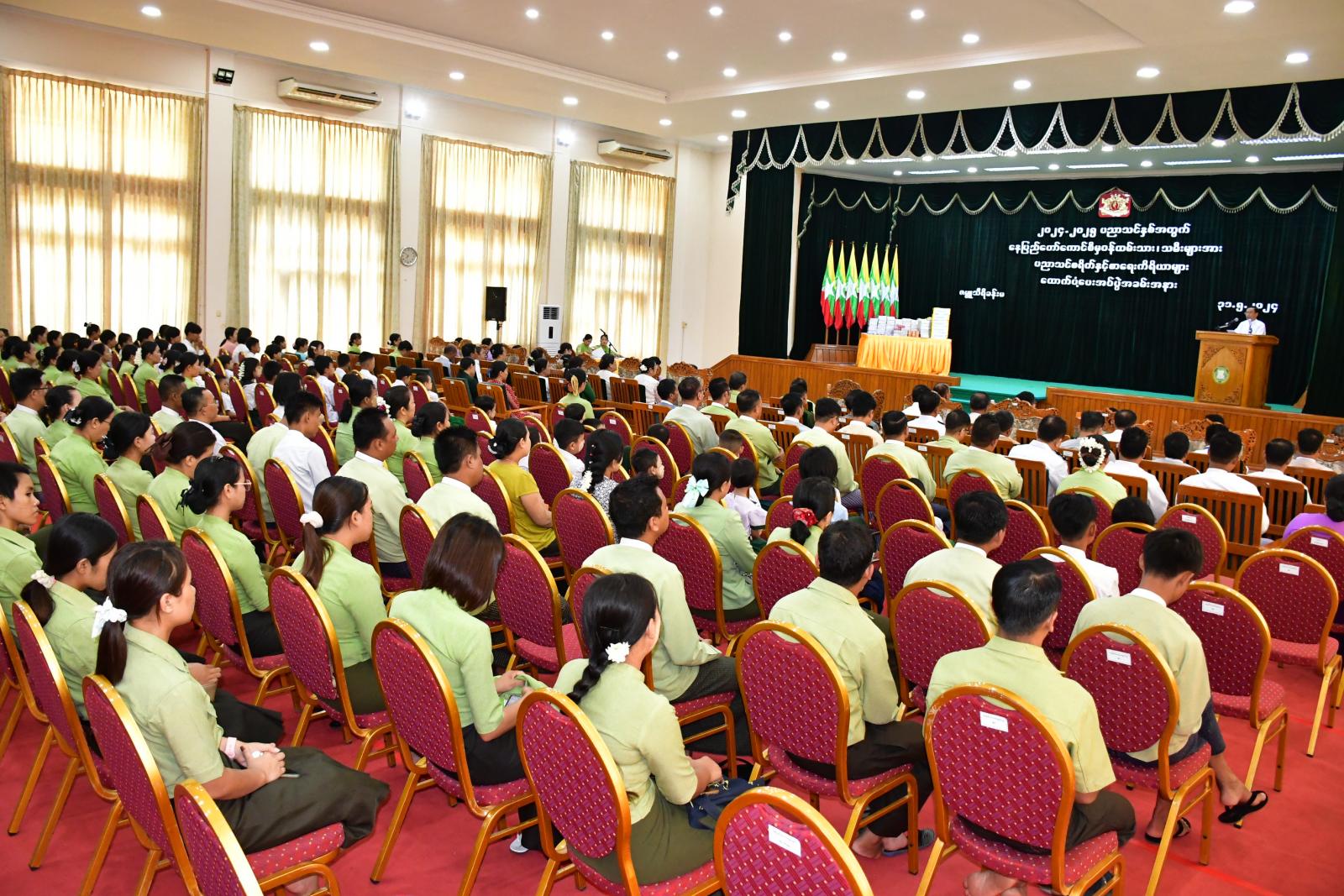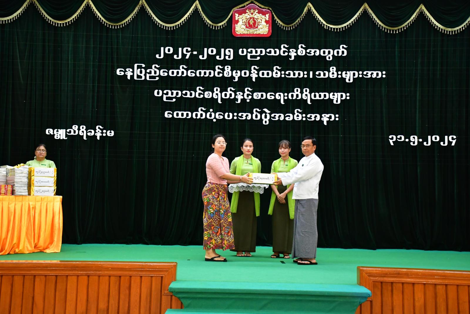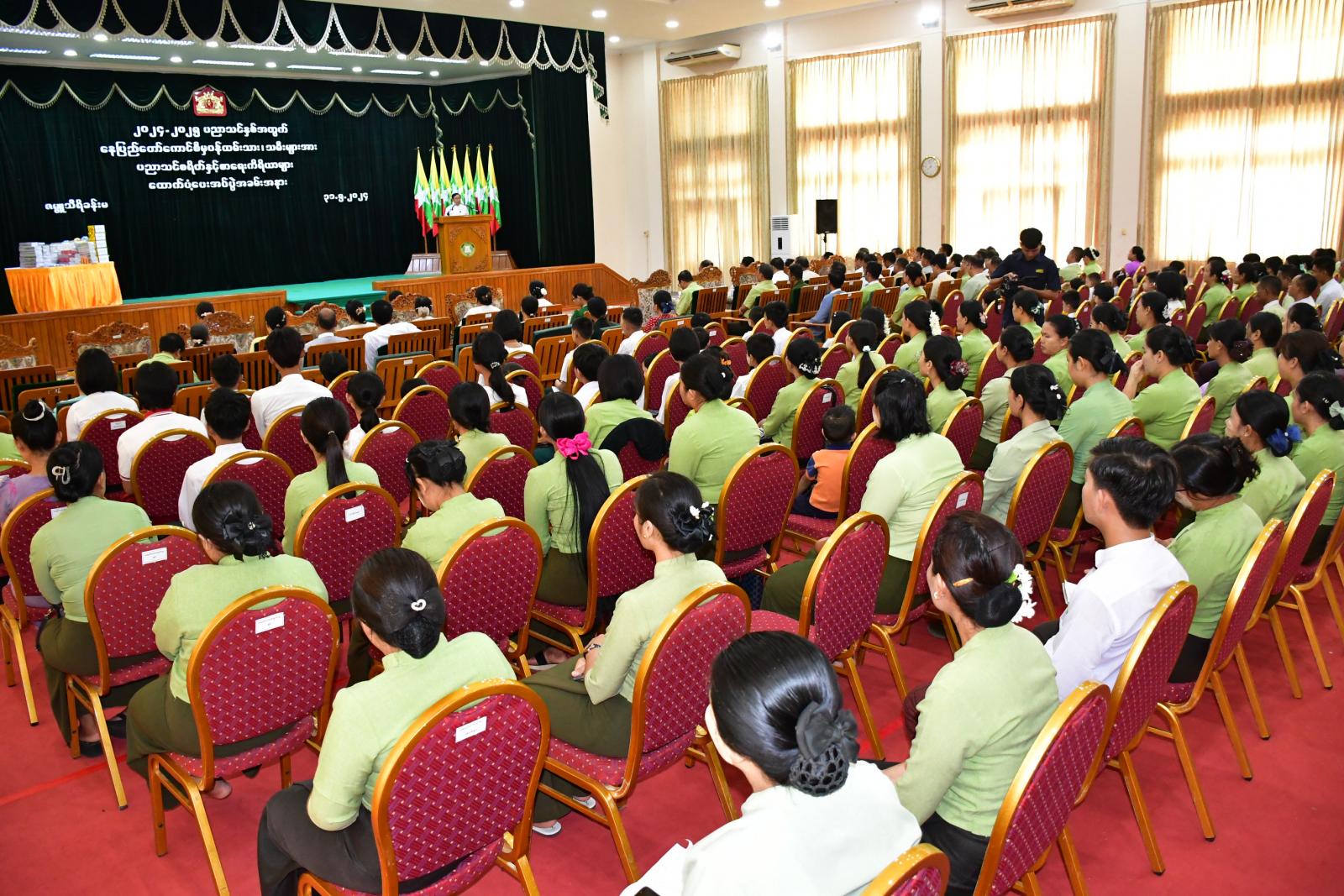 ၂၀၂၄-၂၀၂၅ ပညာသင်နှစ်၊ နေပြည်တော်ကောင်စီမှ ဝန်ထမ်းသား/သမီးများအား ပညာသင်စရိတ်နှင့် စာရေးကိရိယာများ ထောက်ပံ့ပေးအပ်ပွဲ အခမ်းအနားကို ယနေ့နံနက် ၈ နာရီတွင် နေပြည်တော်ကောင်စီရုံး ဇမ္ဗူသီရိခန်းမ၌ ကျင်းပရာ နေပြည်တော်ကောင်စီဥက္ကဋ္ဌ ဦးသန်းထွန်းဦး နှင့်ဇနီး၊ နေပြည်တော်ကောင်စီဝင်များနှင့် ၎င်းတို့၏ ဇနီးများ၊ နေပြည်တော်ကောင်စီအတွင်းရေးမှူး နှင့်ဇနီး၊ နေပြည်တော်အဆင့်ဌာနဆိုင်ရာများ၊ ခရိုင်/မြို့နယ်စီမံအုပ်ချုပ်ရေးအဖွဲ့များ၊ နေပြည်တော် မိခင်နှင့်ကလေးစောင့်ရှောက်မှုကြီးကြပ်ရေးအဖွဲ့ နာယက ဒေါ်သီတာဇင်၊ နေပြည်တော်အမျိုးသမီးရေးရာနှင့် နေပြည်တော် မိခင်နှင့်ကလေး စောင့်ရှောက်မှုကြီးကြပ်ရေးအဖွဲ့များမှ တာဝန်ရှိသူများ၊ နေပြည်တော်ကောင်စီမှ ဝန်ထမ်းများနှင့် ကျောင်းသား/ကျောင်းသူများ တက်ရောက်ကြသည်။