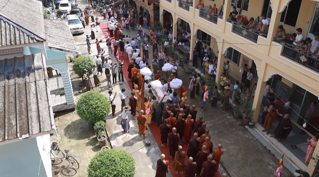 အဆိုပါ အခမ်းအနားတွင် ကြွရောက်လာကြသူများက နမောတဿ (၃) ကြိမ်ရွတ်ဆို ဘုရားကန်တော့၍ အခမ်းအနားဖွင့်လှစ်ခဲ့ကြပြီး သံဃာတော်အရှင်သူမြတ်များမှ ဦးဆောင်၍ “သဗ္ဗေ သင်္ခါရာ”စသော သံဝေဇနယဂါထာတော်များဖြင့် သံဝေဂဉာဏ်ဖြစ်စေရန် မရဏနုဿတိဘာဝနာ ပွားများတော်မူခြင်း၊ အတွင်းပတ္တမြား ပရိယတ္တိစာသင်တိုက်ကြီး၏ ဦးစီးပဓာနနာယက၊ အဘိဓဇမဟာရဌဂုရု၊ နိုင်ငံတော်ဩဝါဒါစရိယ ဘန္တဒ္ဒ အရိယဝံသ၏ “ထေရ်ရုပ္ပတ္တိ သင်္ခေပကထာ”ကို ဖတ်ကြားပူဇော်ခြင်း၊ “နိမန္တနာကာရ” ဂါထာ တော်အားရွတ်ဖတ်ပူဇော်၍ အခါတော်ကြားခြင်း၊ အတွင်းပတ္တမြားပရိယတ္တိစာသင်တိုက်ကြီး၏ တိုက်အုပ်ဆရာတော် ဘဒ္ဒန္တဝိလာသ မှဦးဆောင်၍ တပည့်ဒါယိကာ/ဒါယိကာမများနှင့်အတူ “အစ္စယောနောဘန္တေ” အစချီသော တောင်းပန်ဝန်ချ ကန်တော့လွှာဖြင့် ရှိခိုးကန်တော့ခြင်း၊ ဆရာတော်ကြီးအား စံကျောင်းတော်သို့ ကြွရောက်တော်မူပါရန် “နိမန္တန” ဂါထာ၊ “သံဝေဂ” ဂါထာများဖြင့် ရွတ်ပွားပူဇော်ခြင်းတို့ဆောင်ရွက်ခဲ့ကြပြီး ရုပ်ကလာပ်တော်အား ယာယီစံကျောင်းတော်သို့ အစီအစဉ်အတိုင်း ပင့်ဆောင်ခဲ့ကြသည်။ ထို့နောက် သဘင်/ဂီတ အနုပညာရှင်များနှင့်ပူးပေါင်းကာ နတ်များမှ “ထီးဖွင့် ခန်းဖွင့်” အနုပညာရသဖြင့် ပူဇော်ခြင်း တို့ ဆောင်ရွက်ခဲ့ကြောင်းသိရသည်။