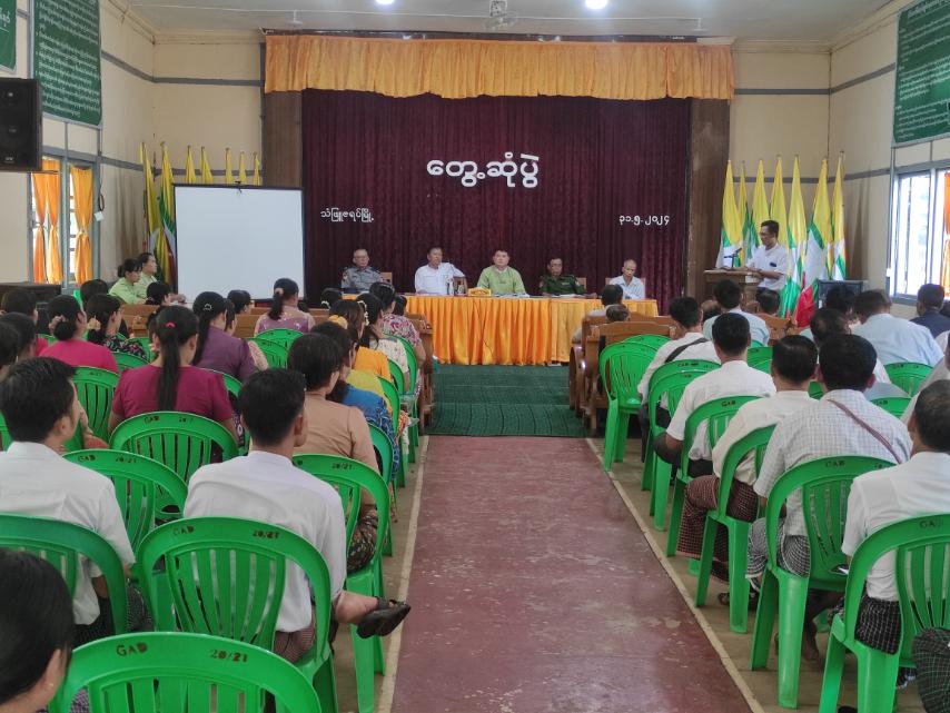 ရှေးဦးစွာ မြို့နယ်စီမံအုပ်ချုပ်ရေးအဖွဲ့ဥက္ကဋ္ဌ ဦးအောင်မိုးလွင်က အခြေခံပညာကျောင်းများ ပြန်လည်ဖွင့်လှစ်မည်ဖြစ်၍ ကျောင်းနှင့်ဝန်းကျင်သန့်ရှင်းရေးများကို အပတ်စဥ်စနေနေ့တိုင်း စုပေါင်းသန့်ရှင်းရေးဆောင်ရွက်ရန်၊ သွေးလွန်တုပ်ကွေးရောဂါဖြစ်ပွားမှုများရှိနေ၍ အခြေခံပညာကျောင်းများအားလုံး အပတ်စဥ်သောကြာနေ့တိုင်း မိမိတို့ကျောင်းခန်းရှိ ရေအိုးရေခွက်များ၊ ဘုရားညောင်ရေအိုးများရှိ ရေများကိုသွန်ပြီး မှောက်သွားကြစေရေး၊ ပြည်သူ့စစ်မှုထမ်းဥပဒေဆိုင်ရာ အကြောင်းအရာများကို ချပြရှင်းလင်းခြင်း၊ မိုးစပါးများလျာထားချက်ပြည့်မီရေး၊ သဘာဝဘေးဖြစ်ပေါ်လာပါက အချိန်မီသတင်းပေးပို့နိုင်ရေး၊ လုံခြုံရေးများ အထူးအလေးထားဆောင်ရွက်ရန် ရှင်းလင်းပြောကြားသည်။