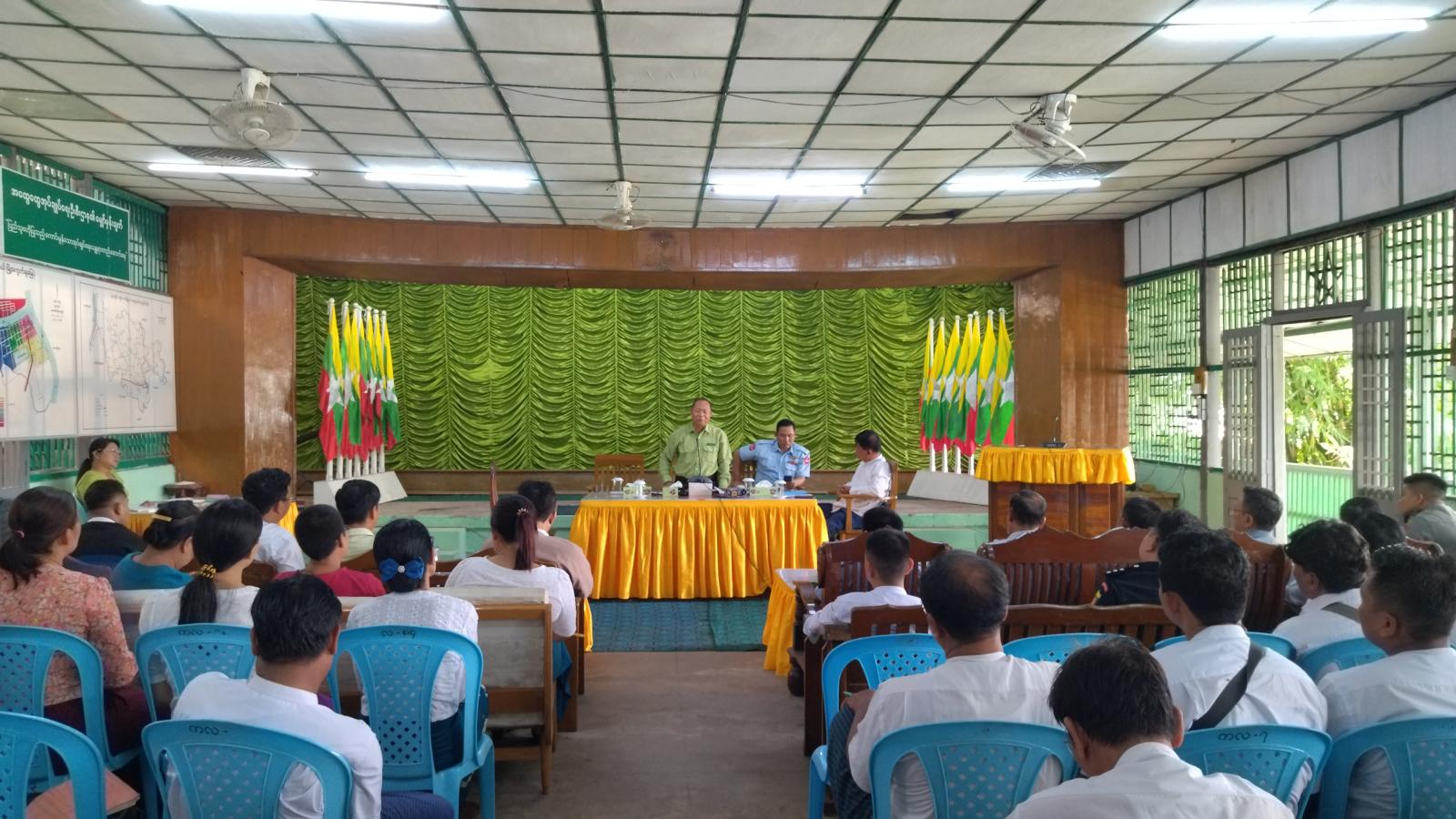 အစည်းအဝေးတွင် မြို့နယ်စီမံအုပ်ချုပ်ရေးအဖွဲ့ ဥက္ကဋ္ဌ ဦးမင်းအောင်၊ အဖွဲ့ဝင်(၁)ဗိုလ်မှူးရဲမင်း၊ အဖွဲ့ဝင်(၂) ဦးစိန်မြင့်နှင့်အဖွဲ့ဝင် (၃) ဦးထွန်းဆွေတို့က လုံခြုံရေးနှင့် ပတ်သက်၍ မိမိတို့ရပ်ရွာတွင် ထူးခြားမှုရှိပါက မြို့နယ်သို့အချိန်မီသတင်းပေးပို့ကြရန်၊ ရပ်ရွာများတွင် လောင်းကစားဝိုင်းများ မဖြစ်ပေါ်စေရေးနှင့်ဖြစ်ပေါ်ပါက အချိန်မီ သတင်းပေးပို့ကြရန်၊ နယ်မြေအတွင်း လူစိမ်းများတွေ့ပါက သတိထားနေထိုင်ကြရန်၊ လုံခြုံရေးအသိ၊ လုံခြုံရေးသတိများဖြင့်နေထိုင်ကြပြီး ကျေးရွာဝင်ပေါက် ထွက်ပေါက်များကို မီးကင်းနှင့်လုံခြုံရေးအဖွဲ့များထားရန်၊ စိုက်ပျိုးရေးနှင့်မွေးမြူရေးလုပ်ငန်းများ ပိုမိုတိုးတက်အောင်ဆောင်ရွက်ရန်၊ ဌာနဆိုင်ရာများနှင့် ပူးပေါင်းကူညီဆောင်ရွက်ရန်၊ မိမိရပ်ရွာဒေသများ အမြဲသန့်ရှင်းနေရေး ဆောင်ရွက်ရန်နှင့် ကျေးရွာသူ၊ ကျေးရွာသားများ ပူးပေါင်း၍ မိမိတို့ဒေသ ဖွံ့ဖြိုးတိုးတက်အောင်ဆောင်ရွက်ကြရန် ဆွေးနွေးပြောကြားခဲ့ပြီး ပြည်သူ့စစ်မှုထမ်း ဥပဒေဆိုင်ရာသိကောင်းစရာများနှင့် အပူဒဏ်အန္တရာယ် ကြိုတင်ကာကွယ်နိုင်ရေး ဆွေးနွေးပြောကြား ခဲ့သည်။