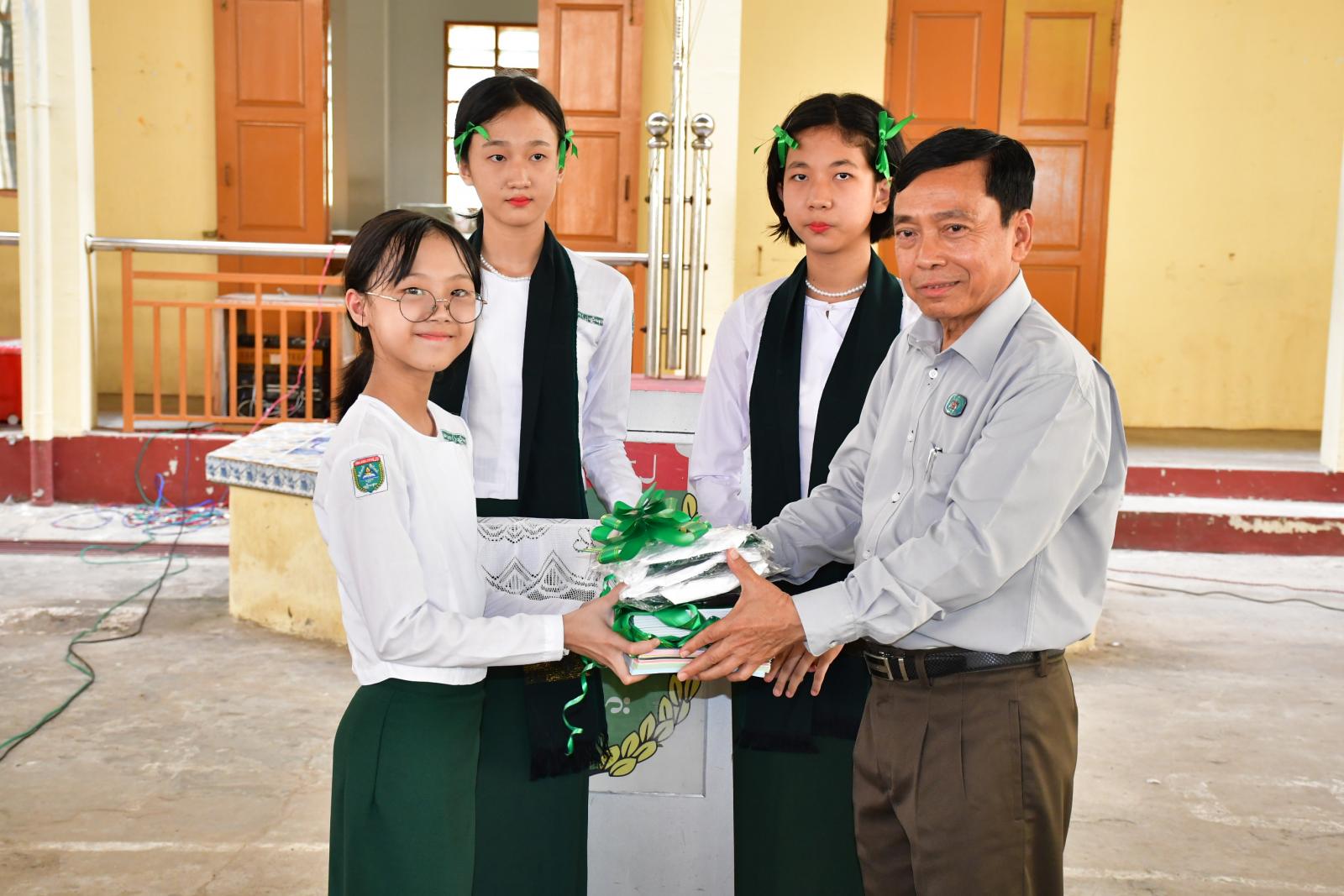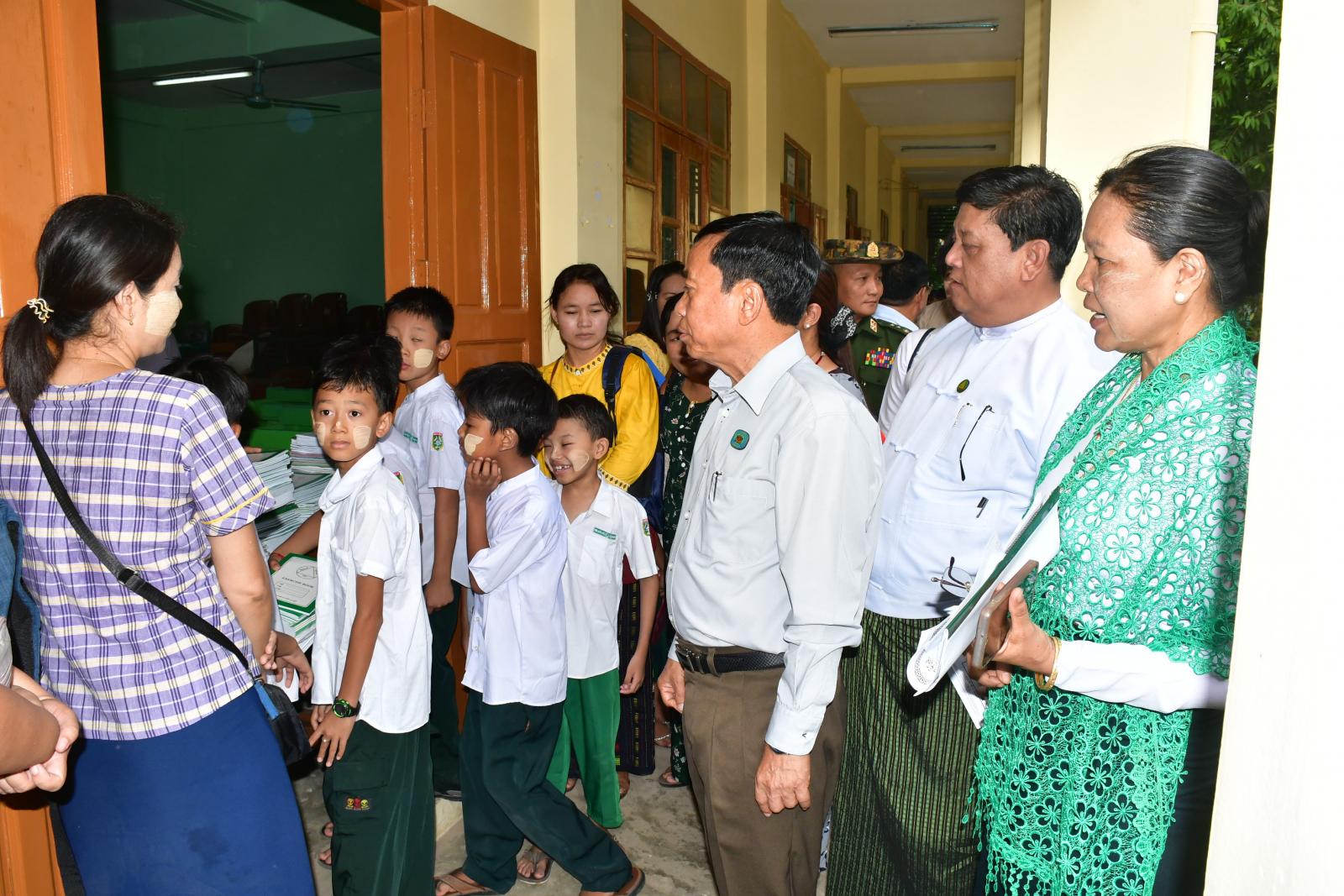 ထို့နောက် နေပြည်တော်ကောင်စီဥက္ကဋ္ဌ ဦးသန်းထွန်းဦးသည် ကျောင်းသား၊ ကျောင်းသူများအား အခမဲ့ပုံနှိပ်များ၊ ဗလာစာအုပ်၊ ဘောပင်၊ ခဲတံနှင့် ကျောင်းဝတ်စုံများ ပေးအပ်ရာ ကျောင်းသူ တစ်ဦးက လက်ခံရယူသည်။