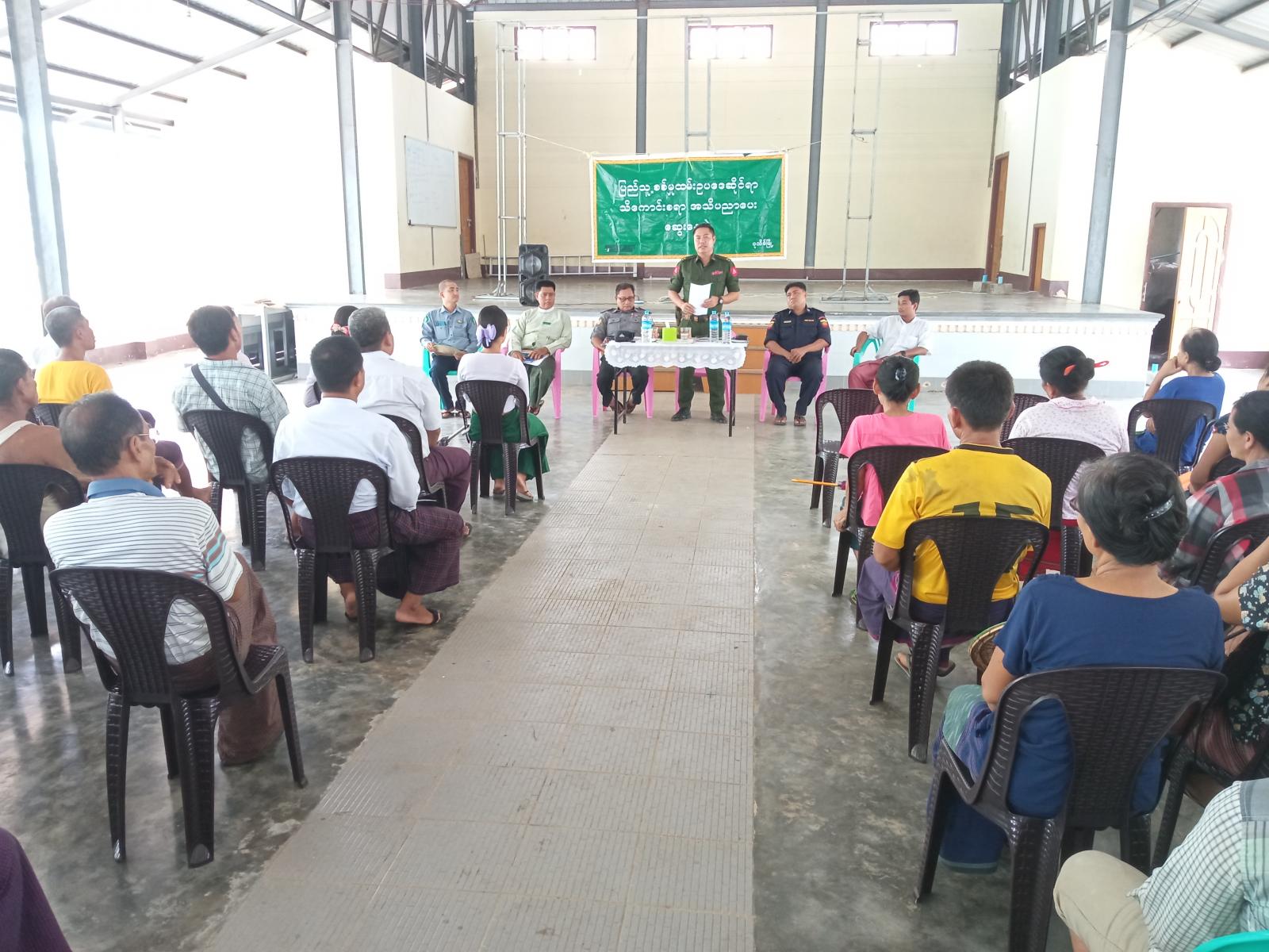 အခမ်းအနားတွင် မြို့နယ်စီမံအုပ်ချုပ်ရေးအဖွဲ့ အဖွဲ့ဝင်(၁)ဗိုလ်မှူးမင်းသန့်နိုင်နှင့် မြို့နယ်အဆင့်ဌာနဆိုင်ရာများ ပါဝင်သောအဖွဲ့မှ ဒေသခံပြည်သူများနှင့်တွေ့ဆုံမှာကြားရာ ရှေးဦးစွာပြည်သူ့စစ်မှုထမ်းဉပဒေဆိုင်ရာ သိကောင်းစရာများကို အသိပညာပေး ဆွေးနွေးပြောကြားခဲ့သည်။