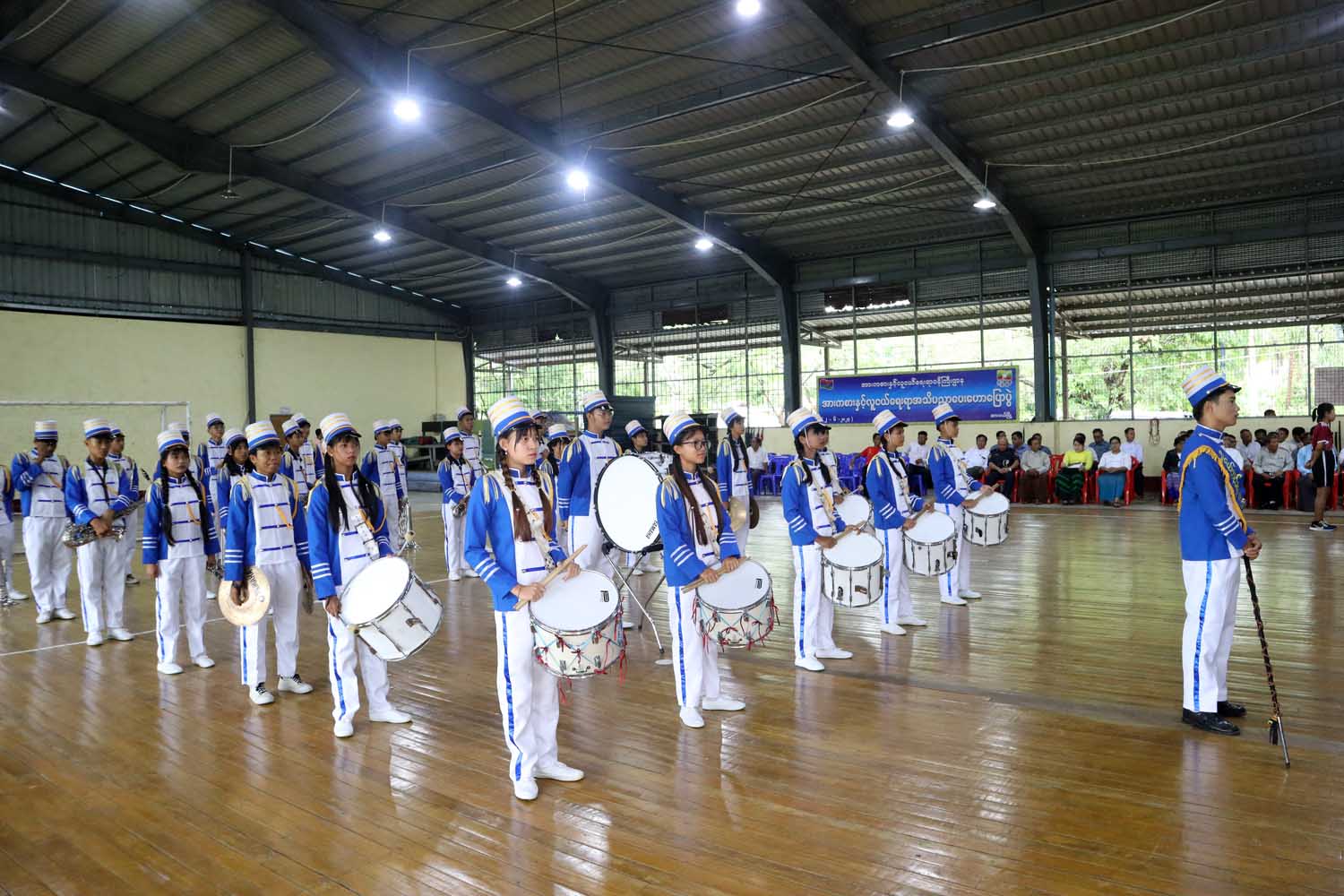 ရှေးဦးစွာ ပြိုင်ပွဲဝင်အသင်းများက ကွင်းအတွင်းနေရာယူပြီး တိုင်းဒေသကြီး၀န်ကြီးချုပ်အား စစ်ရေးပြမှူးမှ ဦးဆောင်၍ ပြိုင်ပွဲဝင်အသင်းများက အလေးပြုပြီးတန်းအပ်သည်။